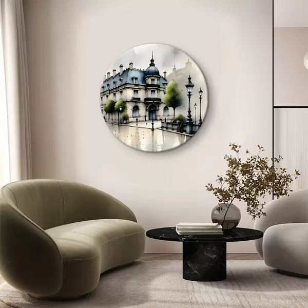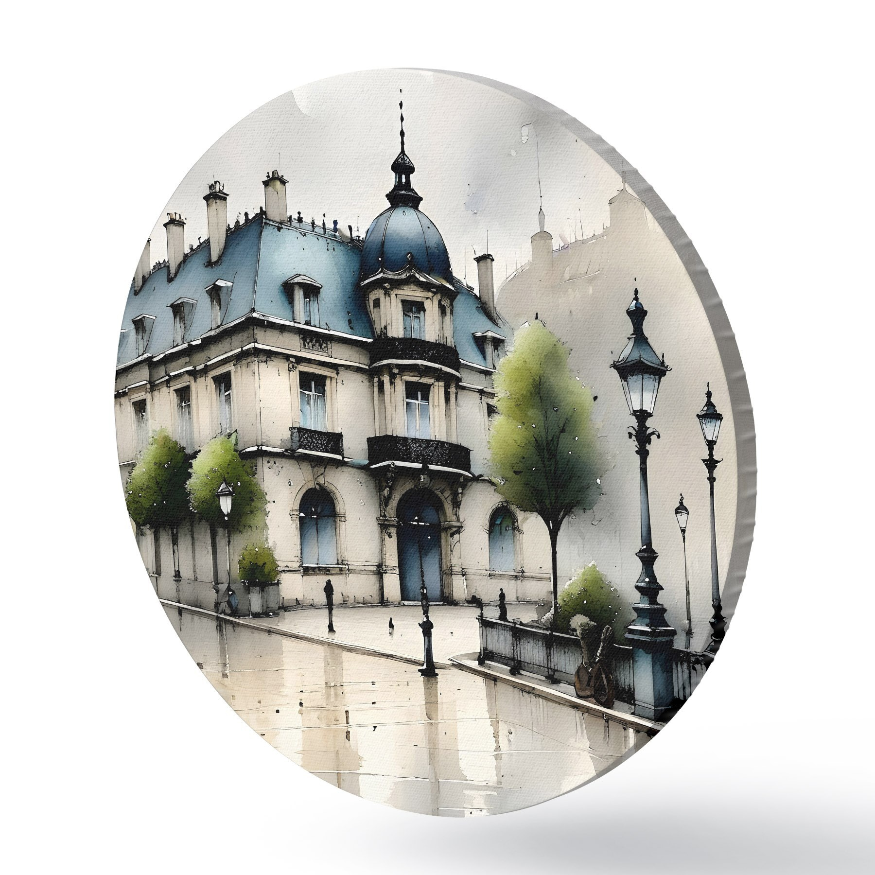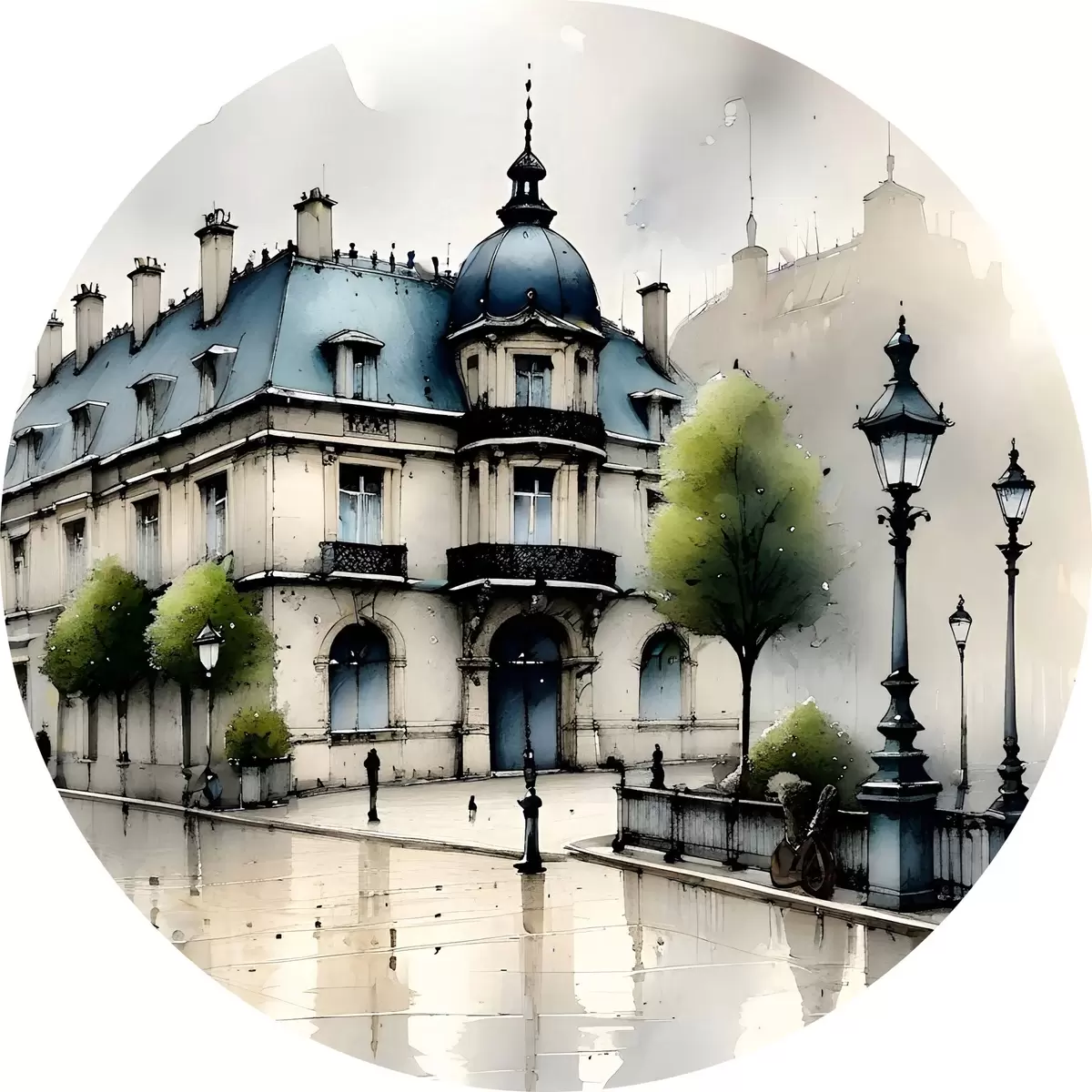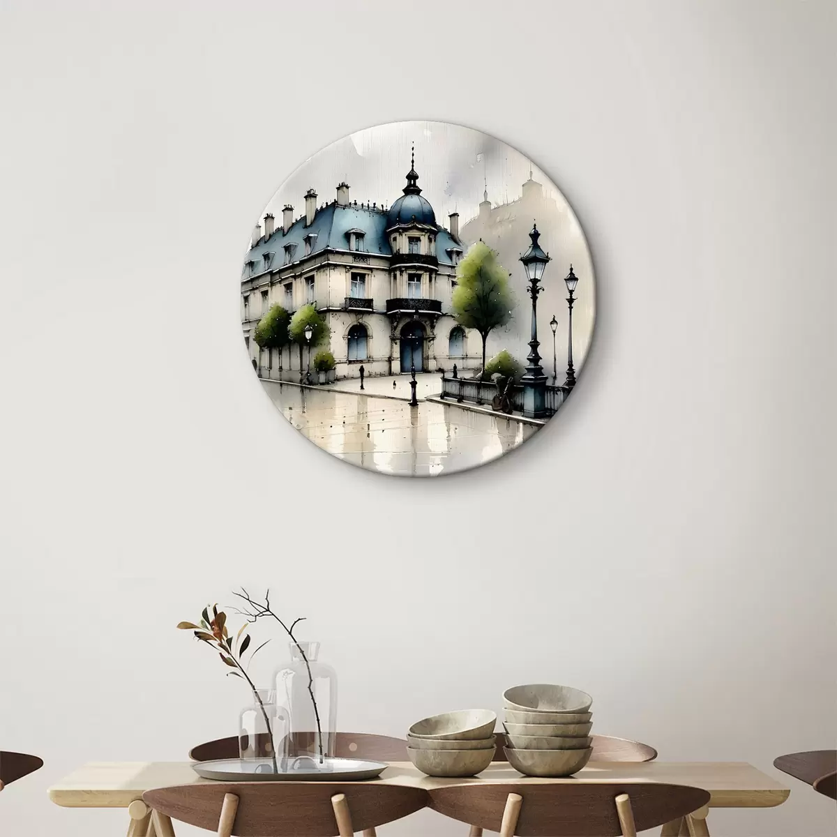 Runde Gemälde Ein großartiges Gebäude Aquarell Kunst umgeben von Laternen und Bäumen, an einem regnerischen Tag r39391