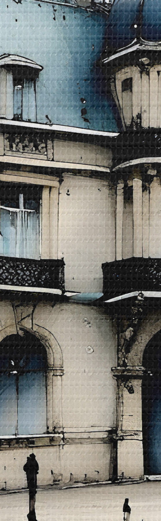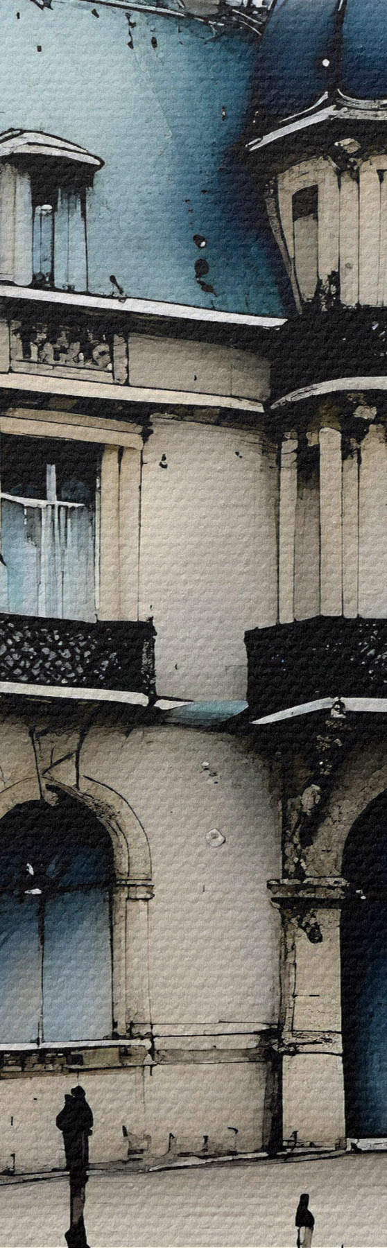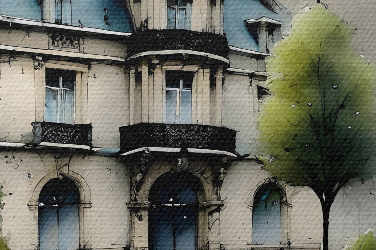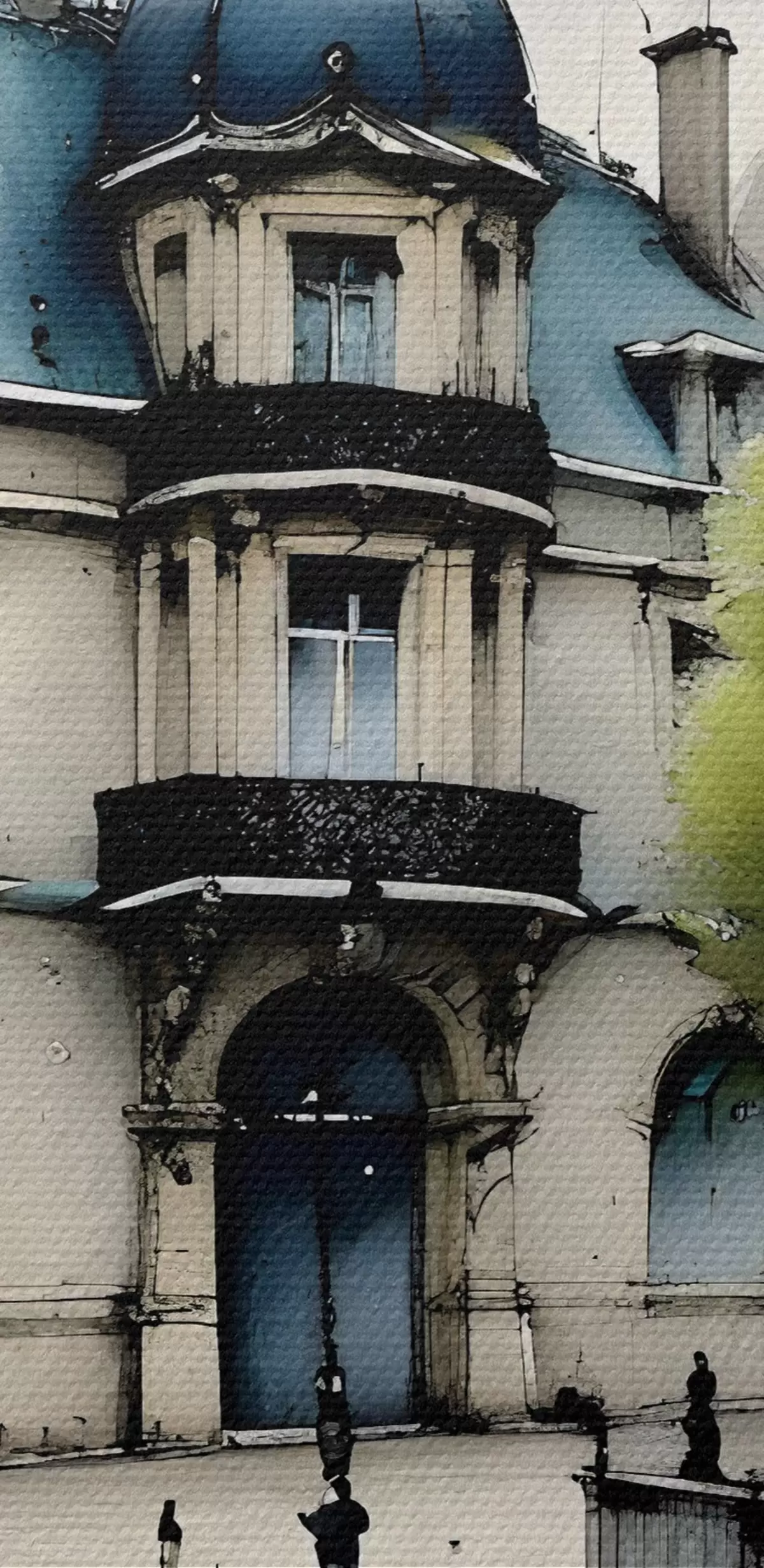 Bild Ein großartiges Gebäude Aquarell Kunst umgeben von Laternen und Bäumen, an einem regnerischen Tag Nr r39391