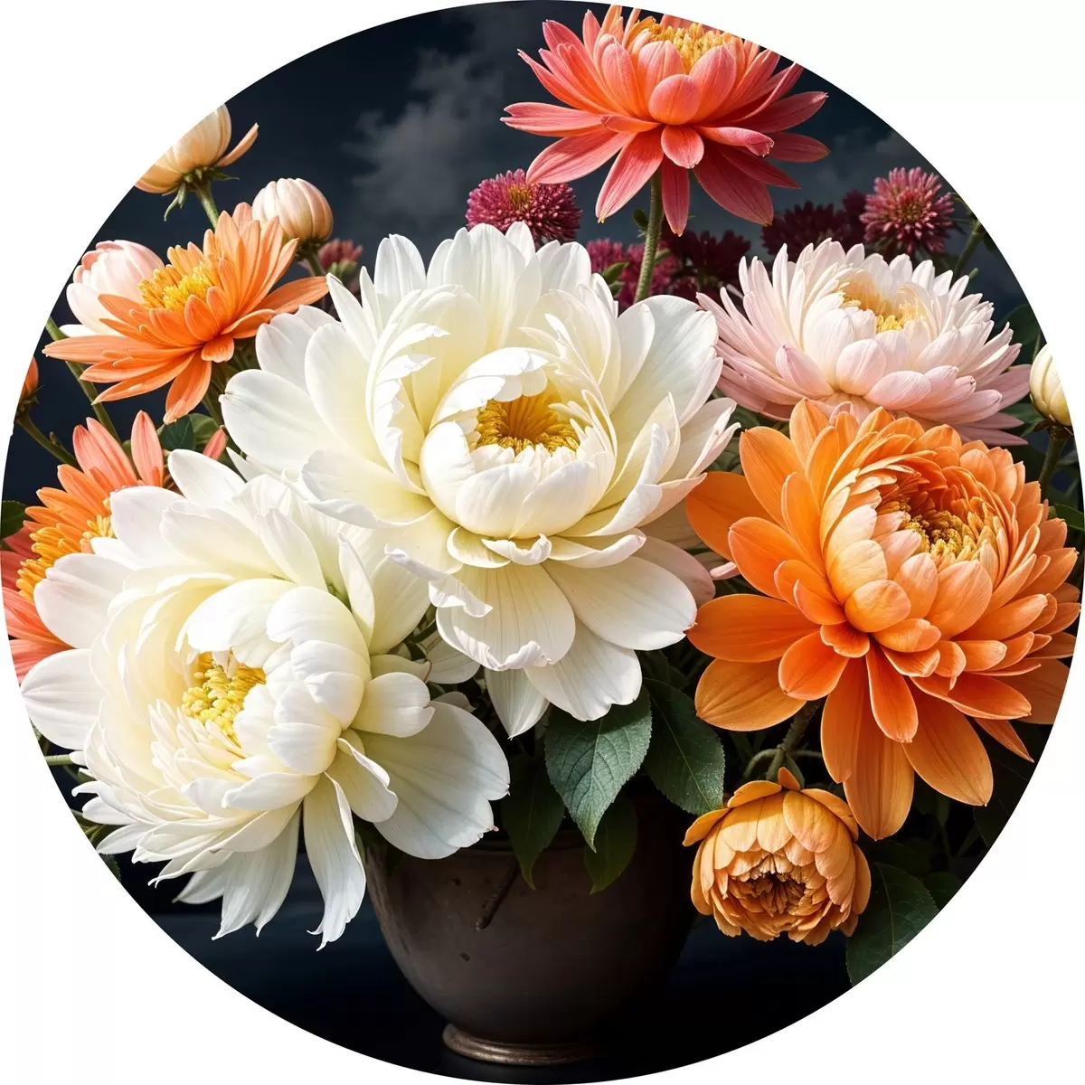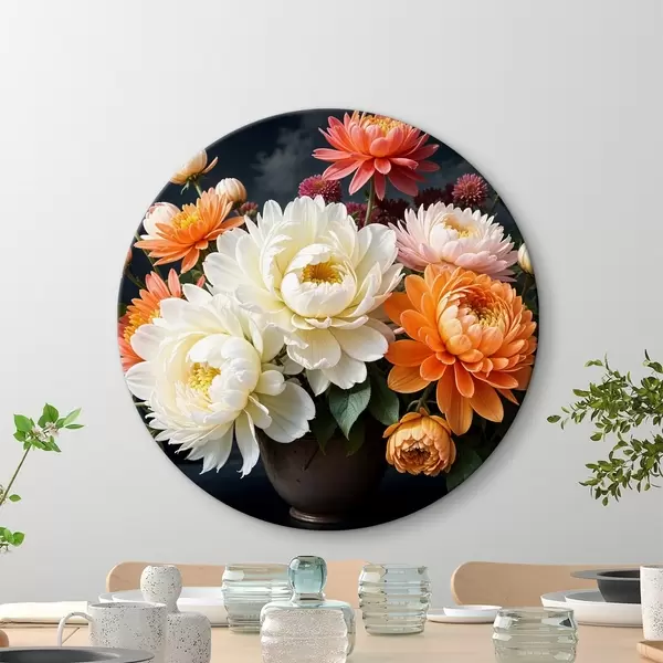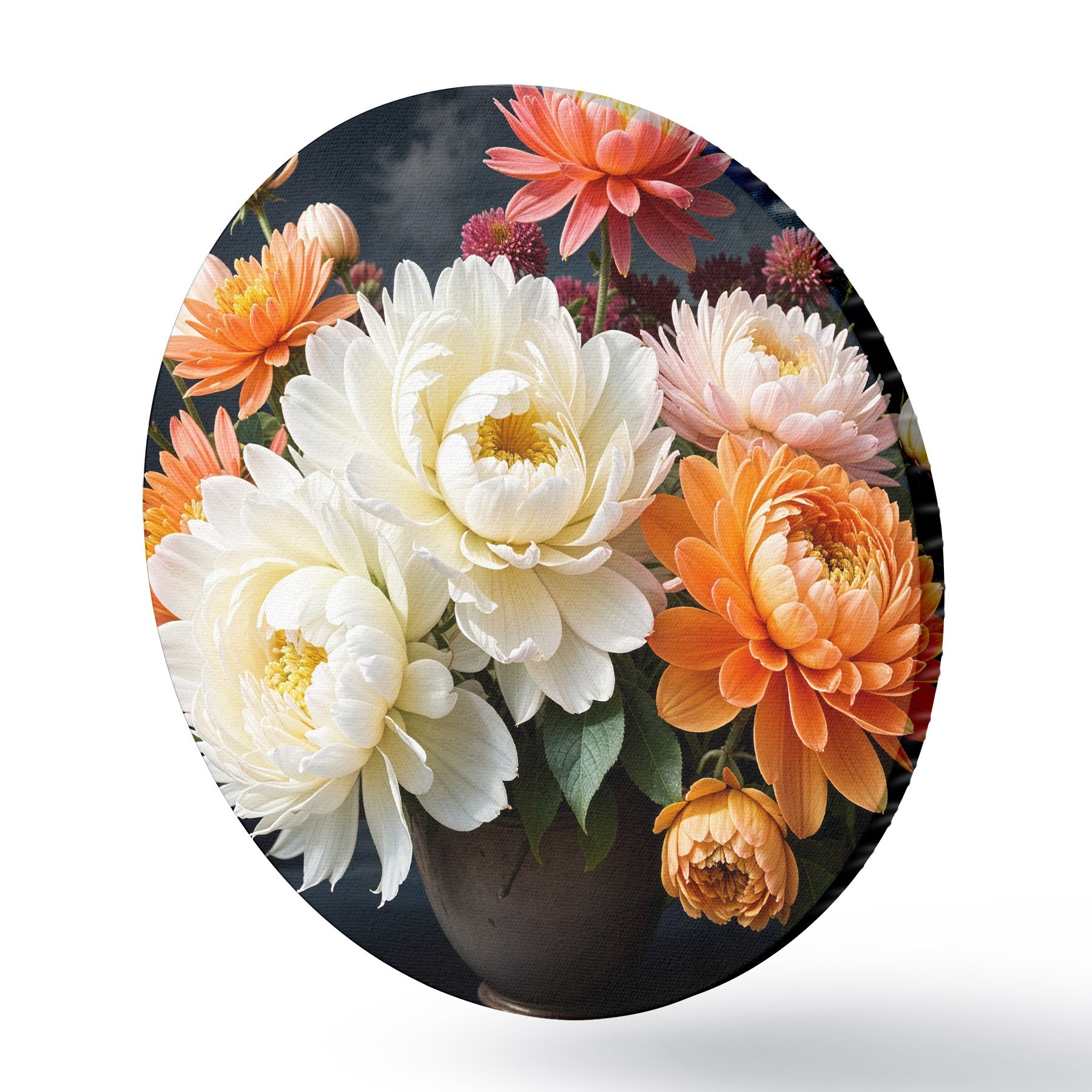 Runde Gemälde Ein Strauß leuchtender Dahlienblüten in verschiedenen Farben vor dunklem Hintergrund r39399