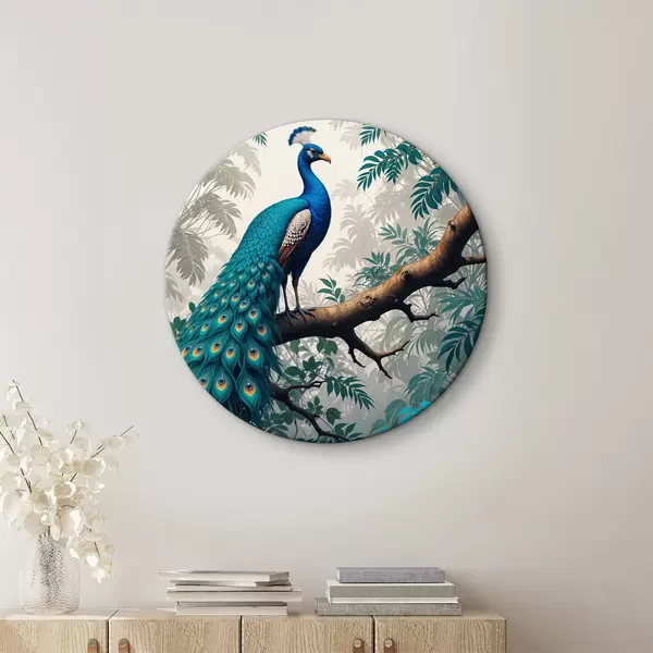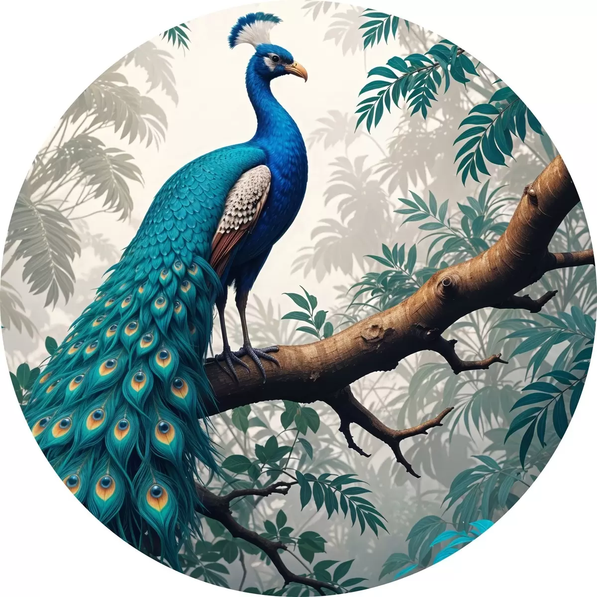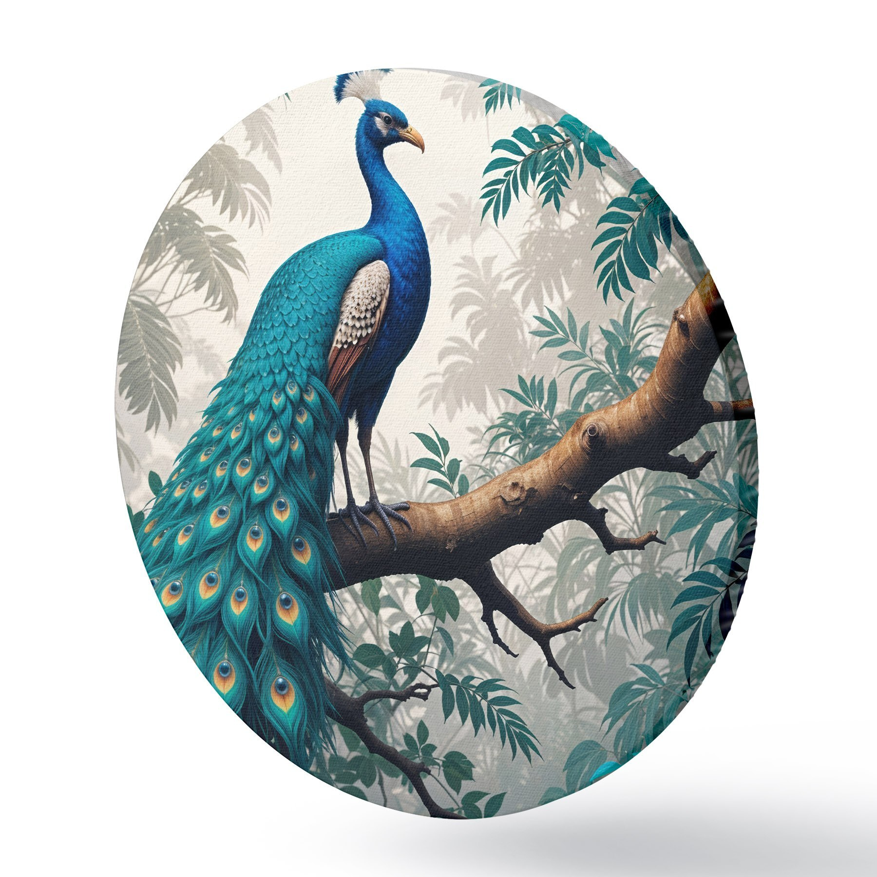 Runde Gemälde Ein leuchtend blauer Pfau, der auf einem Ast in einem üppigen tropischen Wald thront r39401
