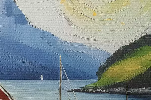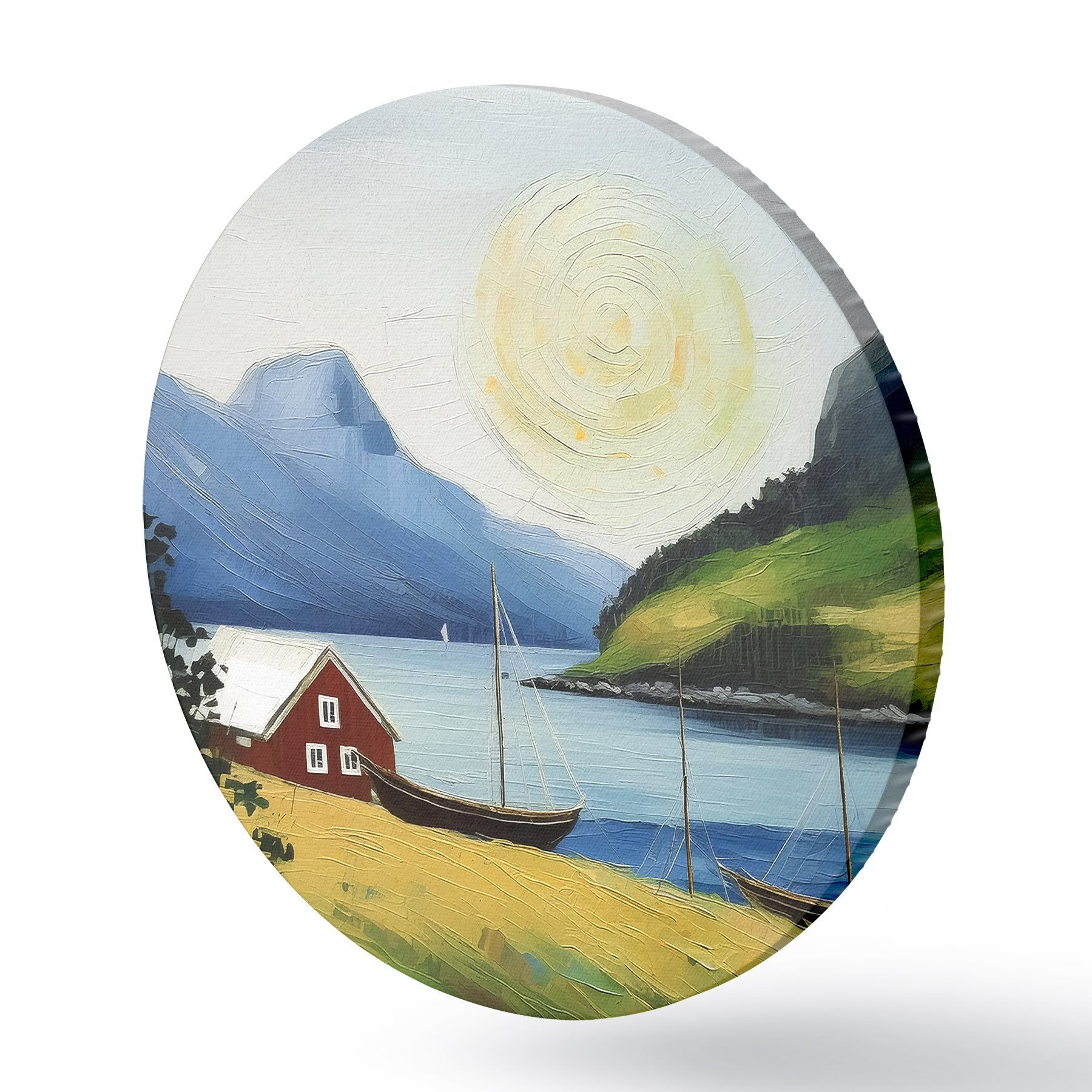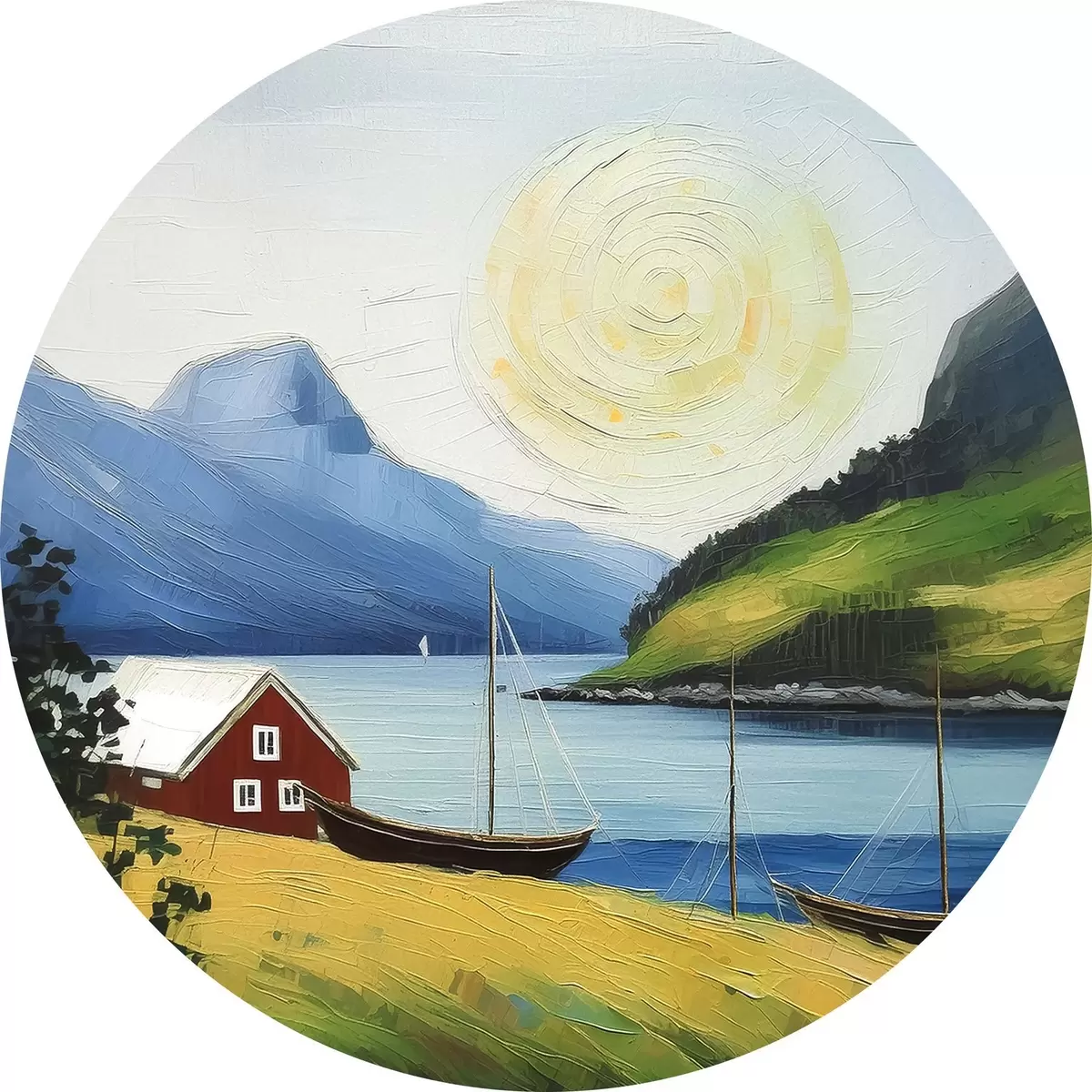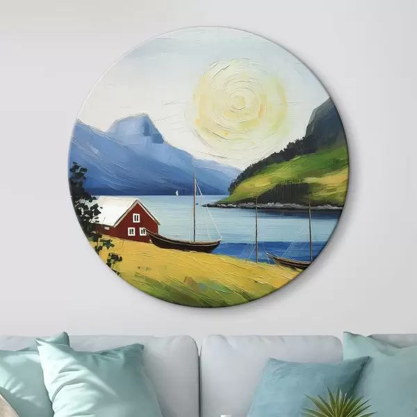Runde Gemälde Nordischer Sommer, kleines Haus an der Meeresküste, Sonne am blauen Himmel, Berge r39423