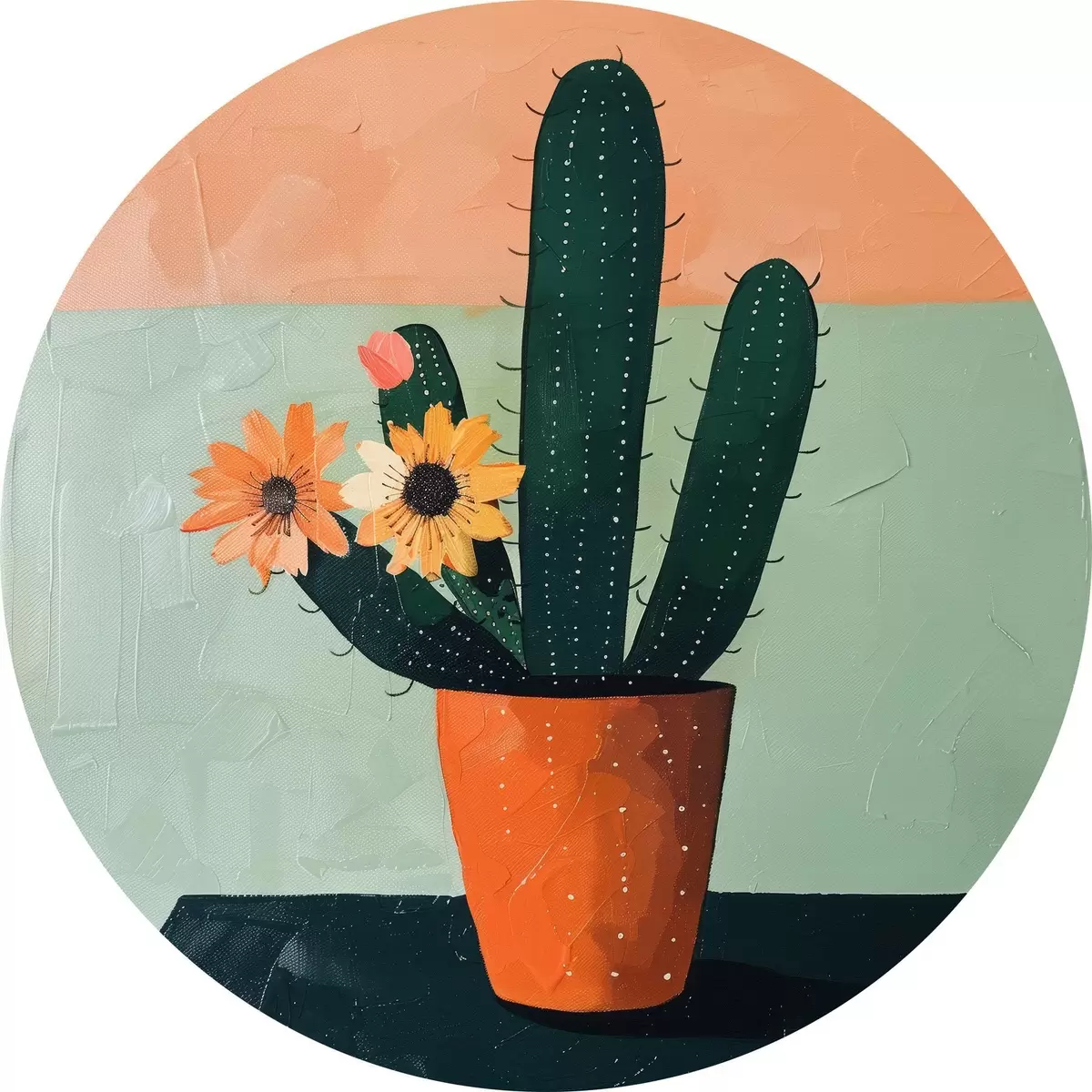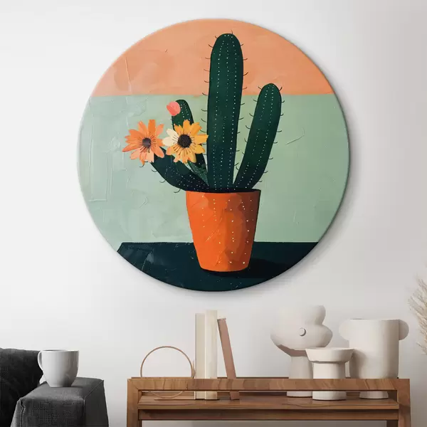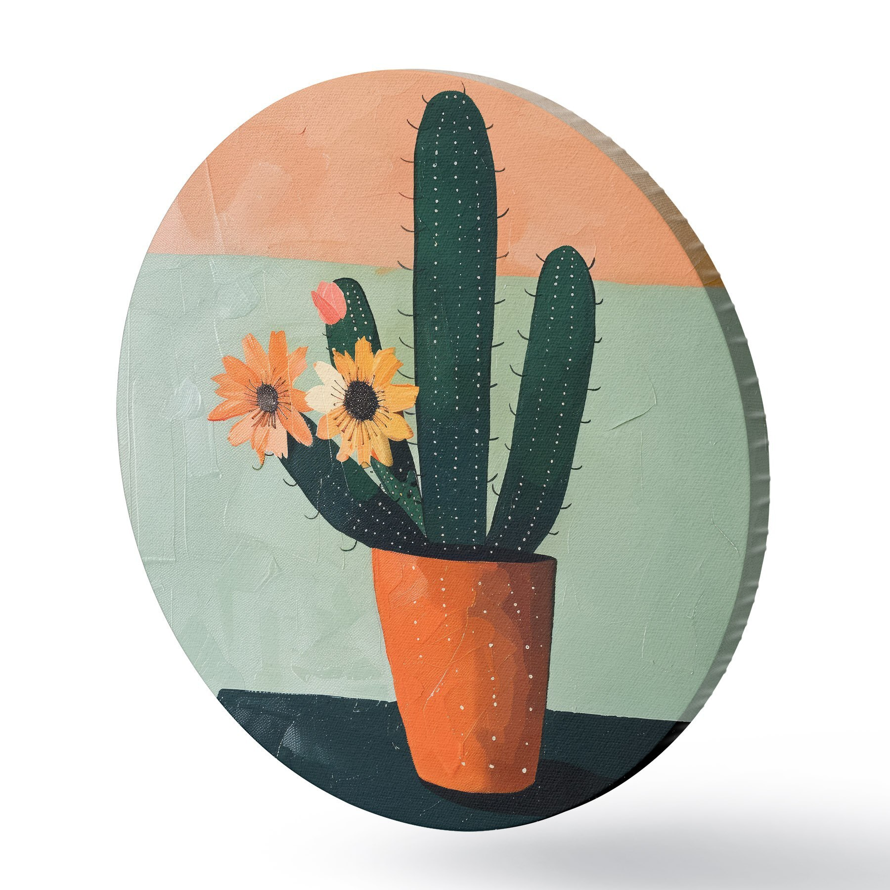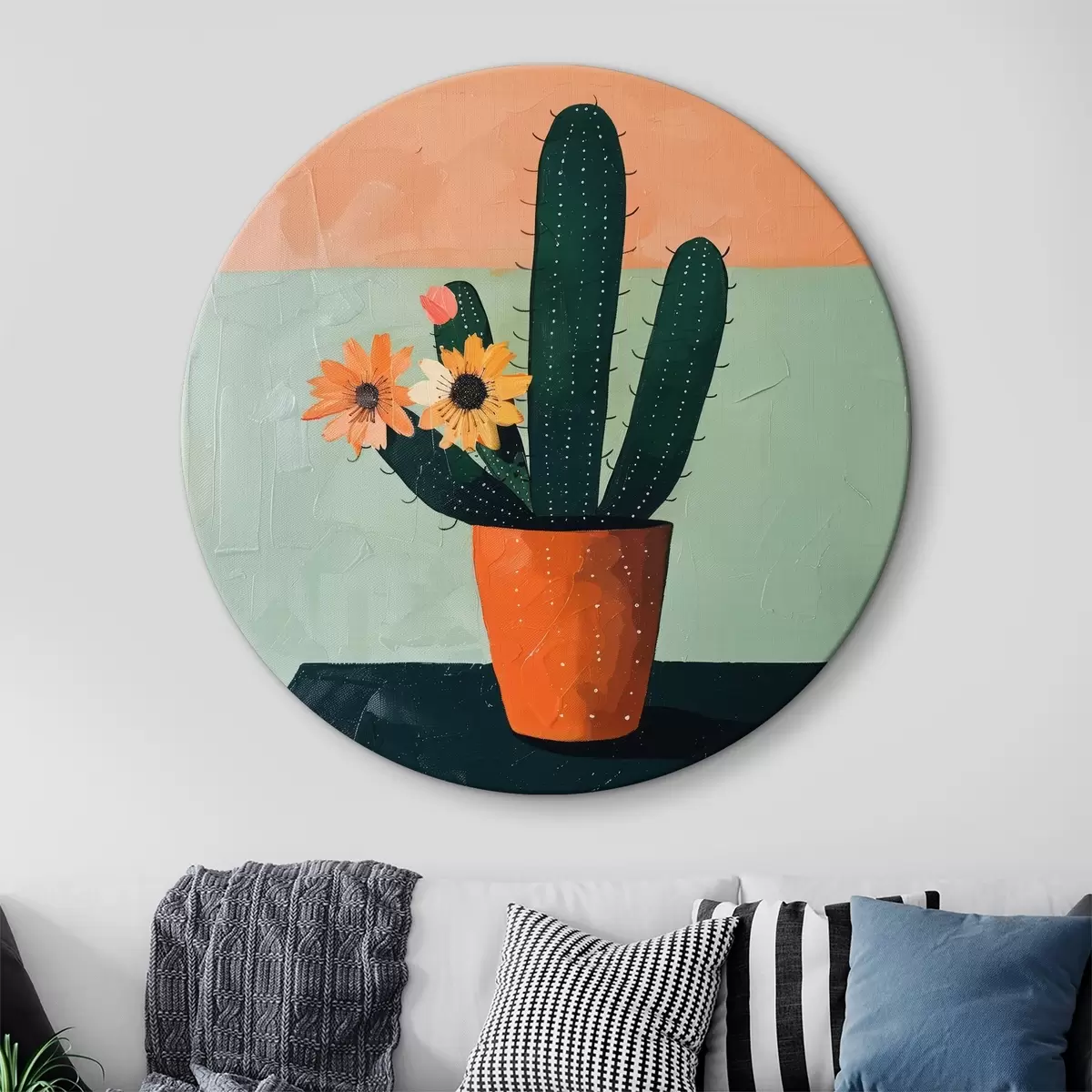 Runde Gemälde Ein minimalistisches Gemälde eines einzelnen Kaktus mit Blüten in einer kräftigen Farbpalette. r39452