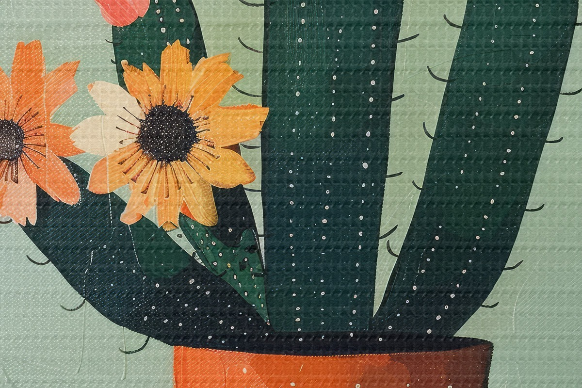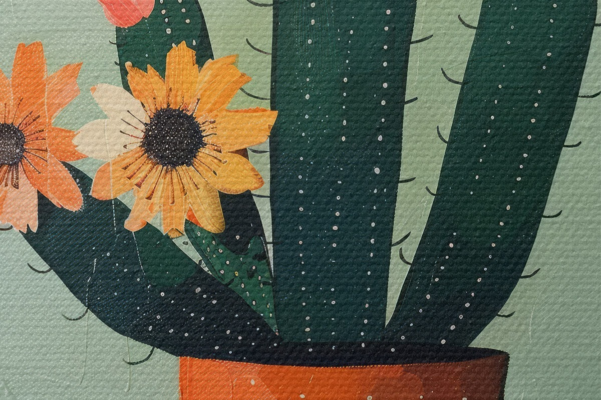 Bild Ein minimalistisches Gemälde eines einzelnen Kaktus mit Blüten in einer kräftigen Farbpalette. Nr r39452