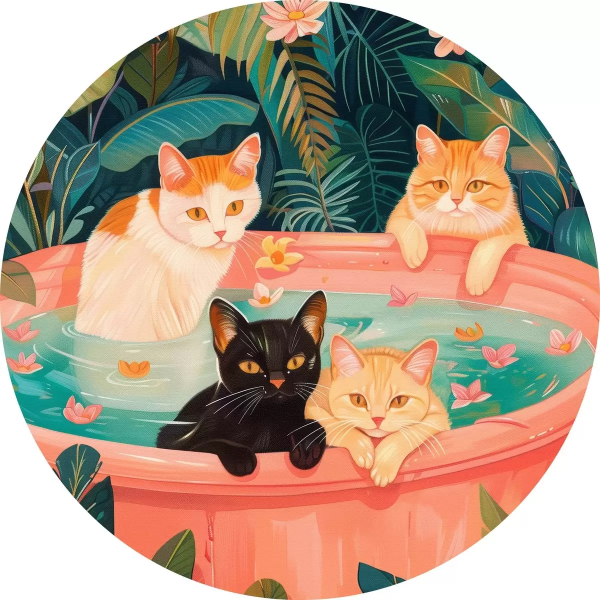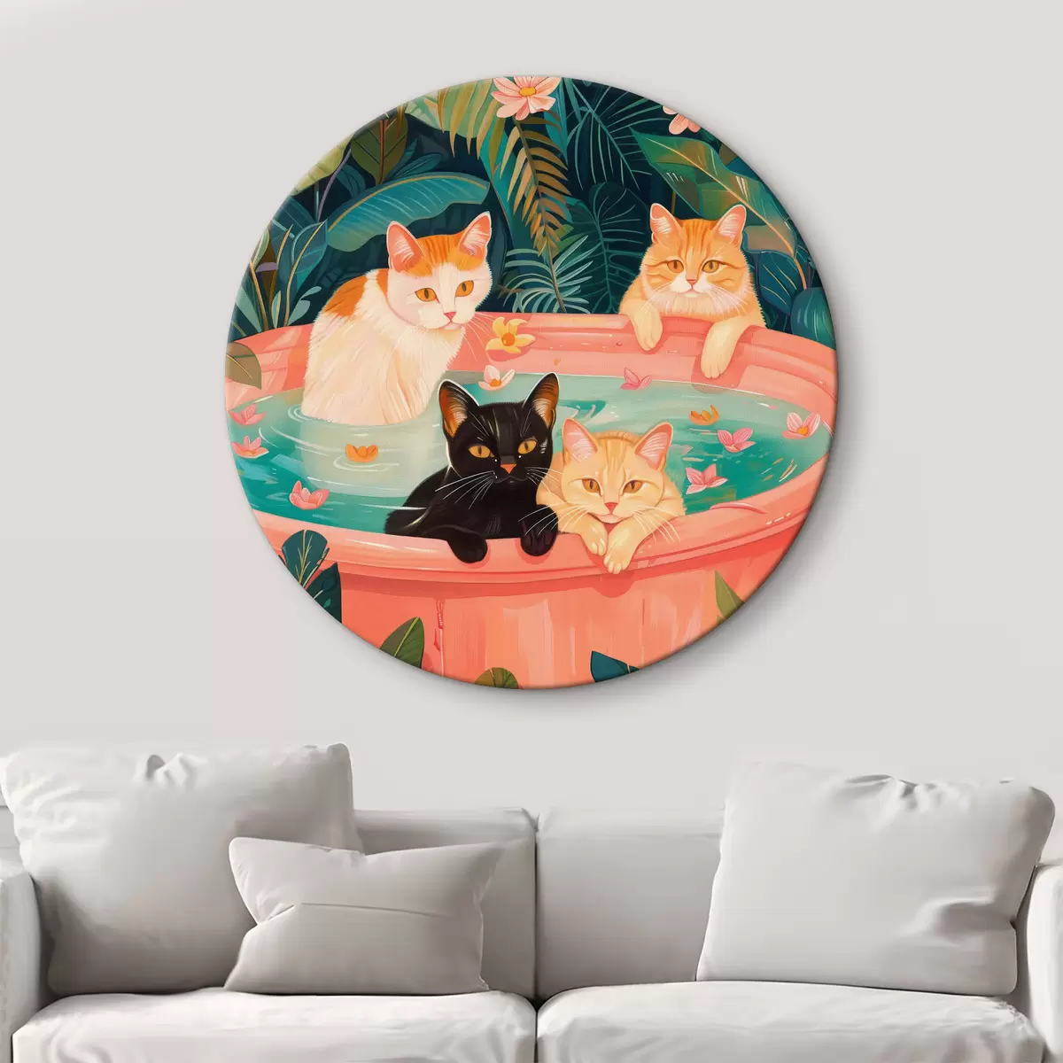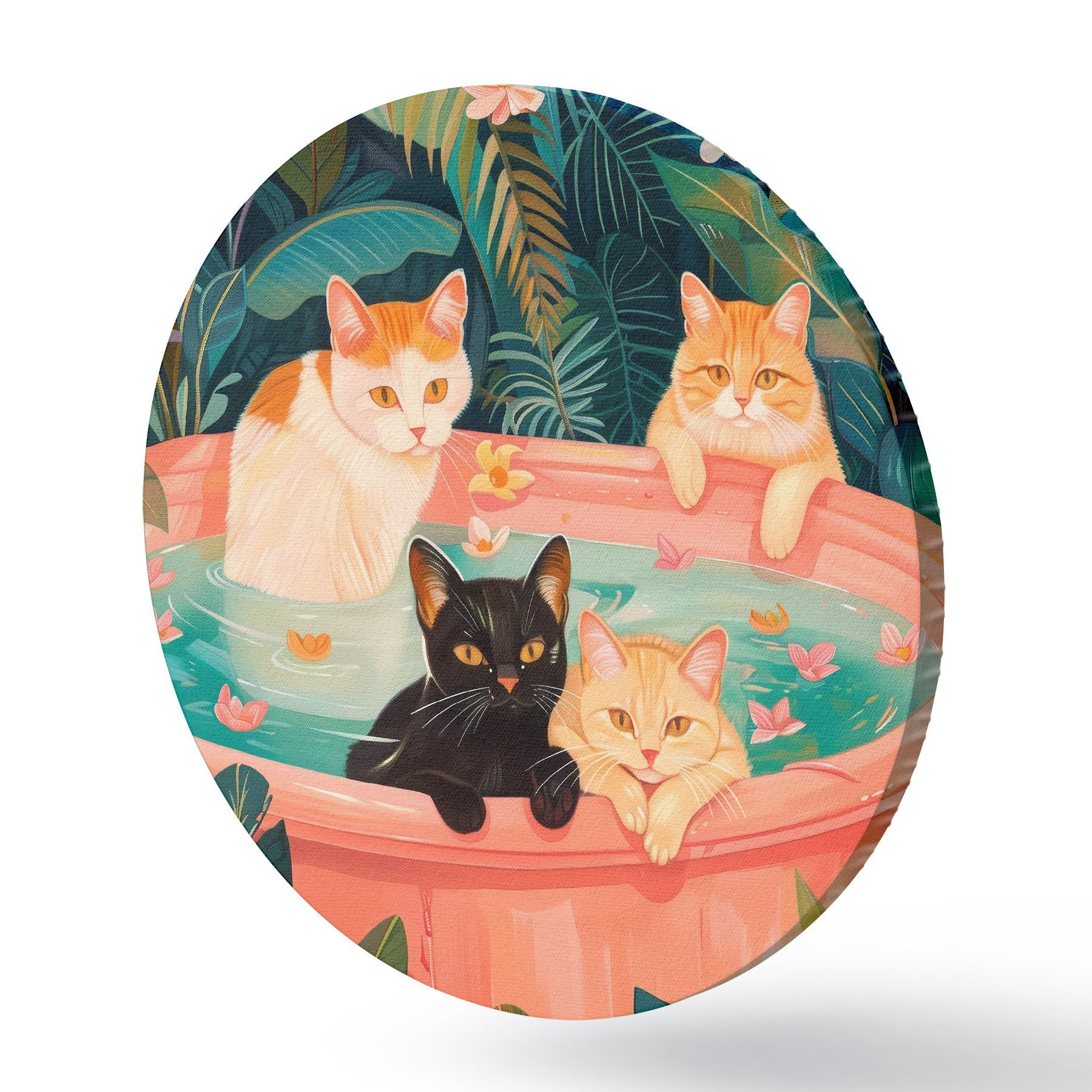 Runde Gemälde Katzen in einem rosa Bad mit grünen Blättern, Dschungelatmosphäre r39465