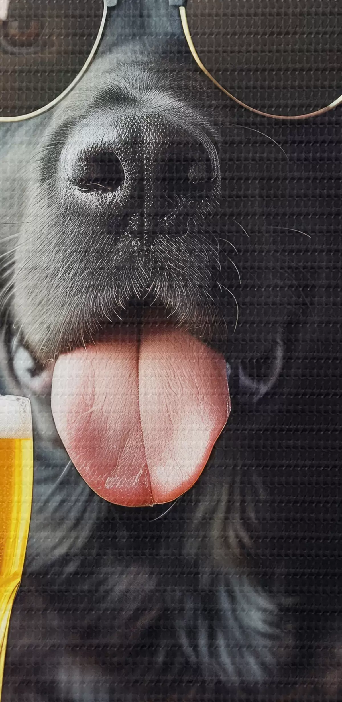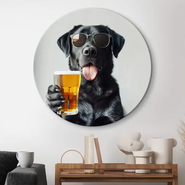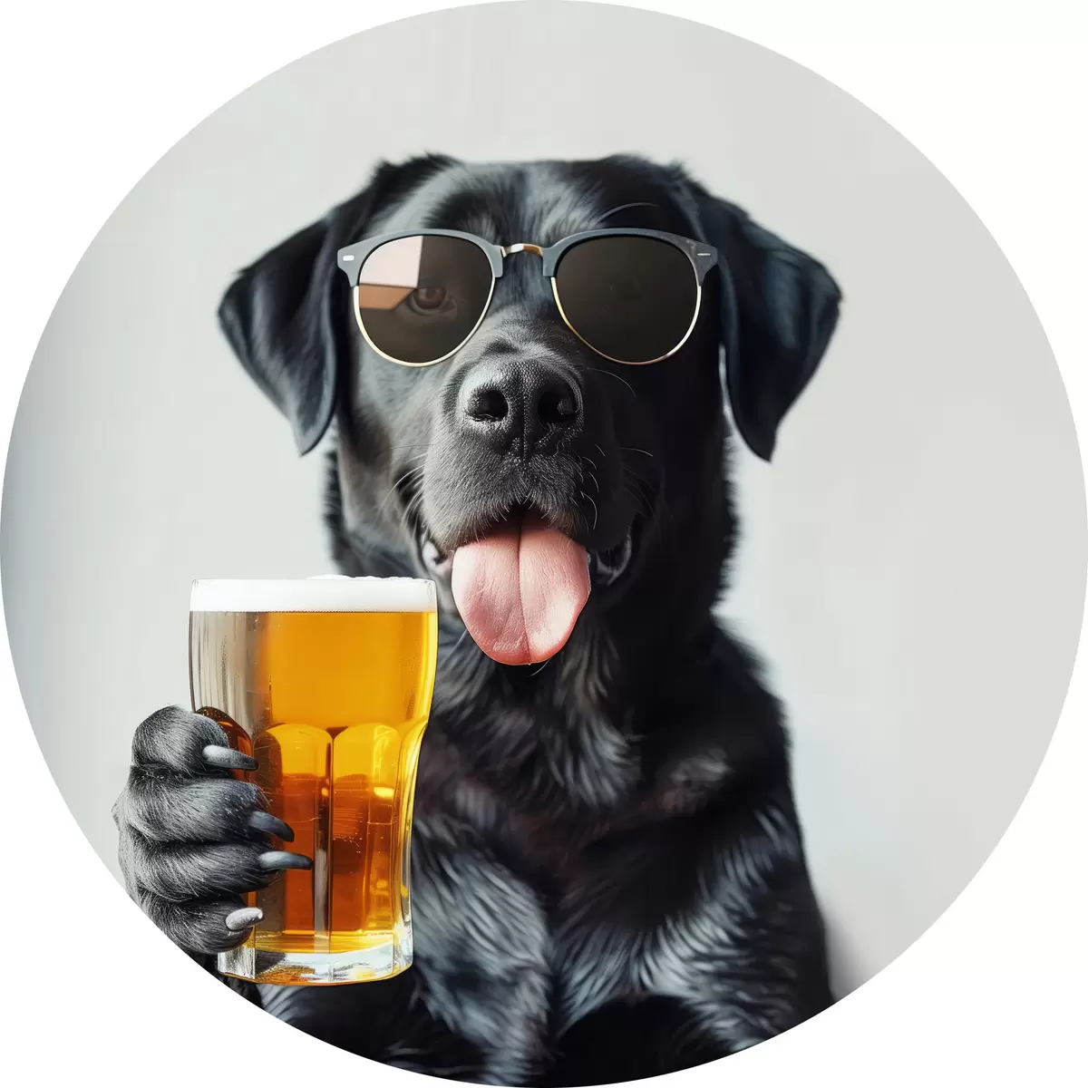 Runde Gemälde Porträt eines schwarzen Labradors mit Sonnenbrille und einem halben Liter Bier, der direkt in die Kamera blickt r39470