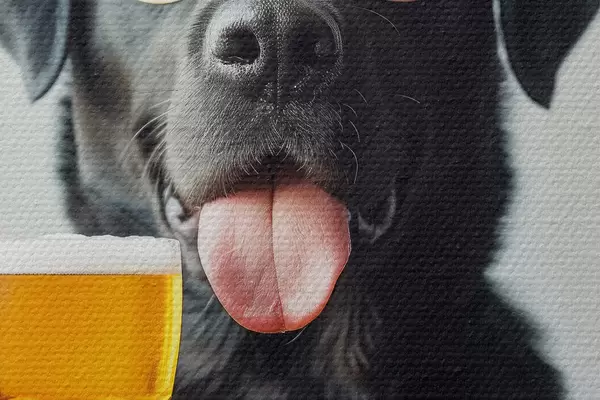 Runde Gemälde Porträt eines schwarzen Labradors mit Sonnenbrille und einem halben Liter Bier, der direkt in die Kamera blickt r39470