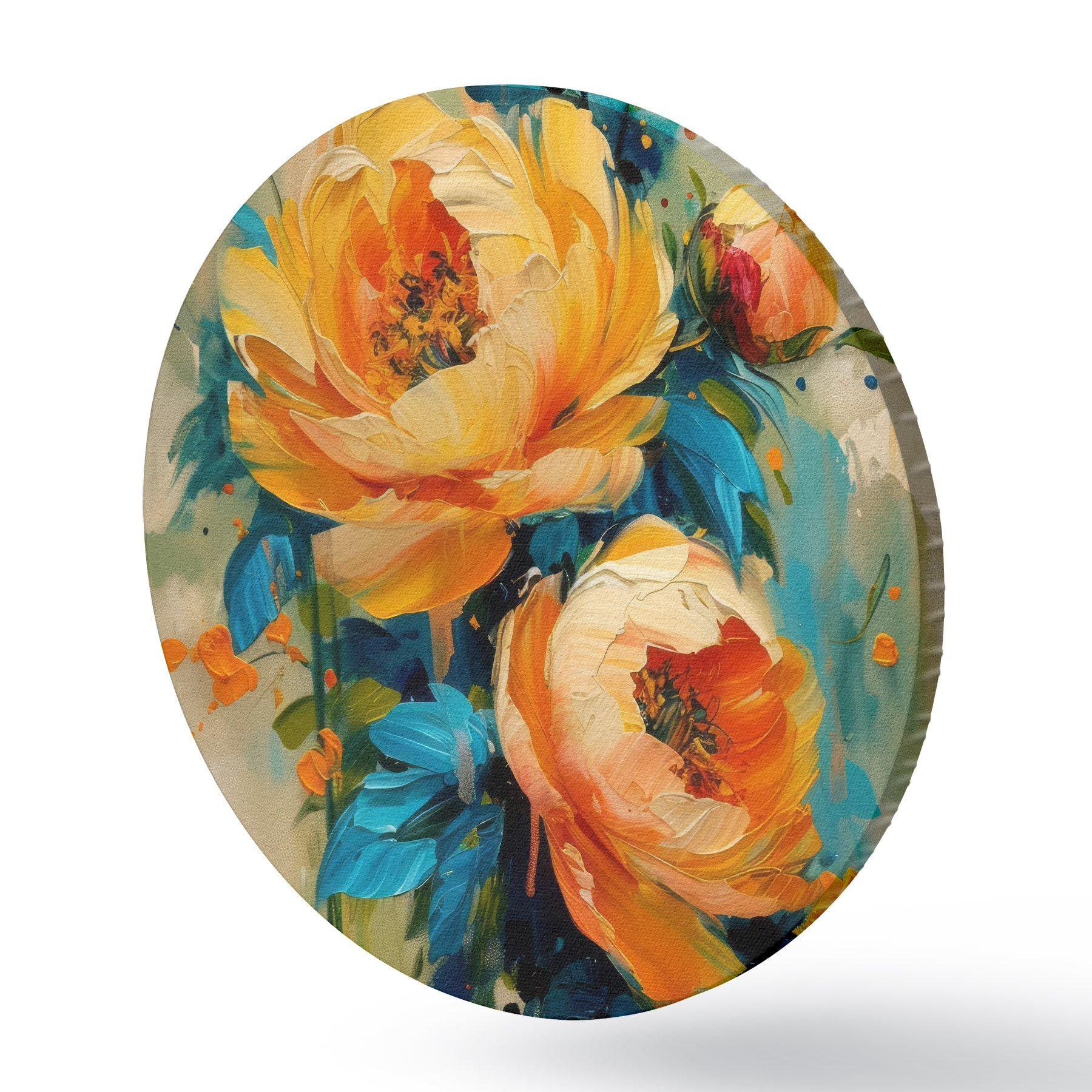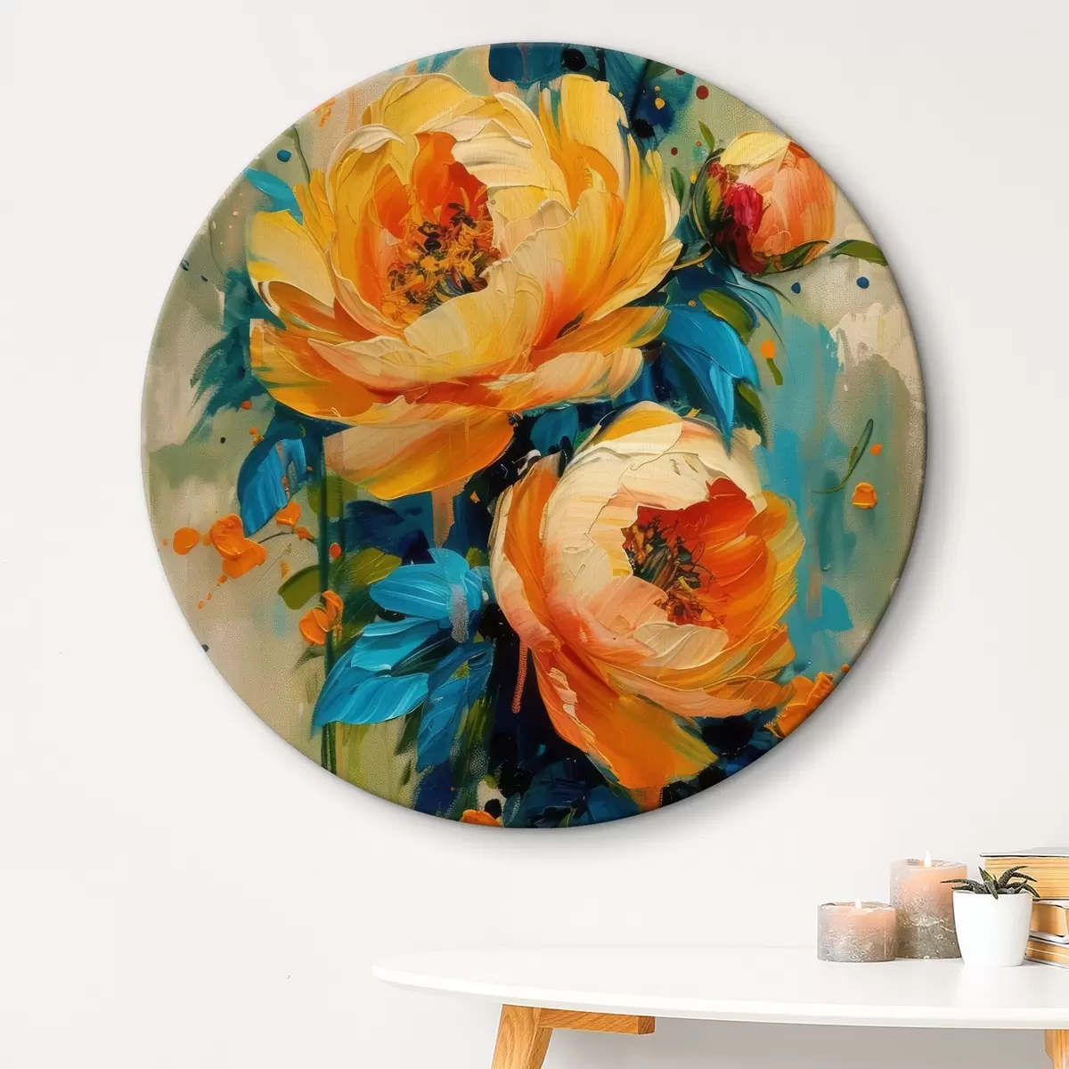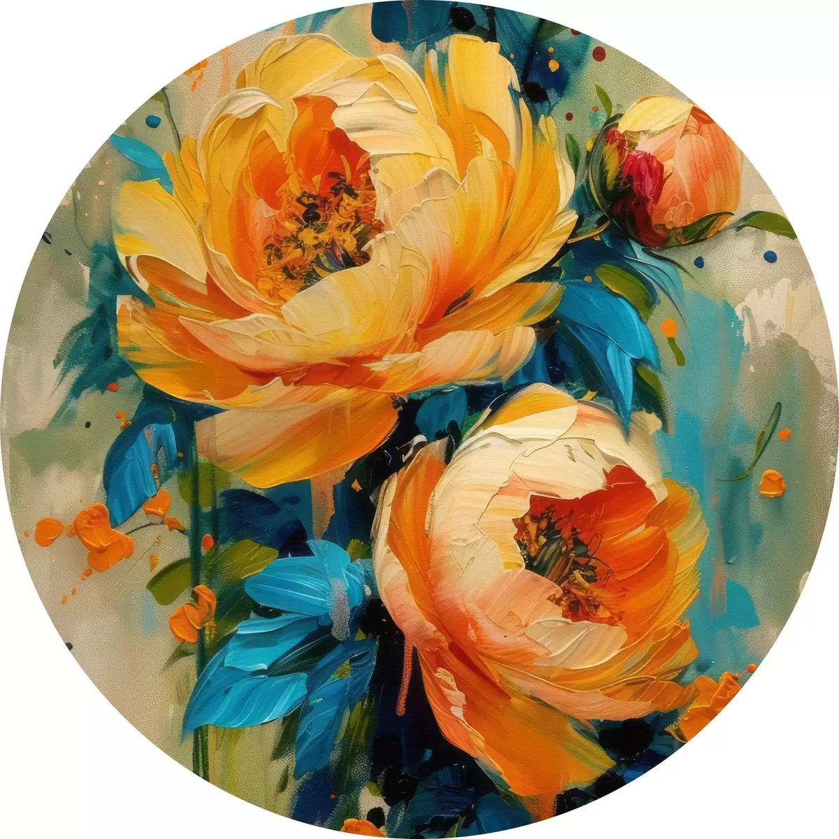 Runde Gemälde Abstrakte Malerei in Beige-, Gelb-, Blau- und Salbeigrüntönen mit orangefarbenen Spritzern, lebendige Pfingstrosen im Sommer r39472