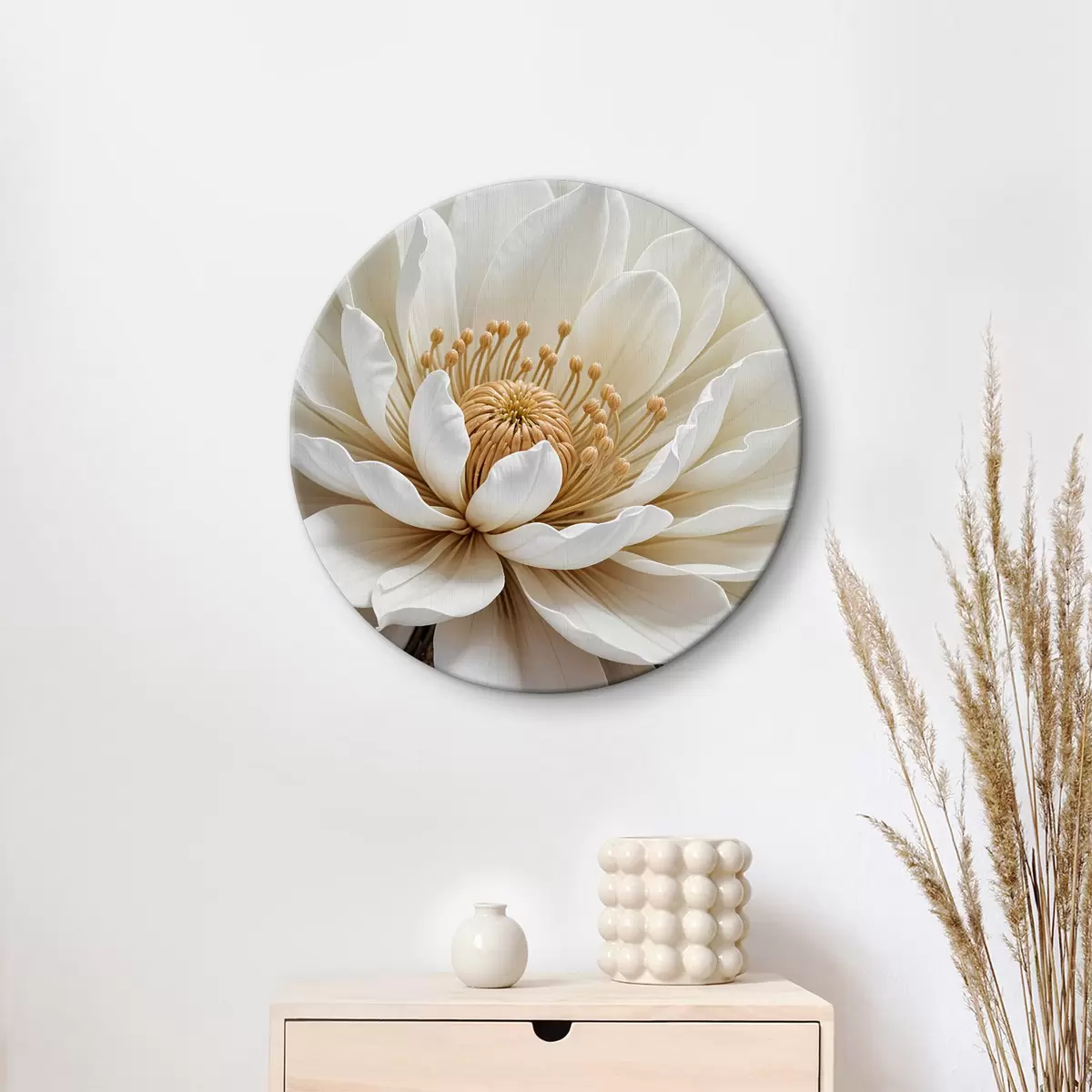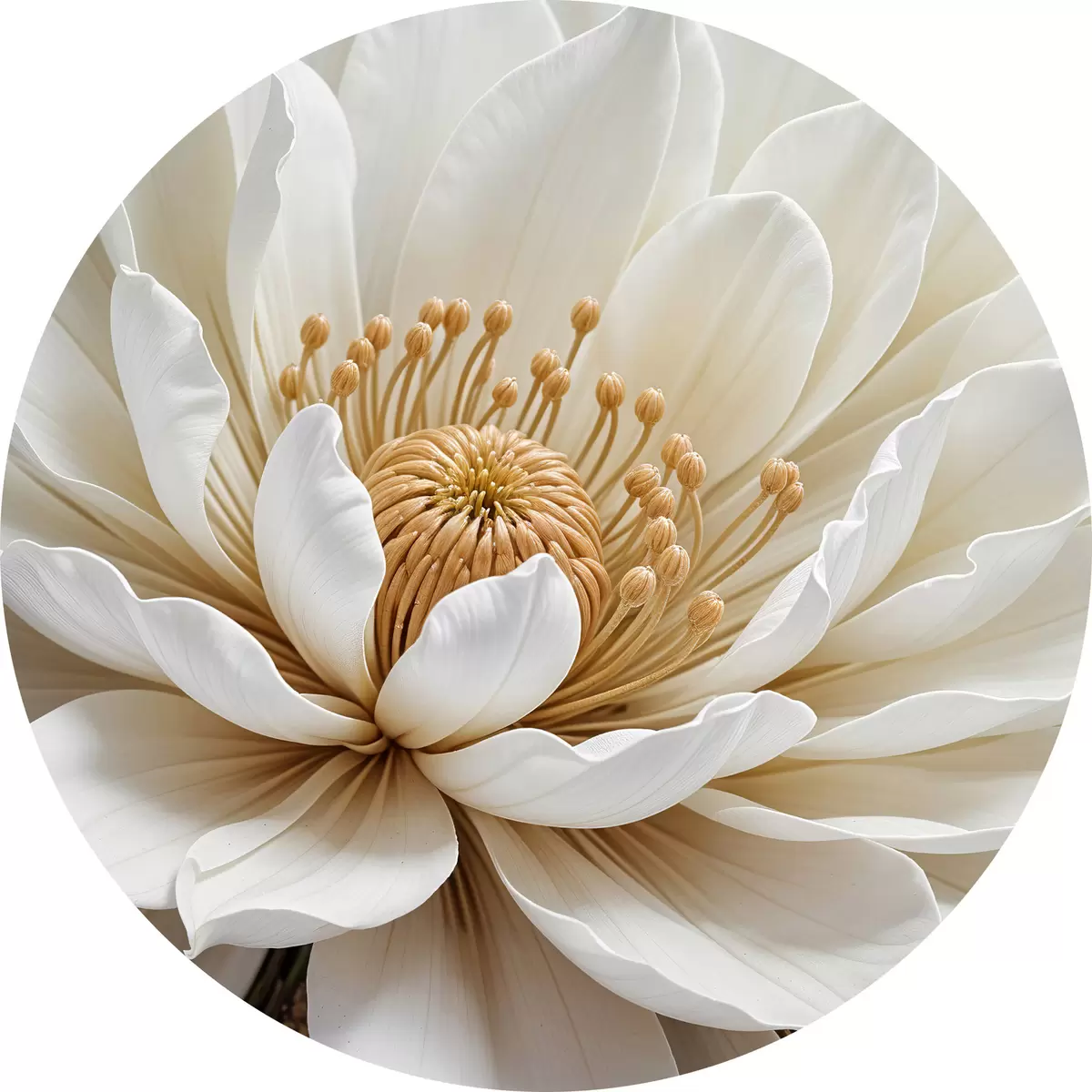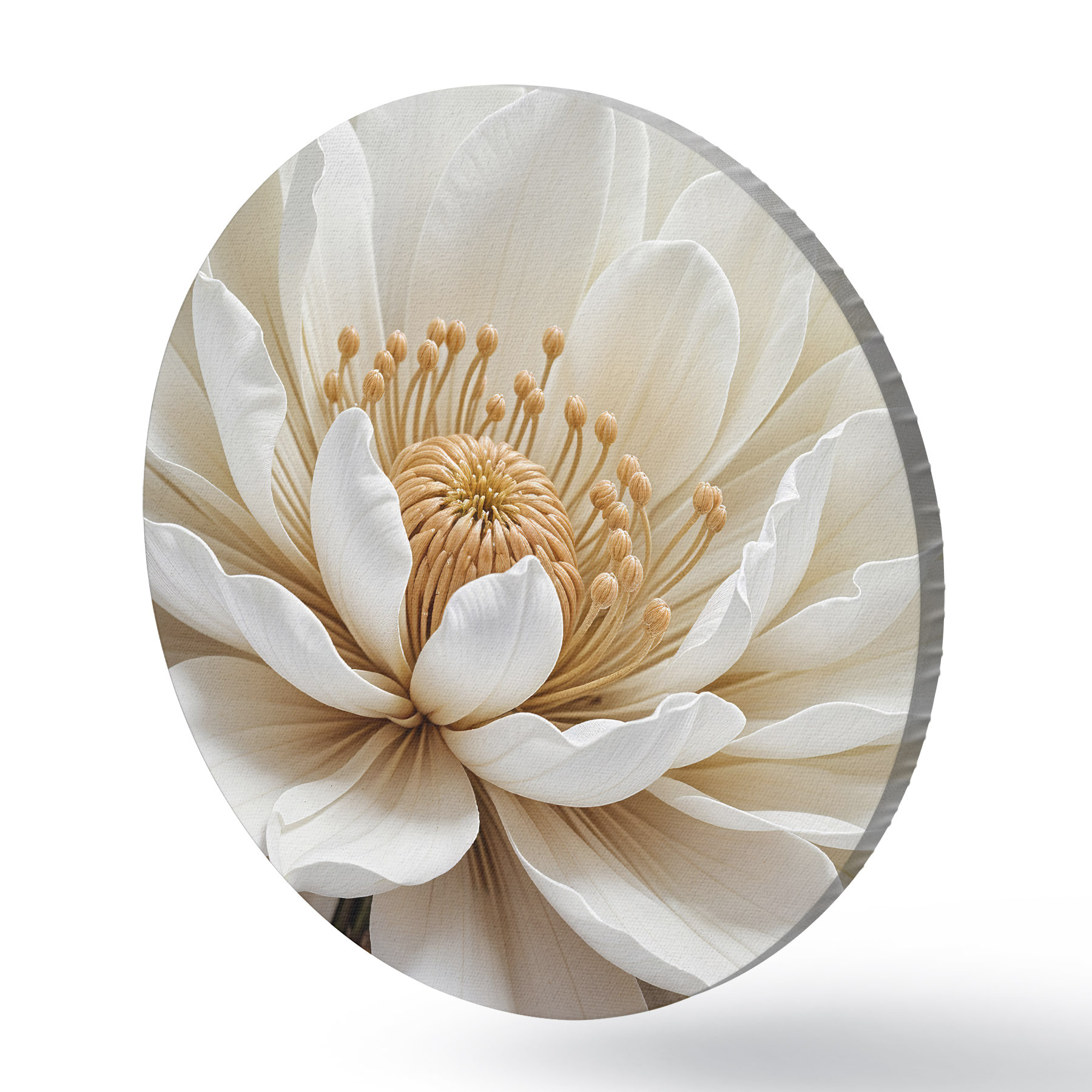 Runde Gemälde Eine Nahaufnahme einer großen, weißen Dahlienblüte mit zarten Blütenblättern und einer leuchtend gelben Mitte r39508