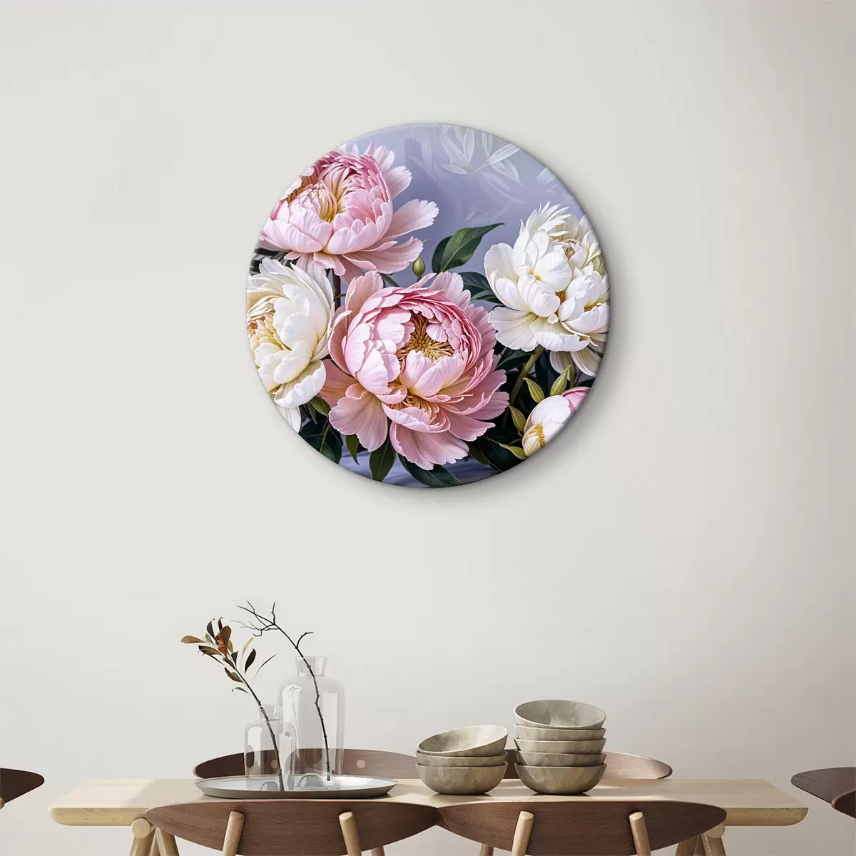 Runde Gemälde Ein Strauß großer, üppiger rosa und weißer Pfingstrosenblüten mit grünen Blättern vor einem weichen, unscharfen Hintergrund r39514