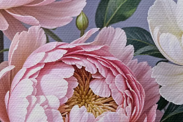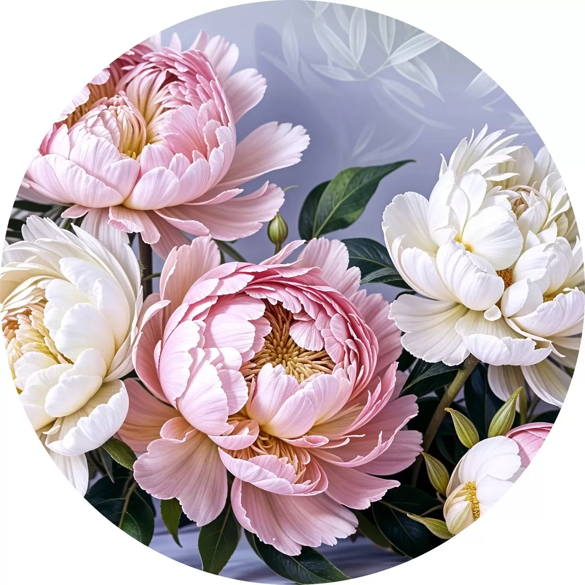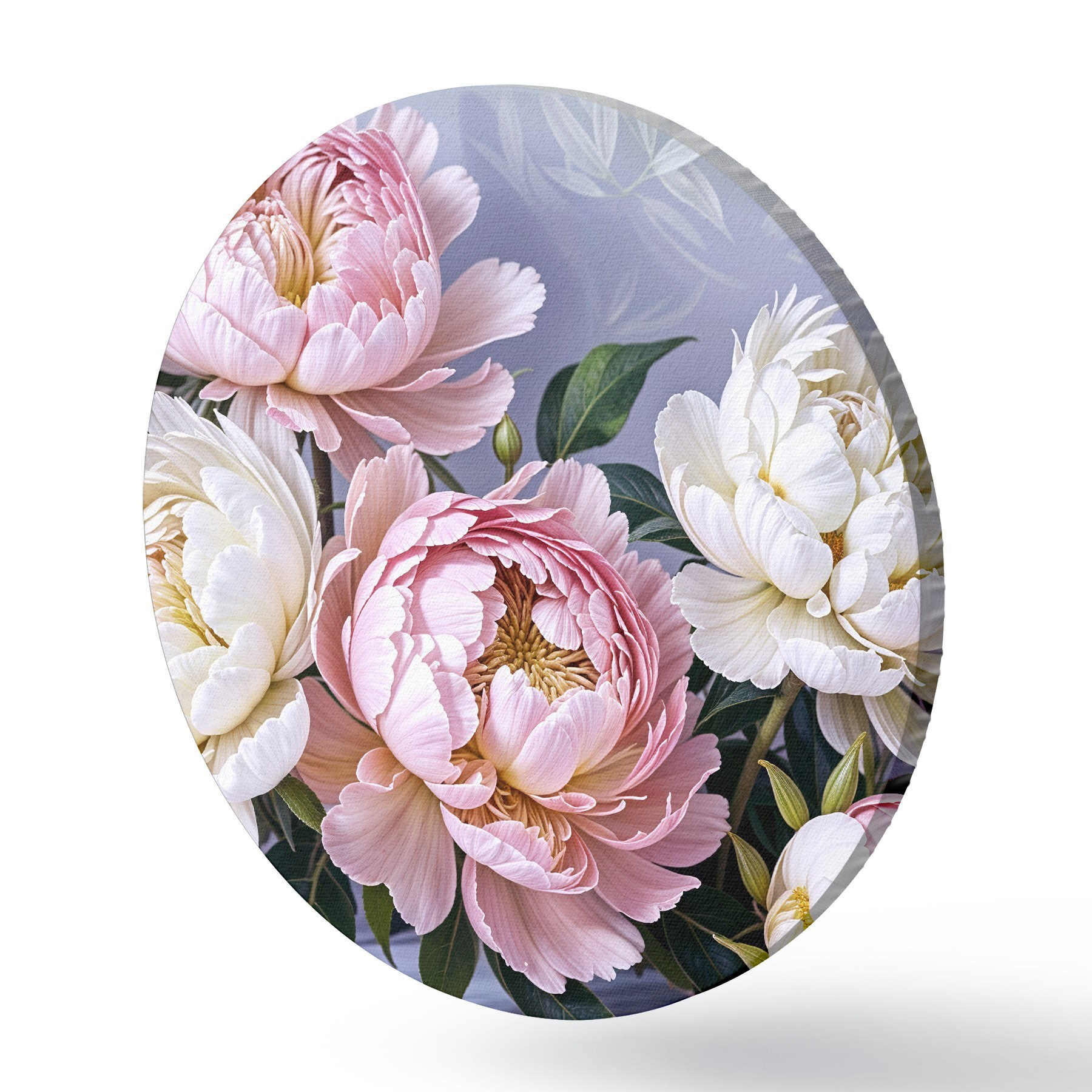 Runde Gemälde Ein Strauß großer, üppiger rosa und weißer Pfingstrosenblüten mit grünen Blättern vor einem weichen, unscharfen Hintergrund r39514