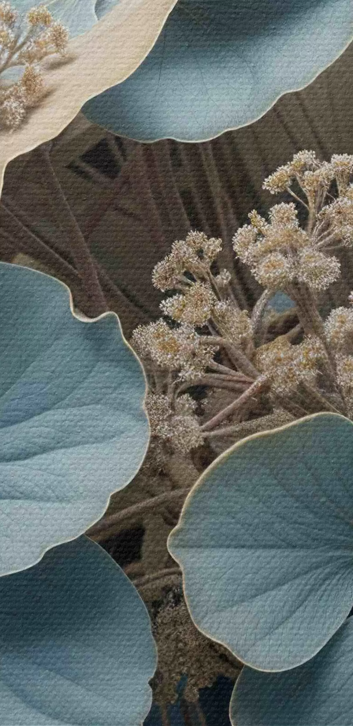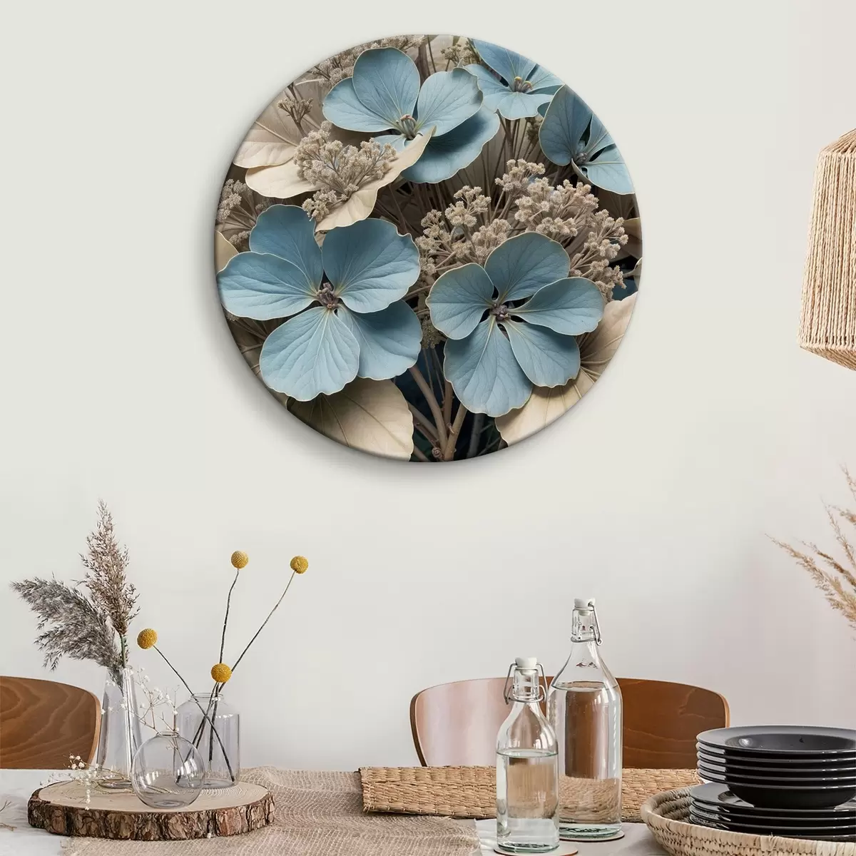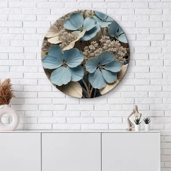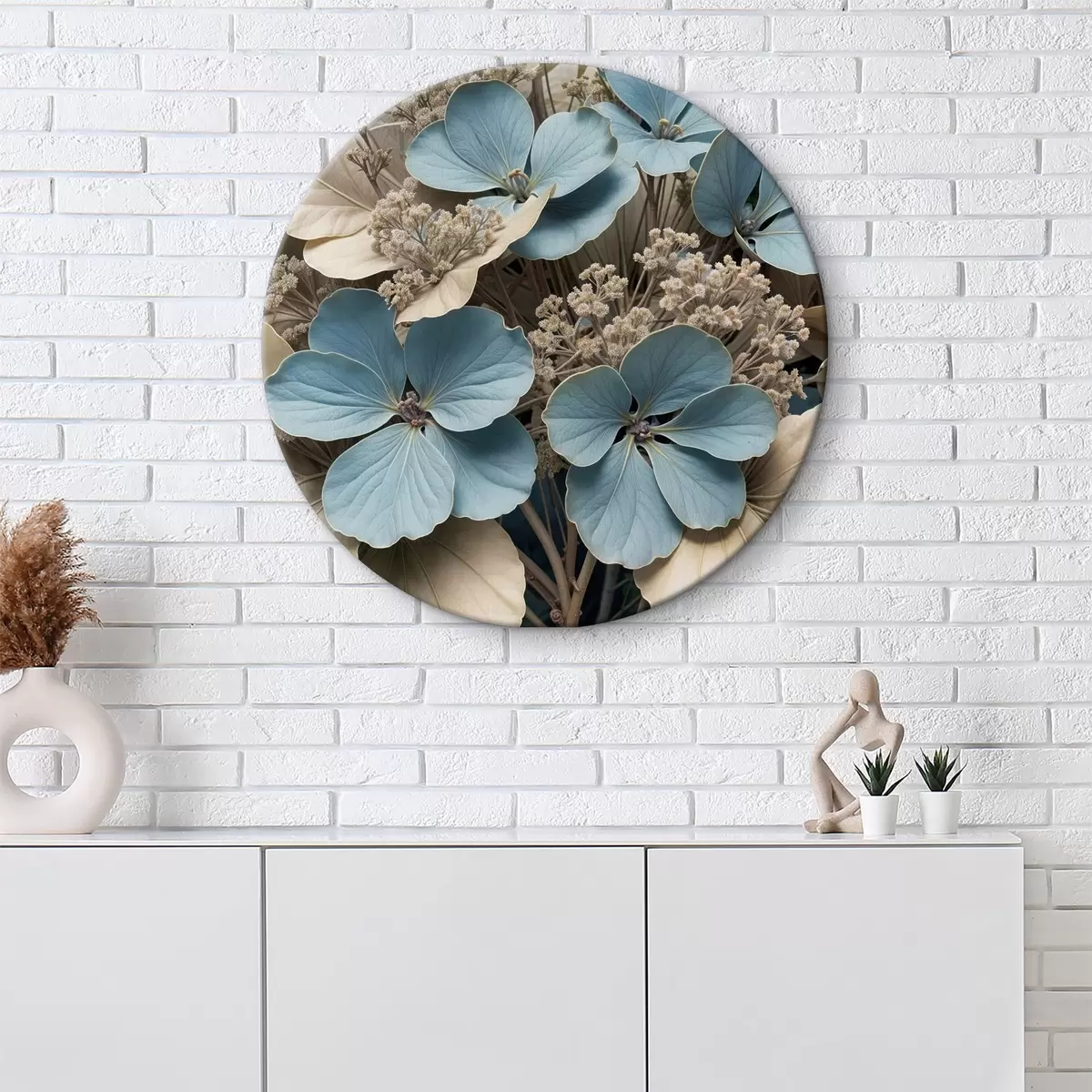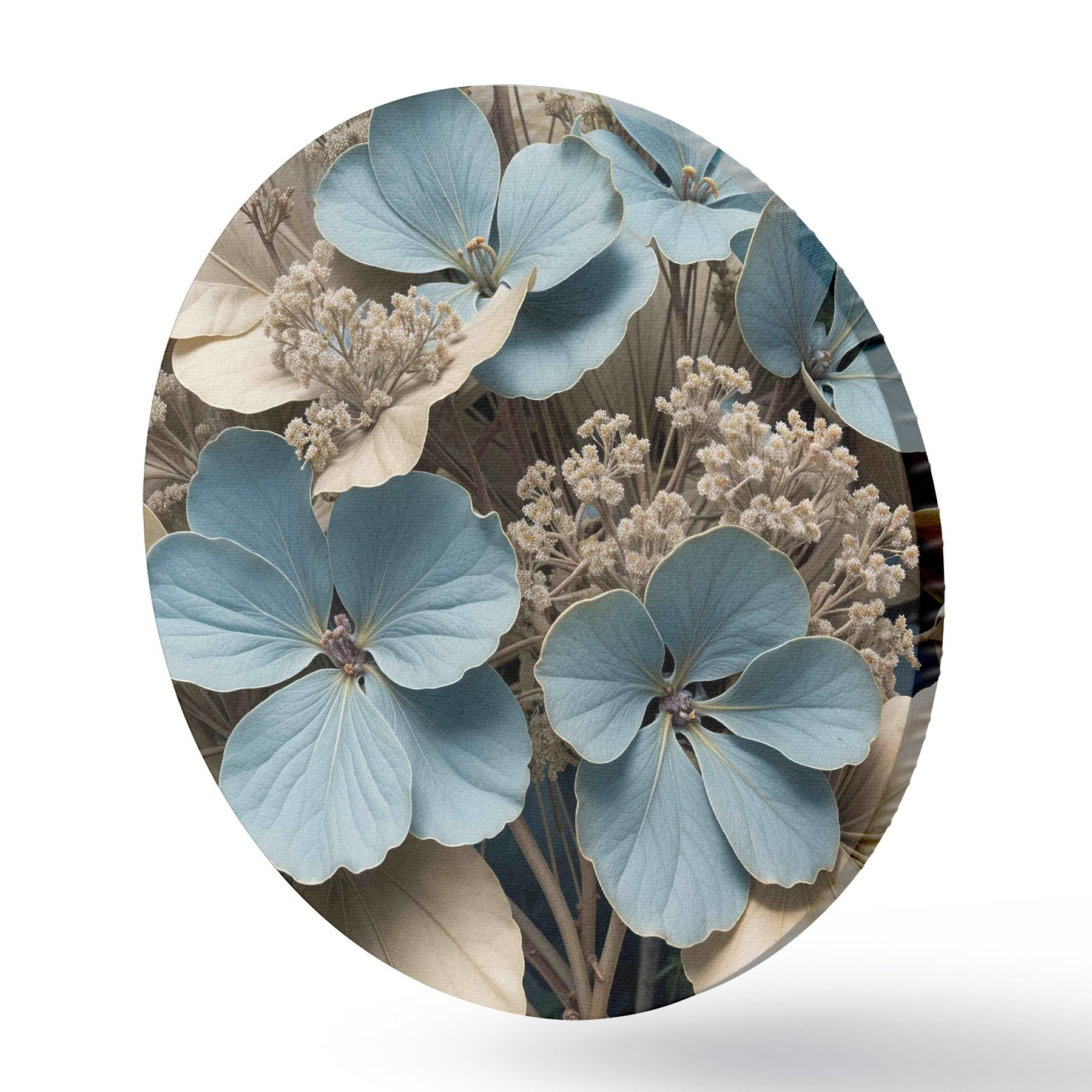 Runde Gemälde Nahaufnahme von blauen und weißen Blumen mit weichen, verschwommenen Blütenblättern auf einem braunen Hintergrund r39517