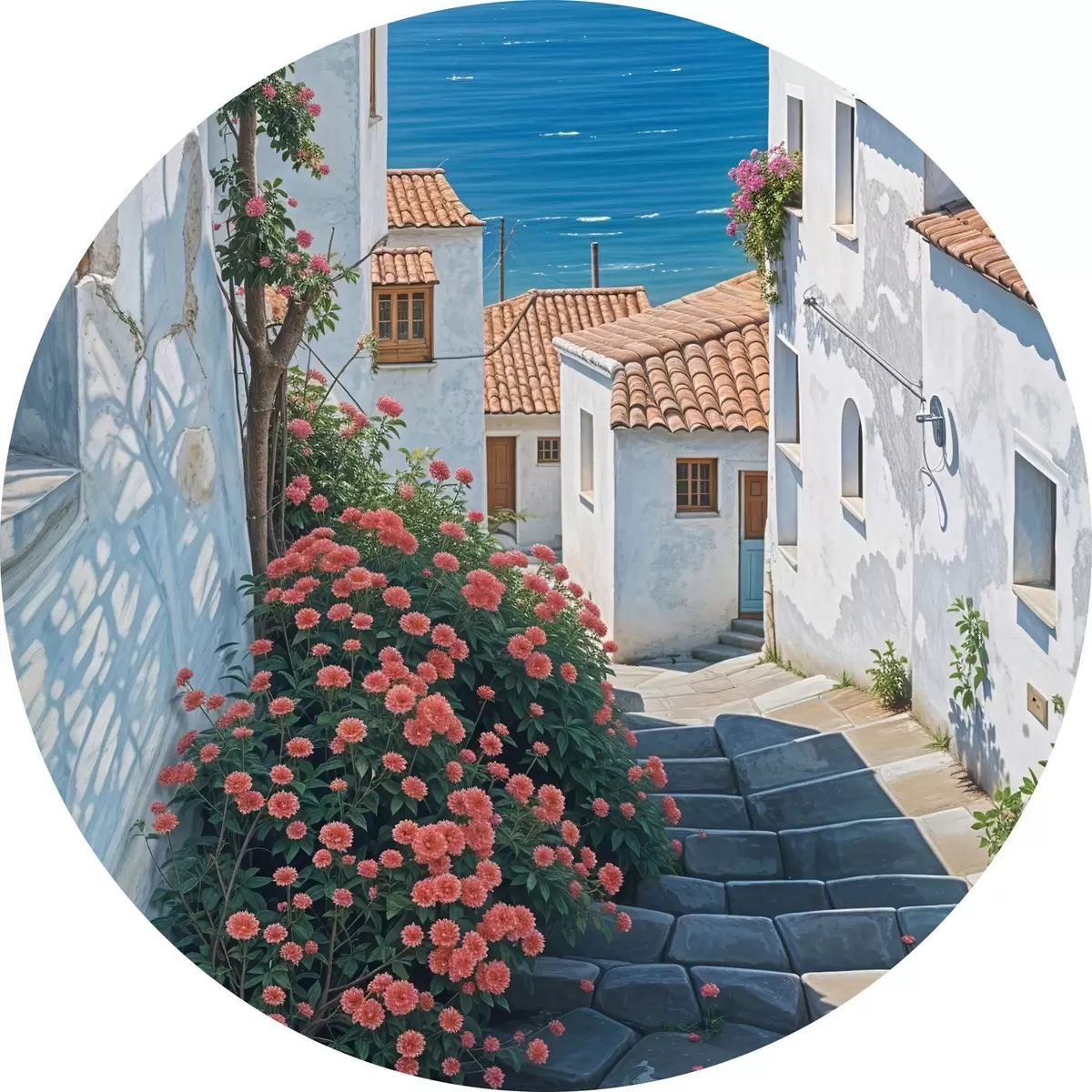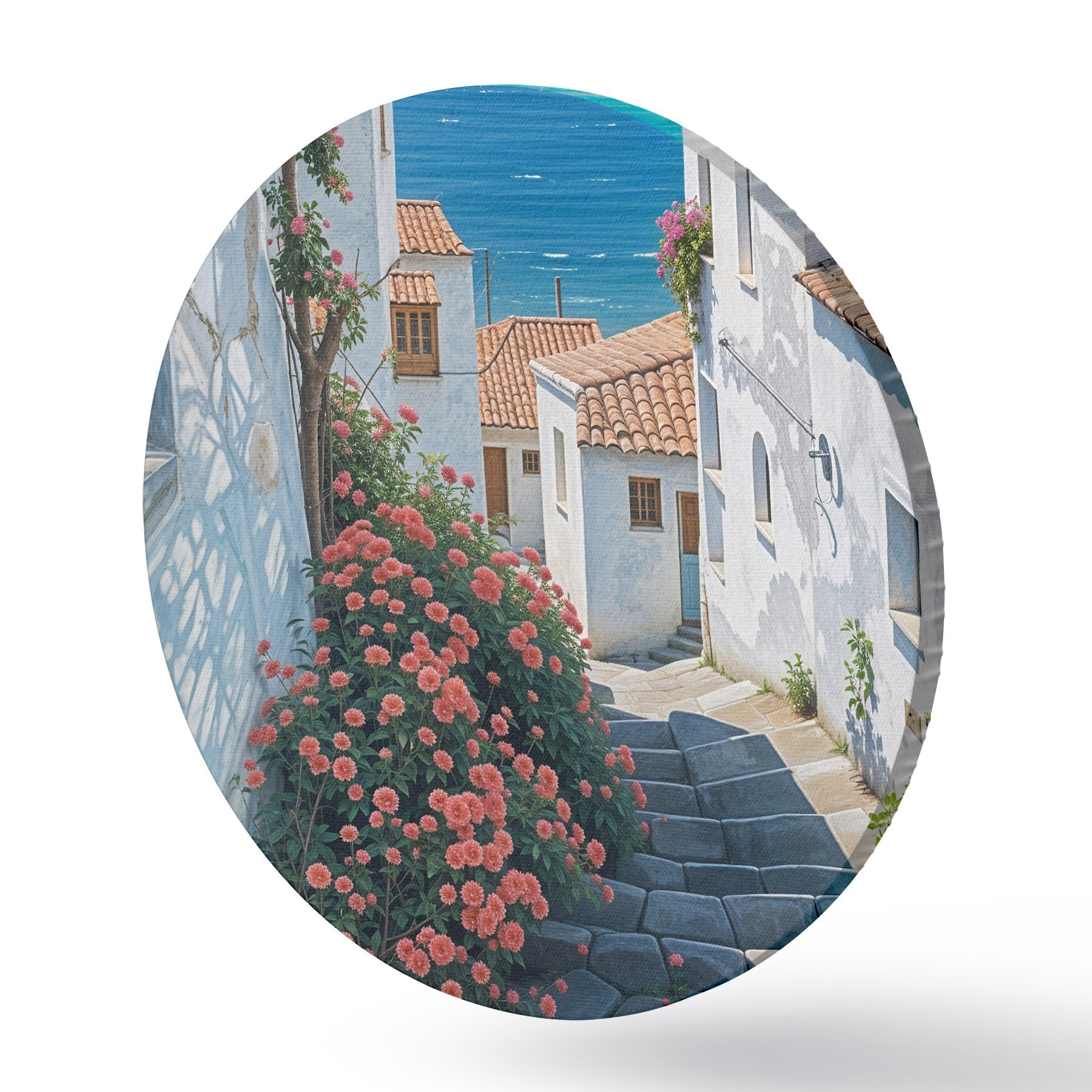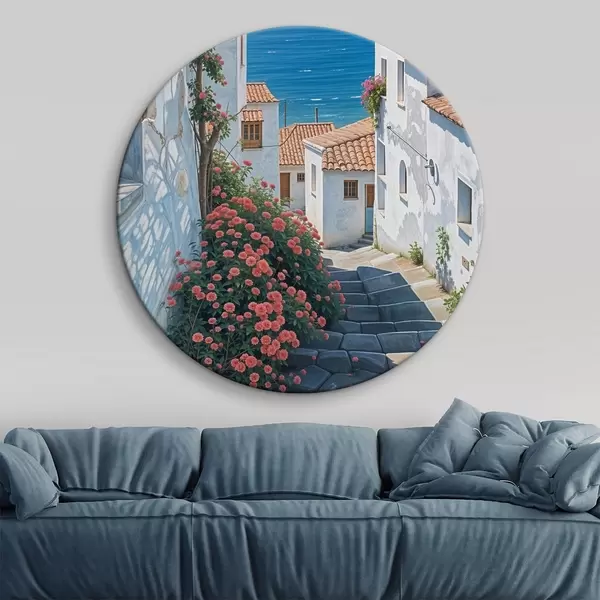 Runde Gemälde Eine schmale Straße in einer Küstenstadt mit weißen Gebäuden, roten Ziegeldächern und leuchtend rosa Blumen r39532