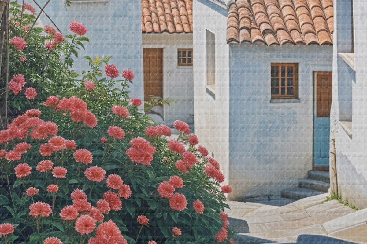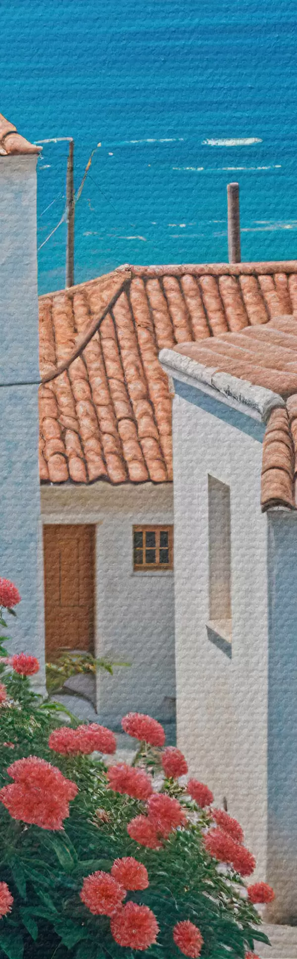 Bild Eine schmale Straße in einer Küstenstadt mit weißen Gebäuden, roten Ziegeldächern und leuchtend rosa Blumen Nr r39532