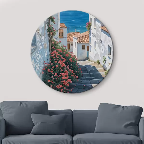 Runde Gemälde Eine schmale Straße in einer Küstenstadt mit weißen Gebäuden, roten Ziegeldächern und leuchtend rosa Blumen r39532