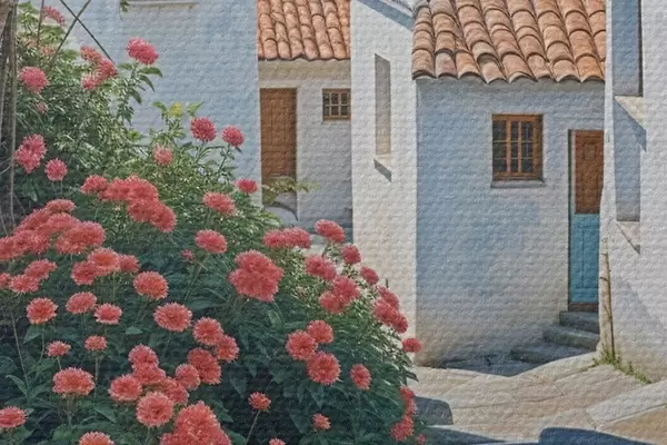 Bild Eine schmale Straße in einer Küstenstadt mit weißen Gebäuden, roten Ziegeldächern und leuchtend rosa Blumen Nr r39532