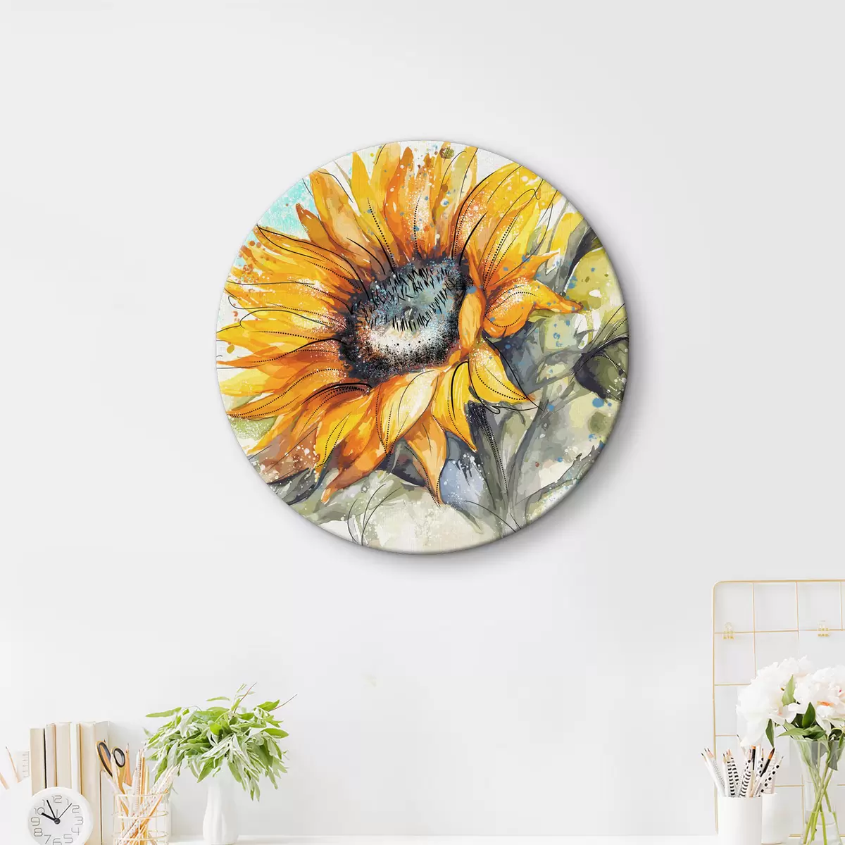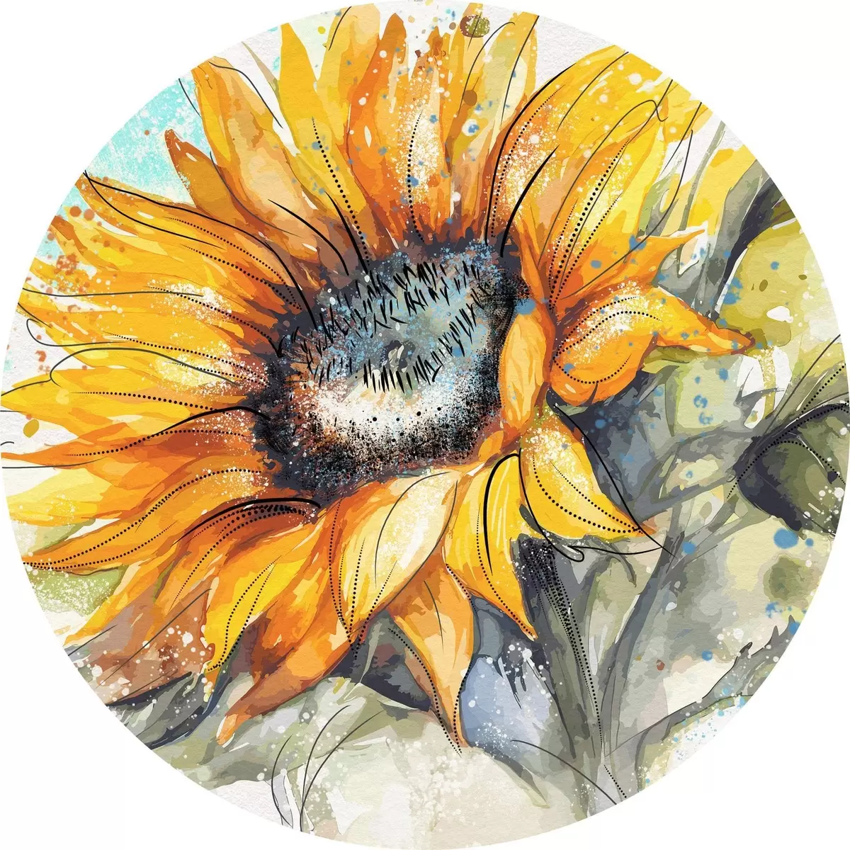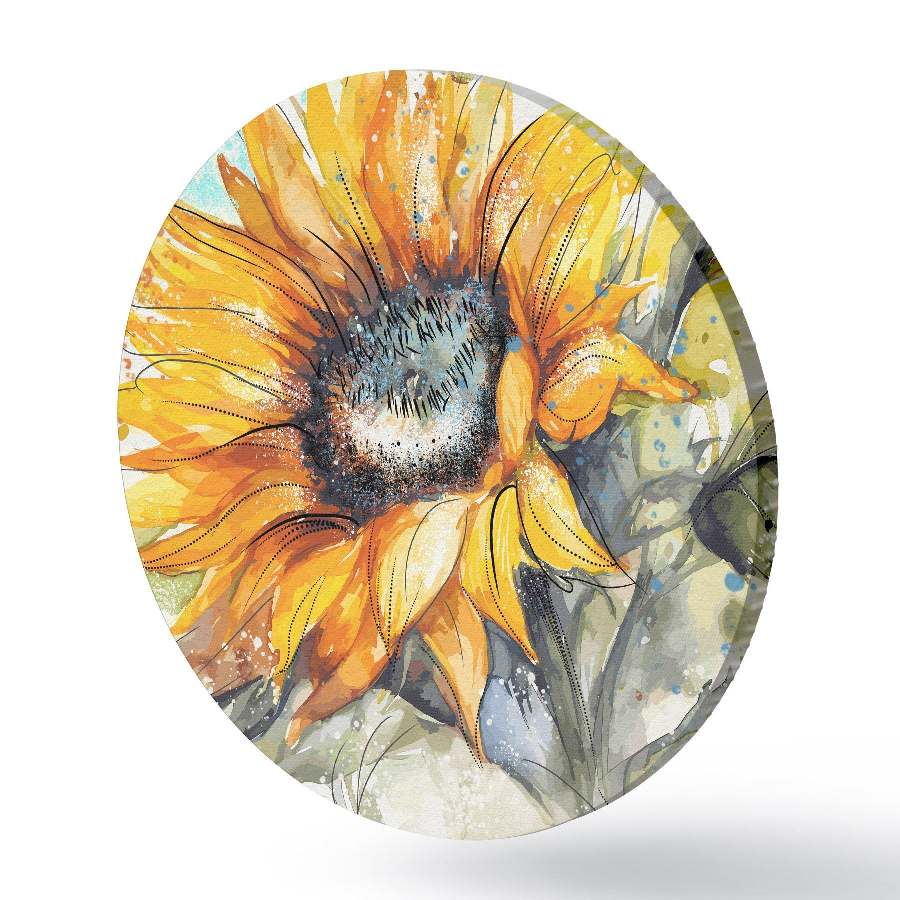 Runde Gemälde Aquarellierte Sonnenblume mit Farbspritzern r39583
