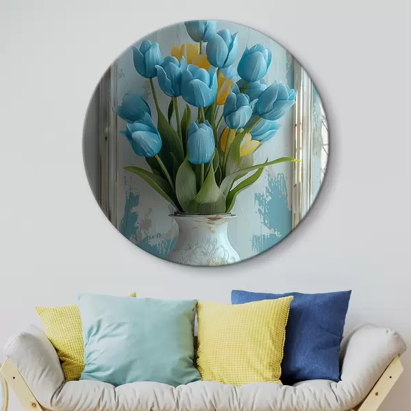 Runde Gemälde Blaue und gelbe Tulpen in 3D: elegantes Wandbild mit weißem Rahmen, weißem und hellblauem Hintergrund und gravierter Vase r39636