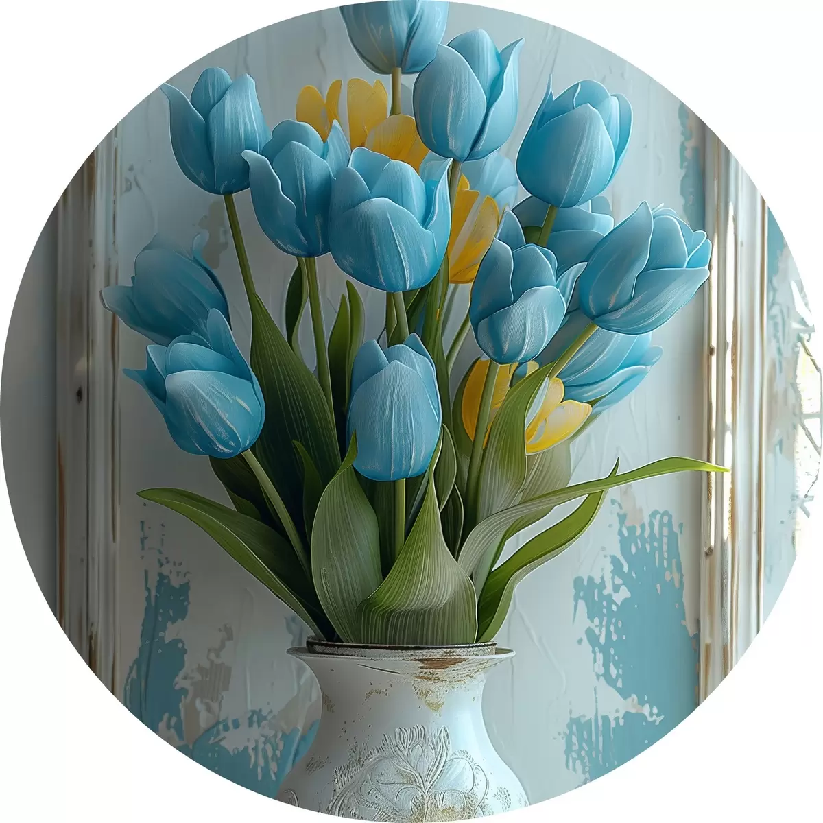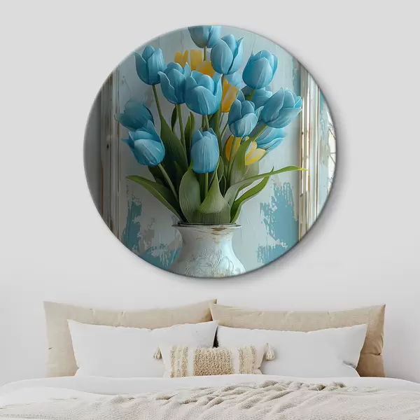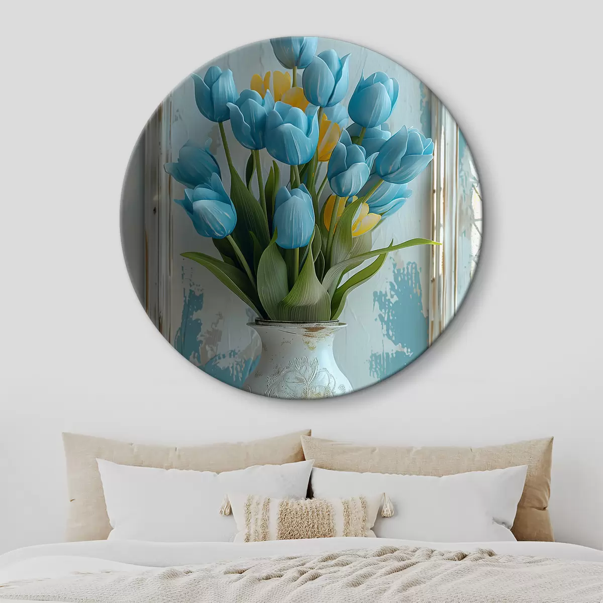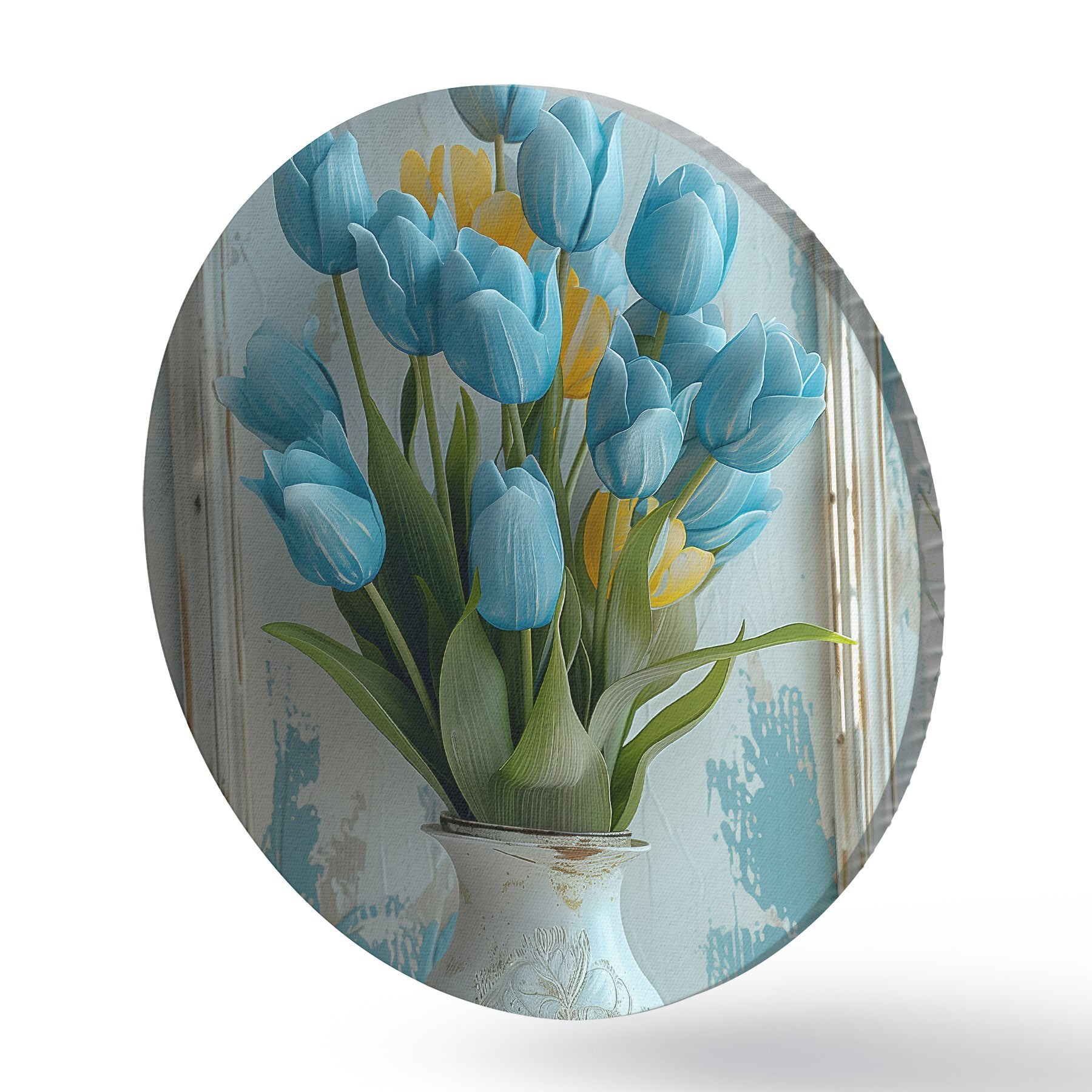 Runde Gemälde Blaue und gelbe Tulpen in 3D: elegantes Wandbild mit weißem Rahmen, weißem und hellblauem Hintergrund und gravierter Vase r39636