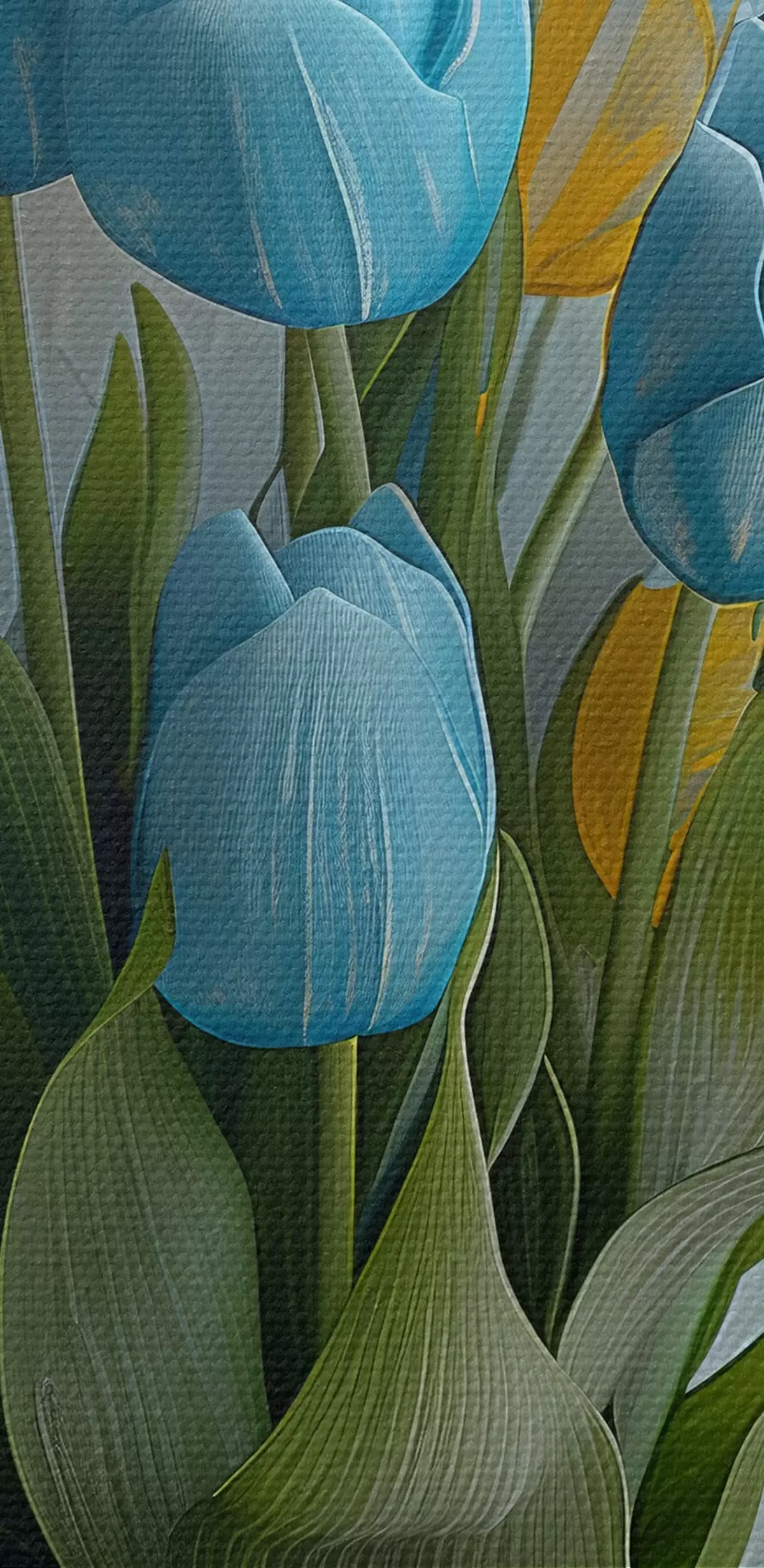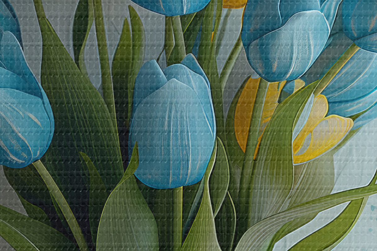 Bild Blaue und gelbe Tulpen in 3D: elegantes Wandbild mit weißem Rahmen, weißem und hellblauem Hintergrund und gravierter Vase Nr r39636