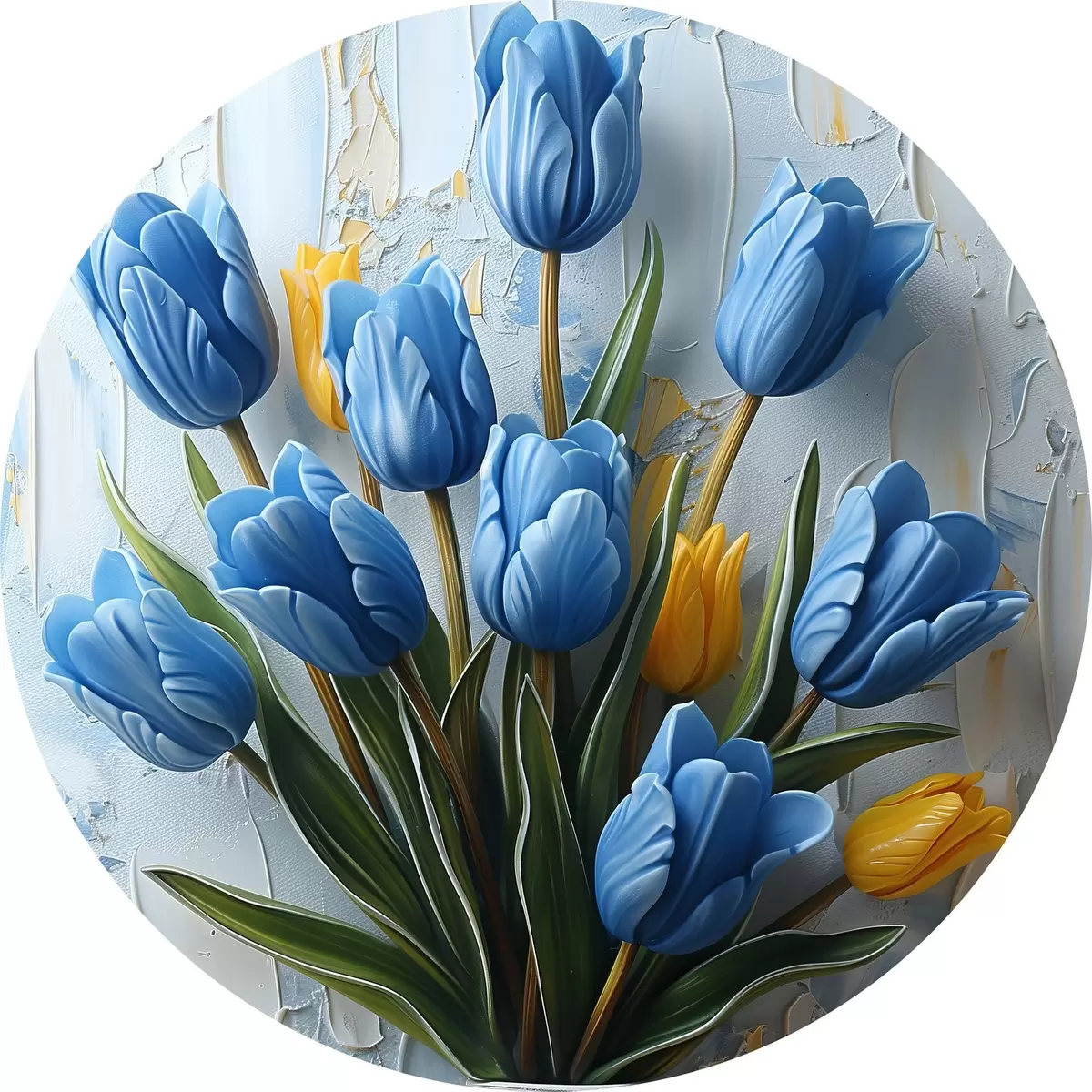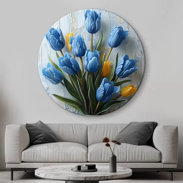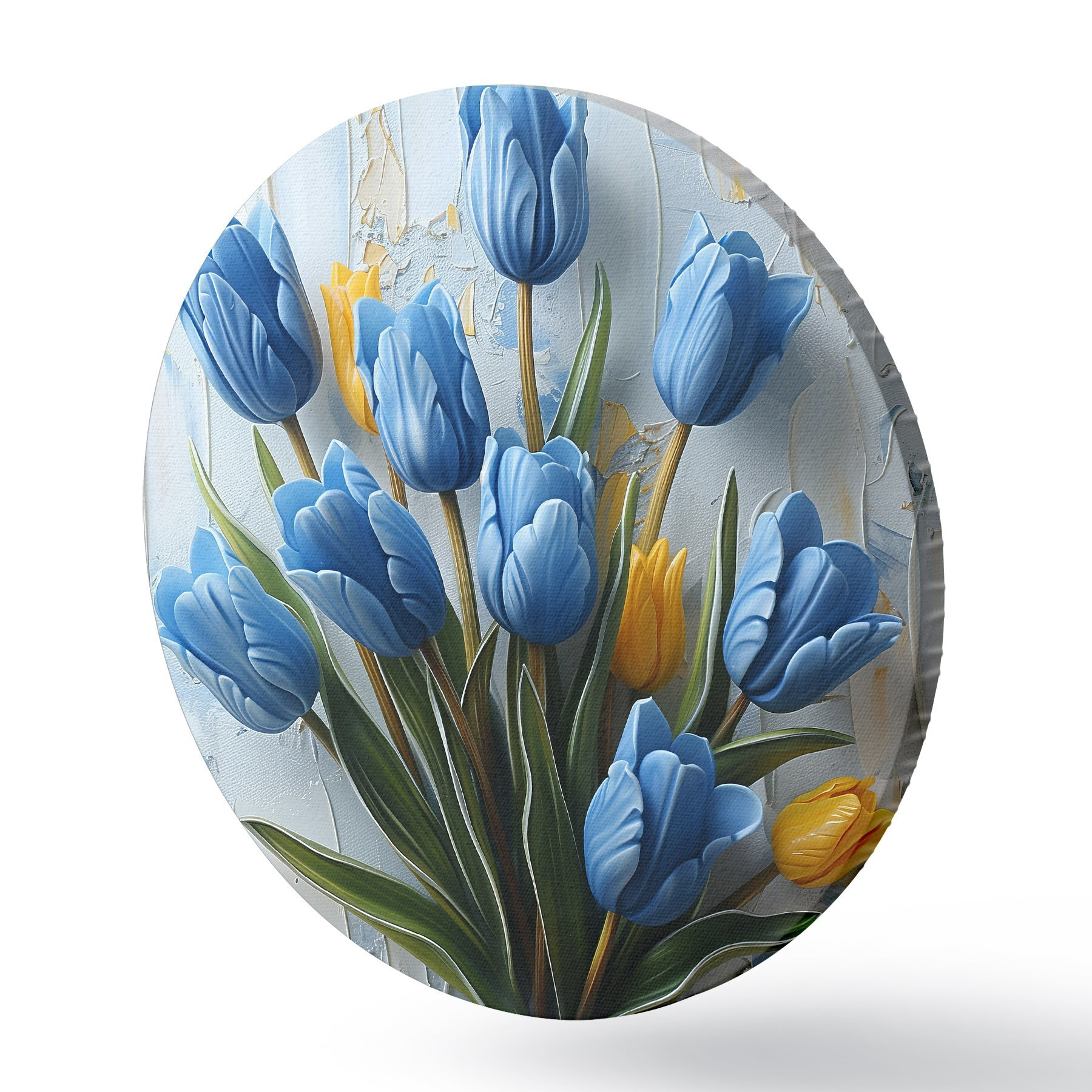 Runde Gemälde Blaue und gelbe Tulpen in 3D: elegantes ölgemaltes Wandbild mit weißem und hellblauem Hintergrund und gravierter Vase r39637