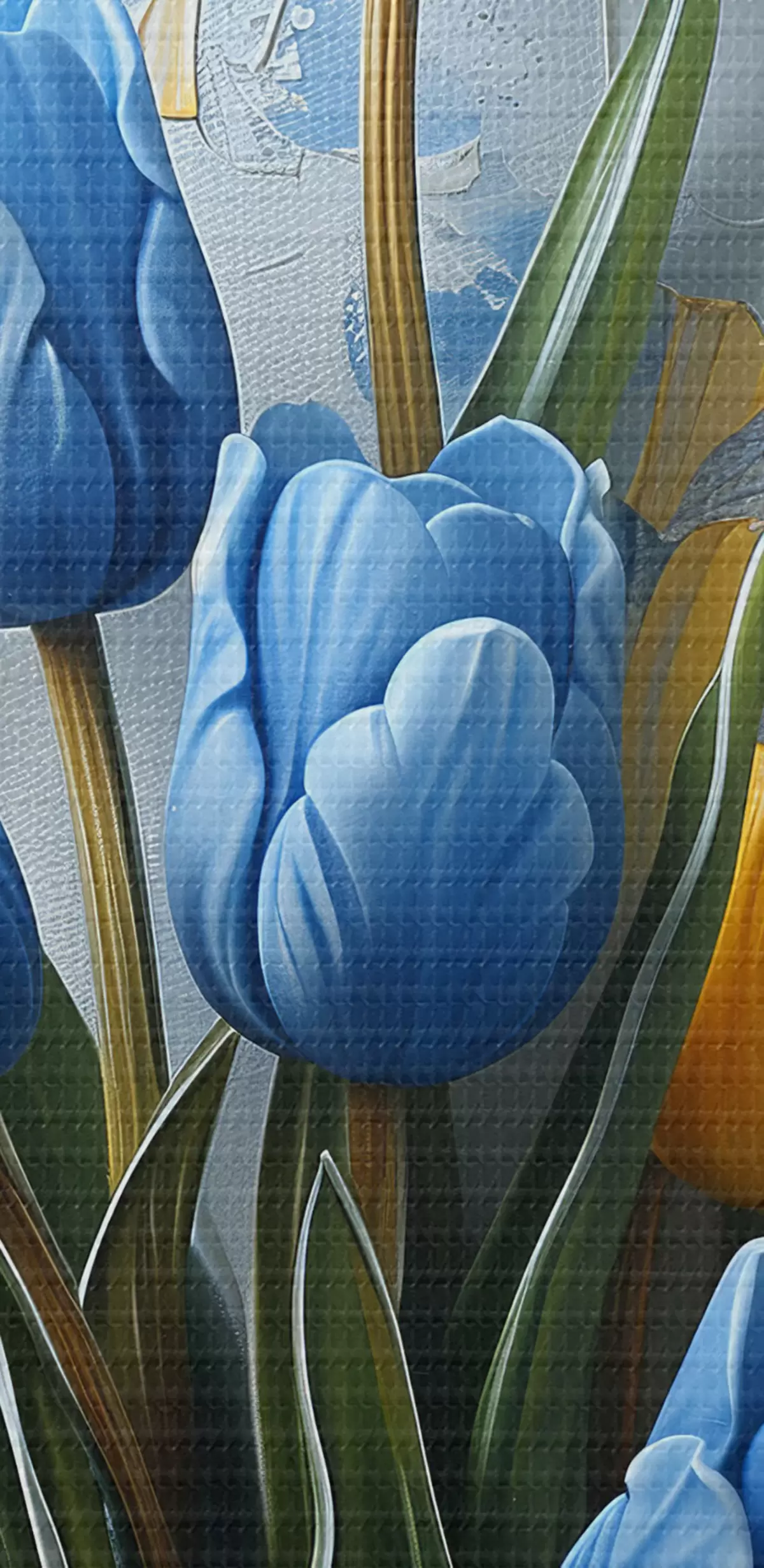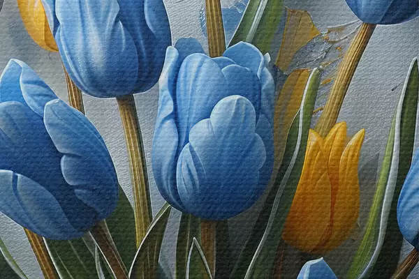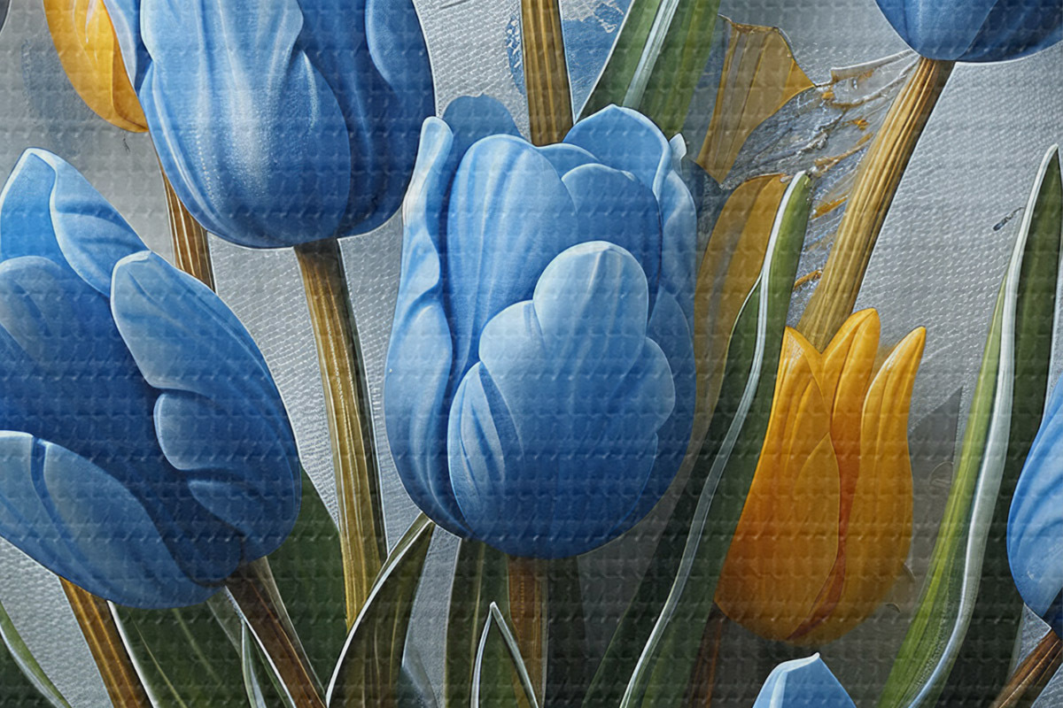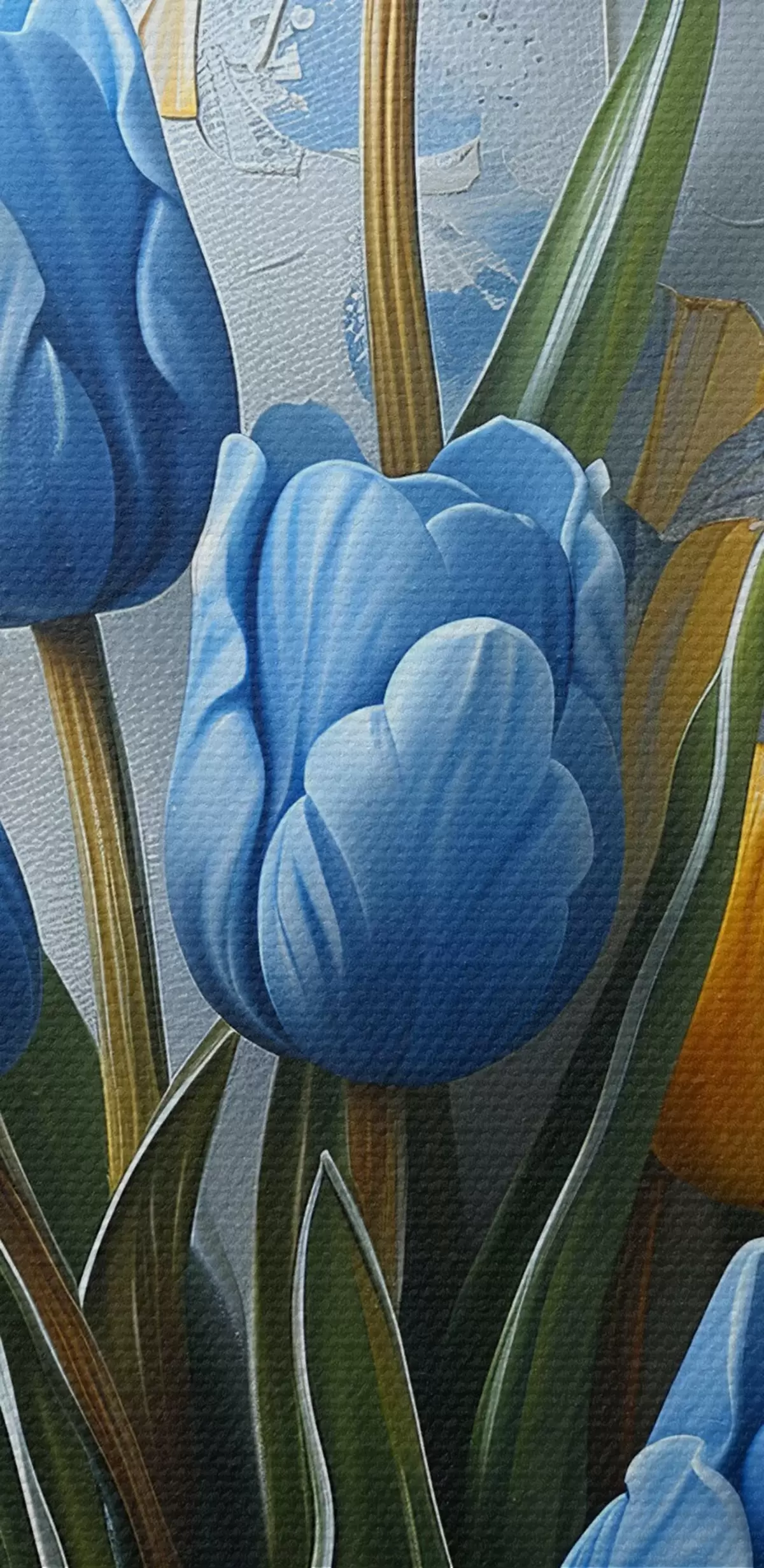 Bild Blaue und gelbe Tulpen in 3D: elegantes ölgemaltes Wandbild mit weißem und hellblauem Hintergrund und gravierter Vase Nr r39637