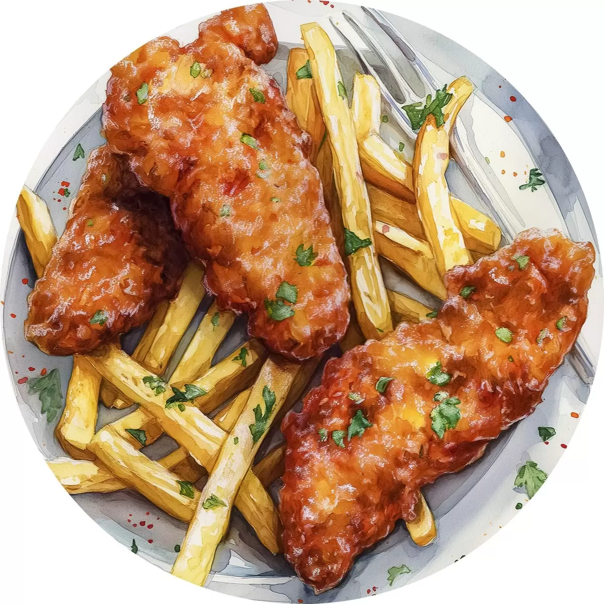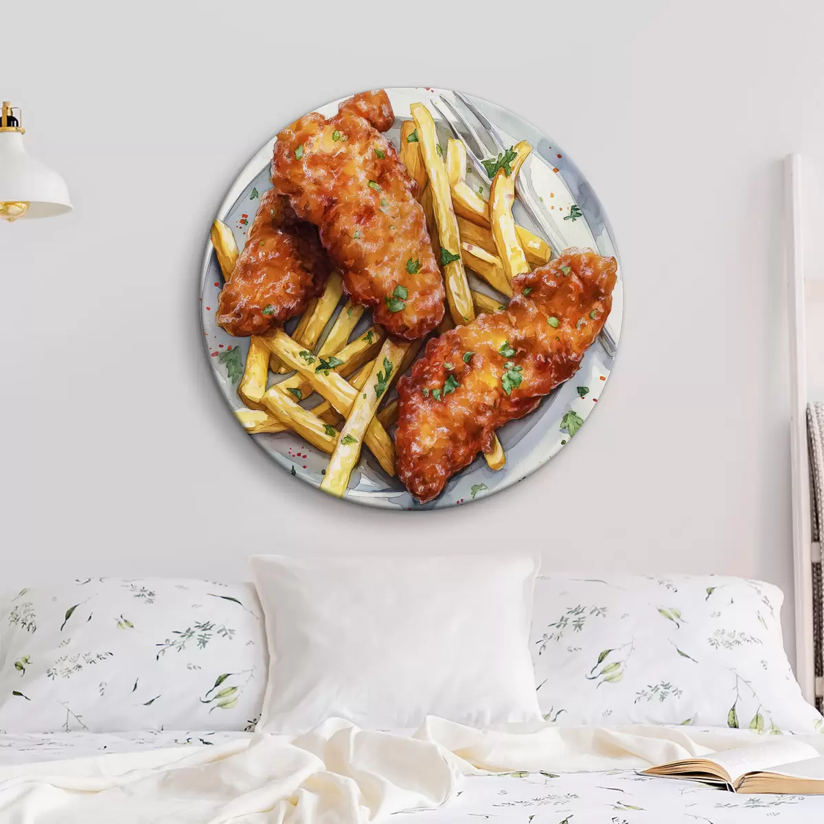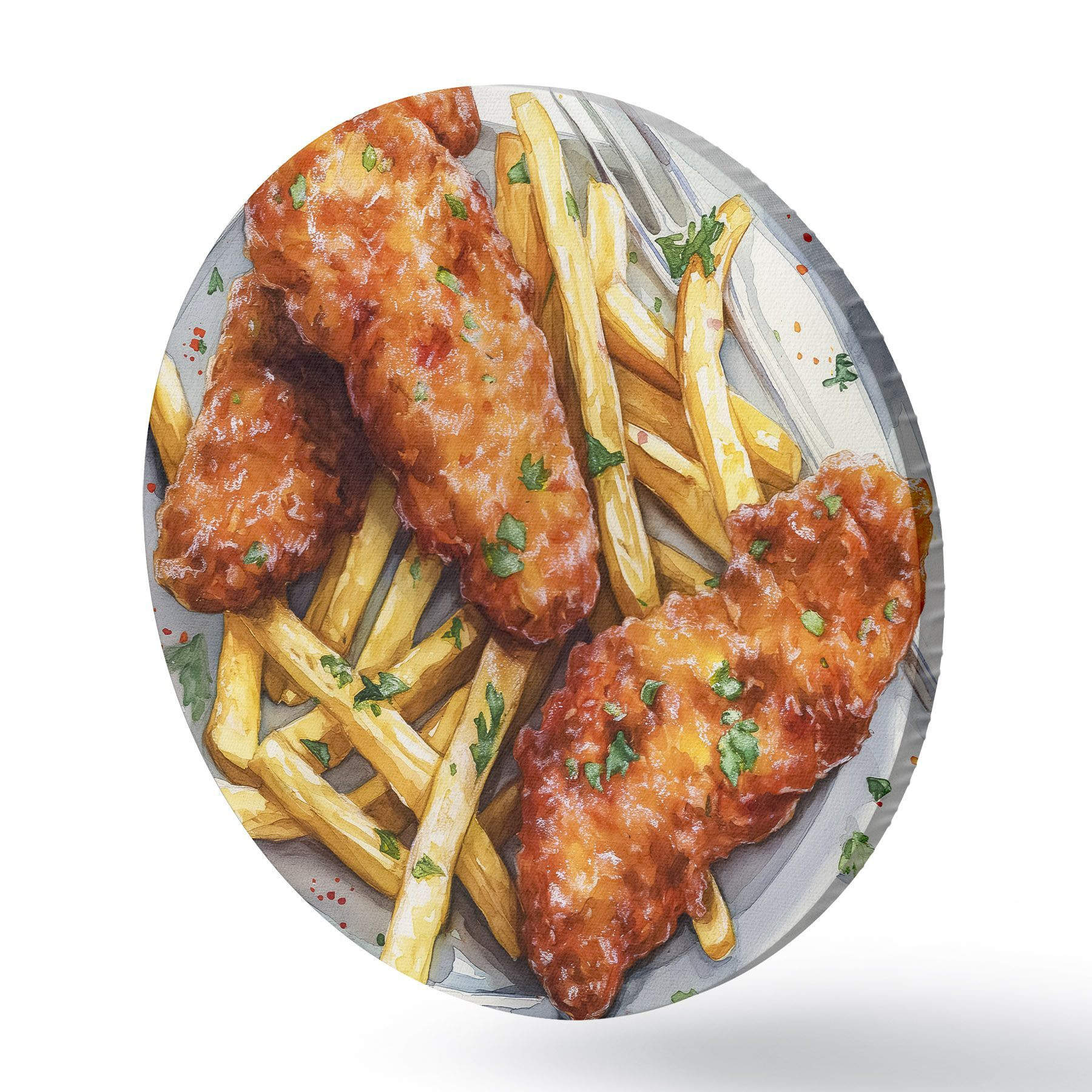 Runde Gemälde Aquarell-Food-Art, Pommes Frites mit gebratenem Huhn, köstlich r39708