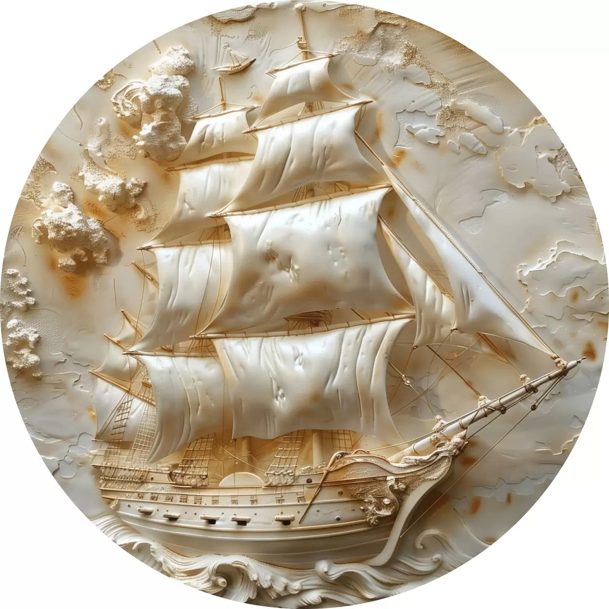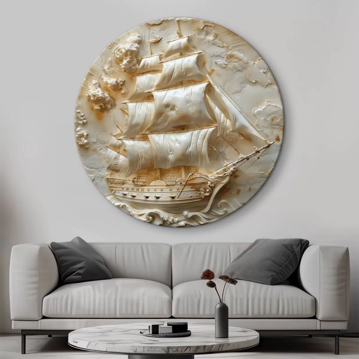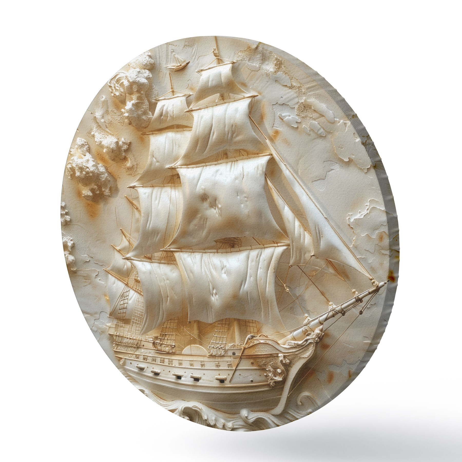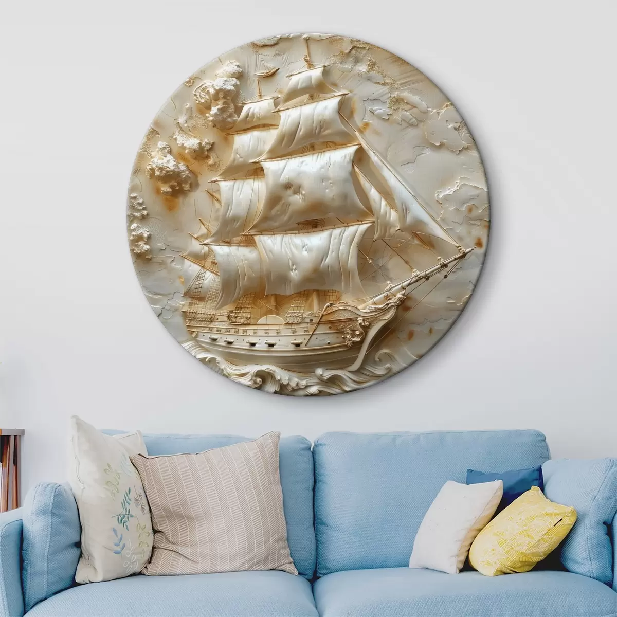 Runde Gemälde Flachrelief eines Schiffes, das auf dem Meer segelt r39757