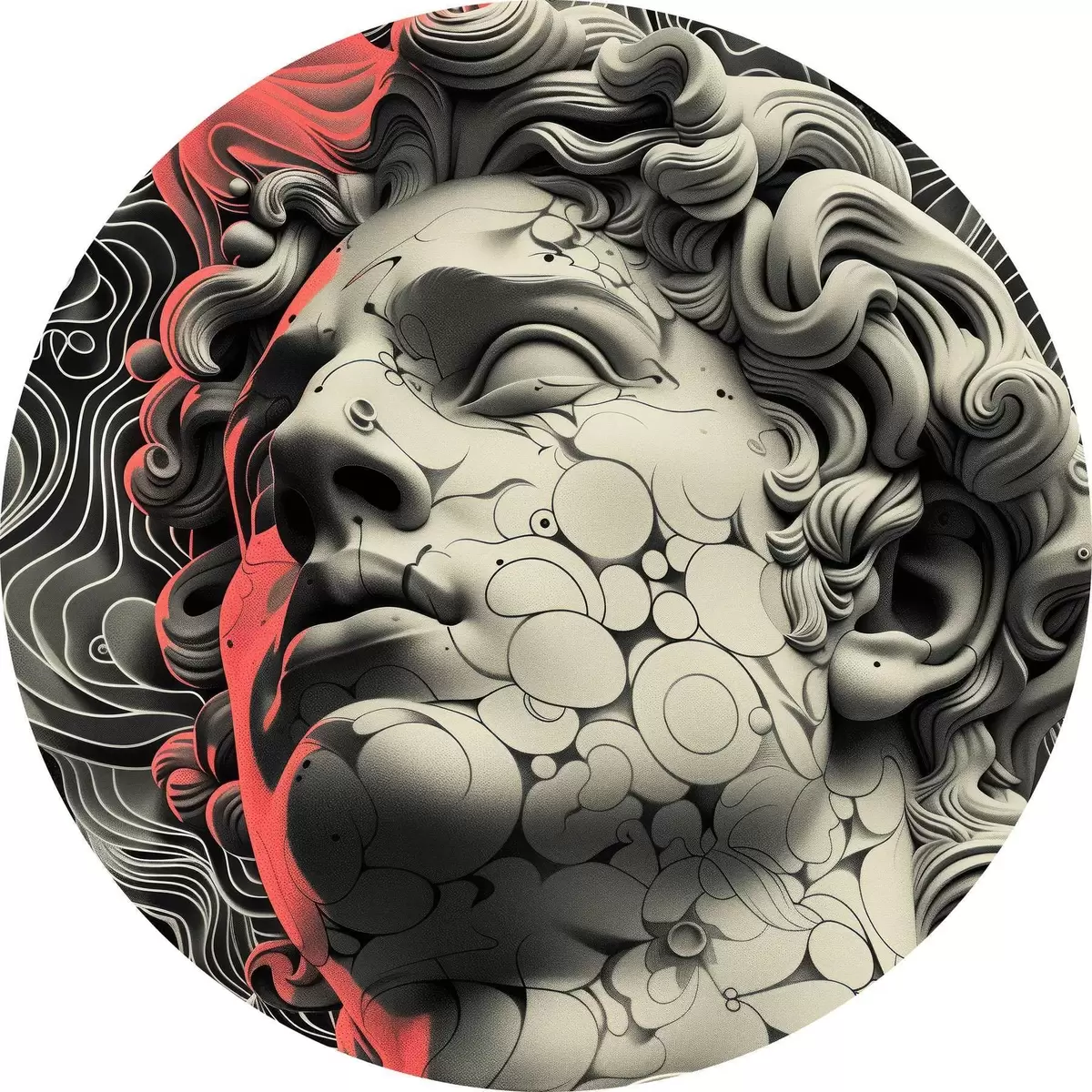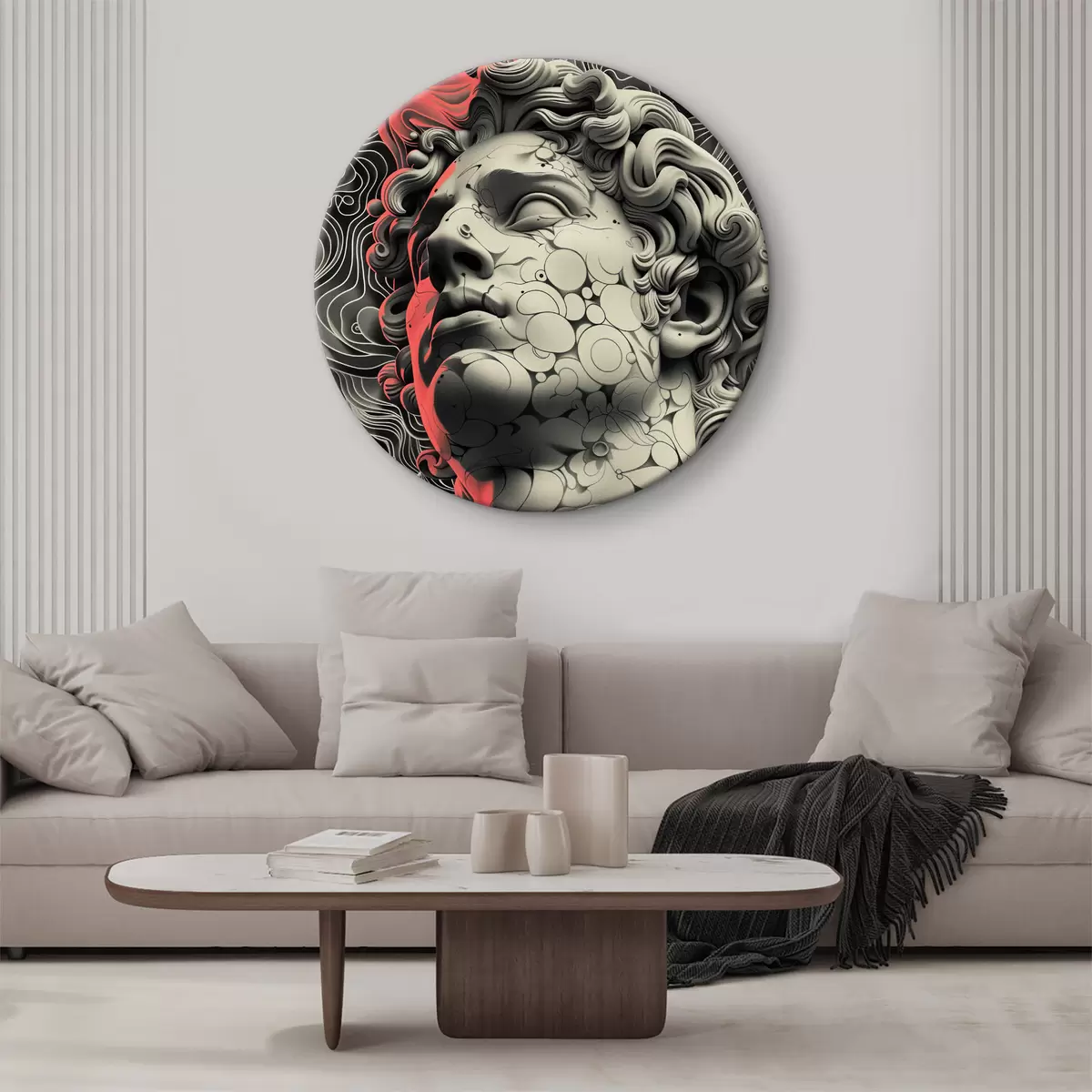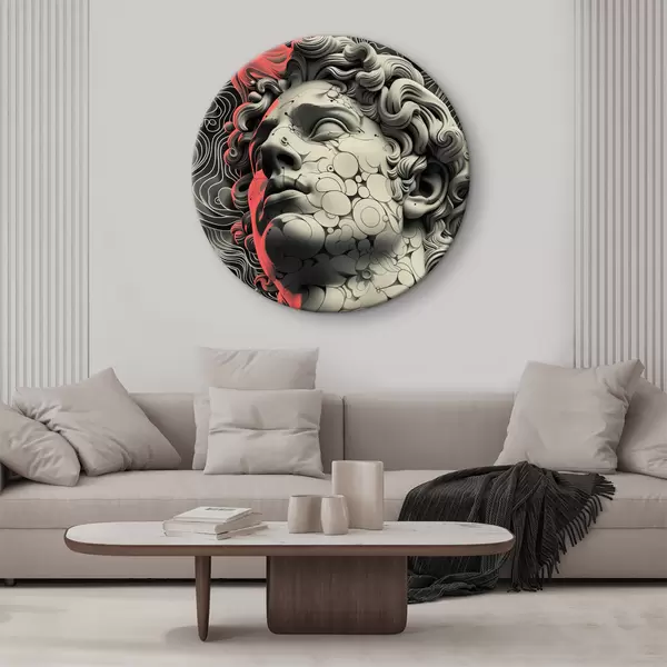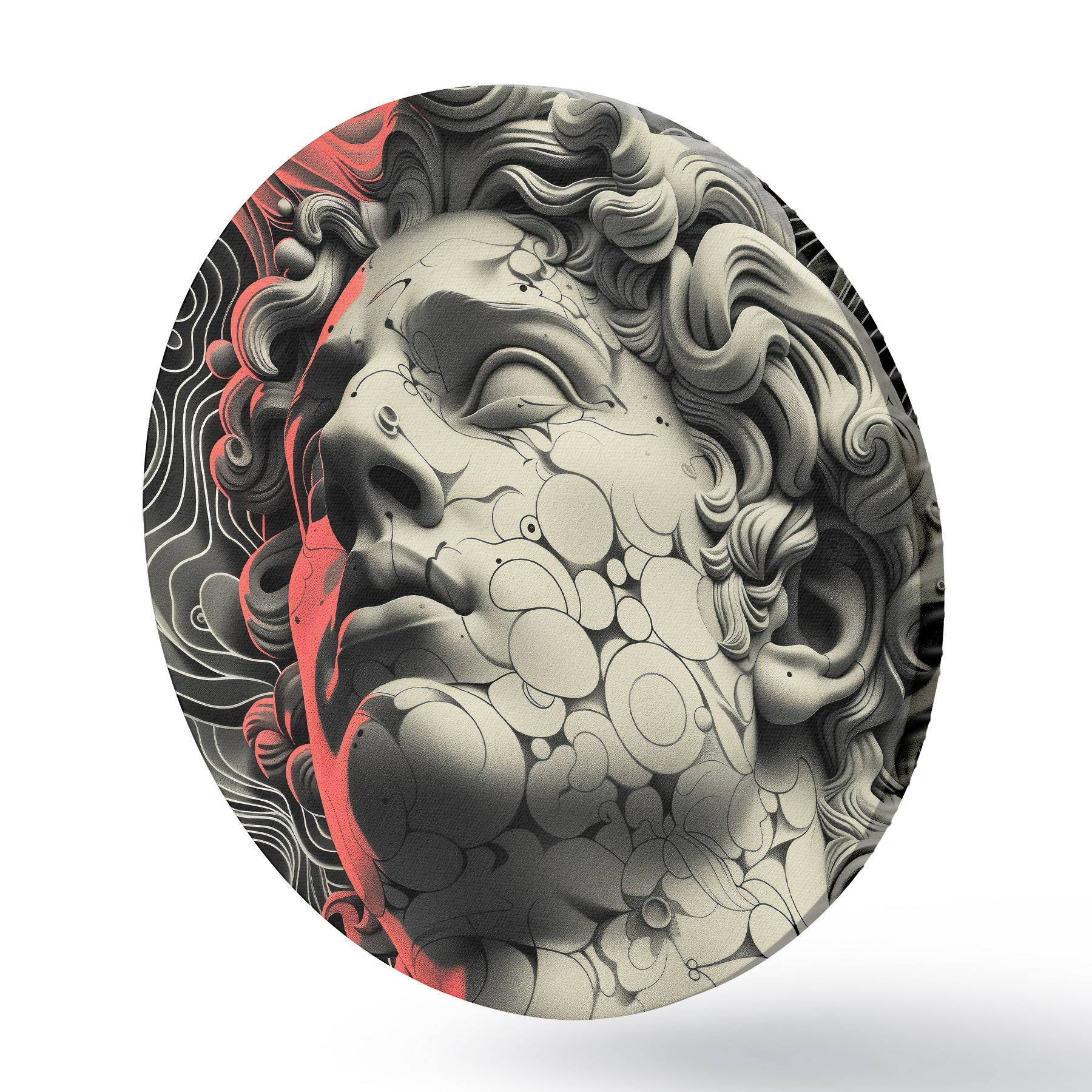 Runde Gemälde Schwarz-weiße lineare Darstellung des Kopfes des griechischen Gottes Apollo im Pop-Art-Stil r39763