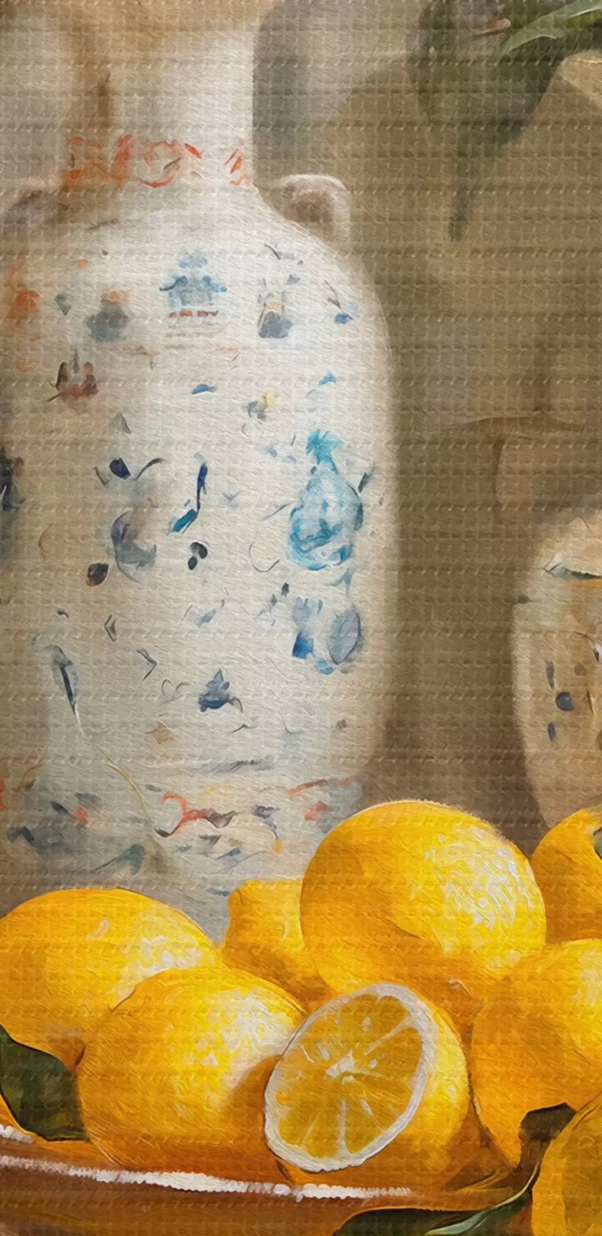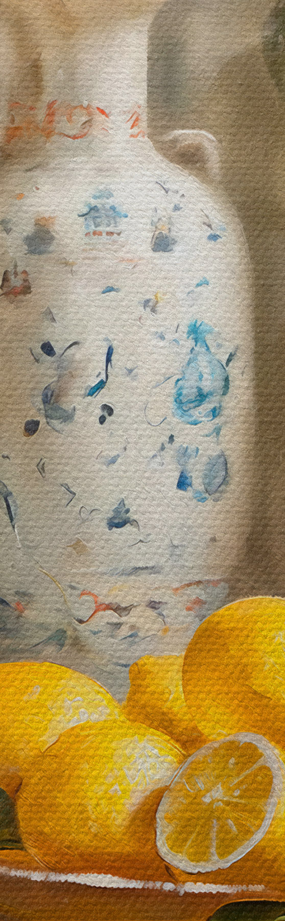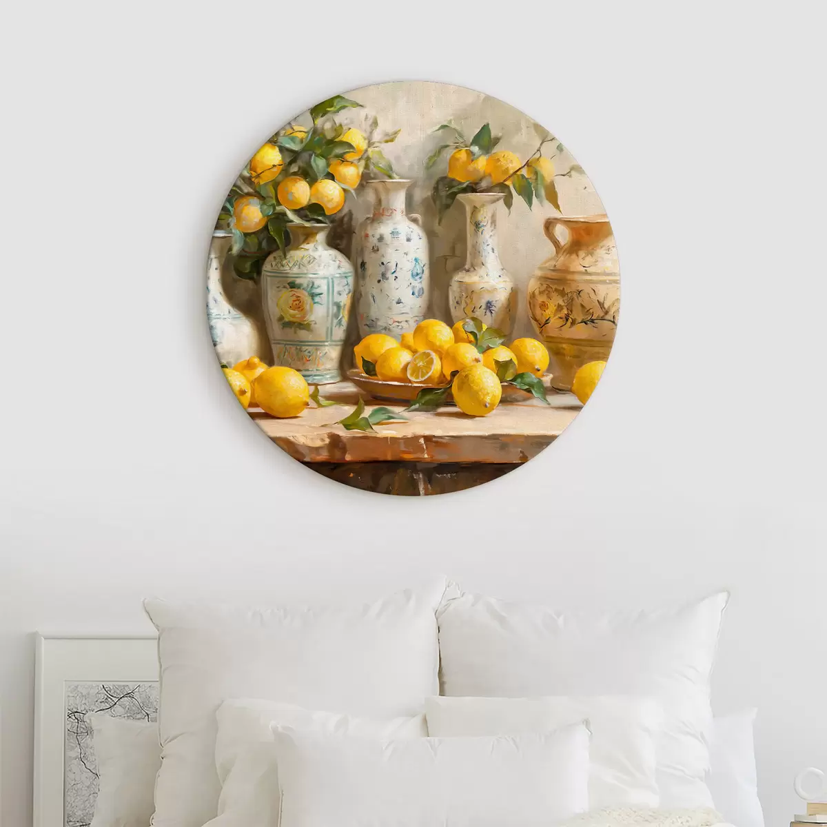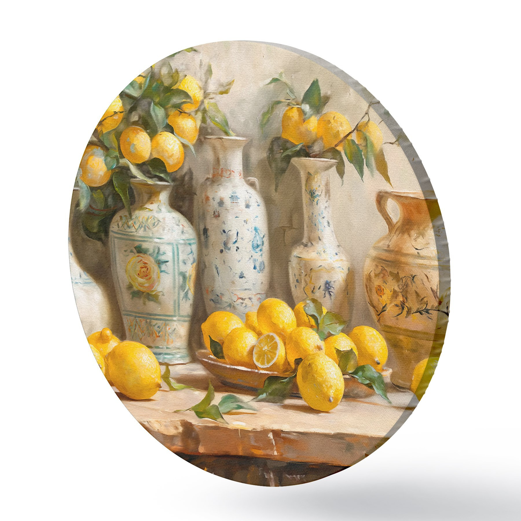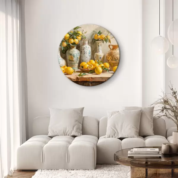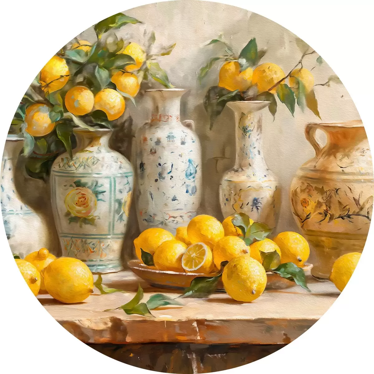 Runde Gemälde Zitronen und Vintage Vasen auf dem Tisch r39833