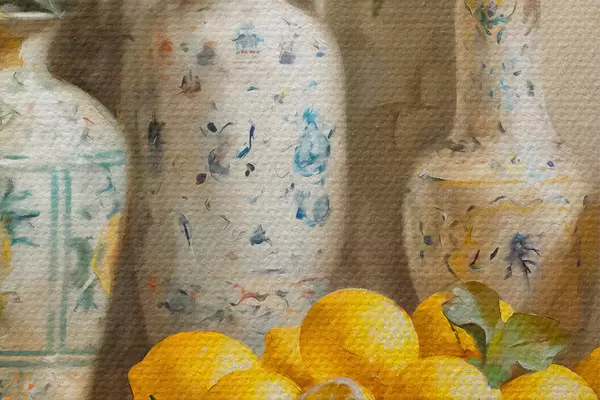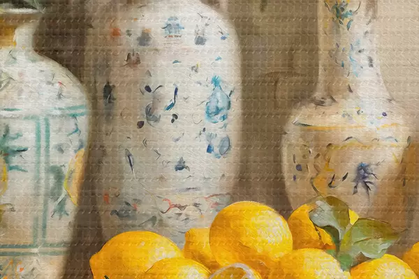 Runde Gemälde Zitronen und Vintage Vasen auf dem Tisch r39833