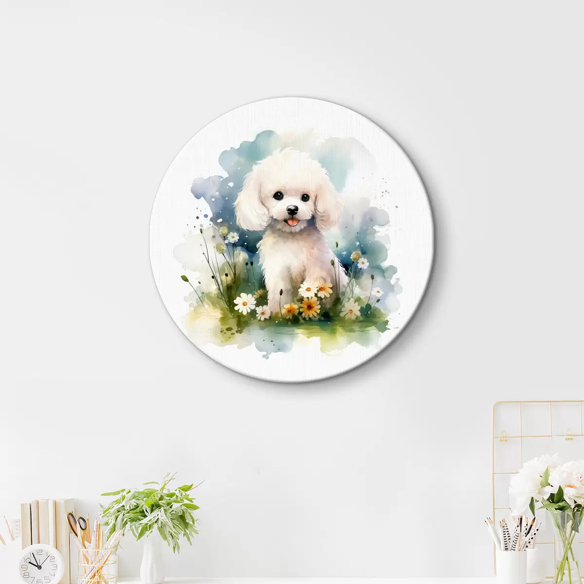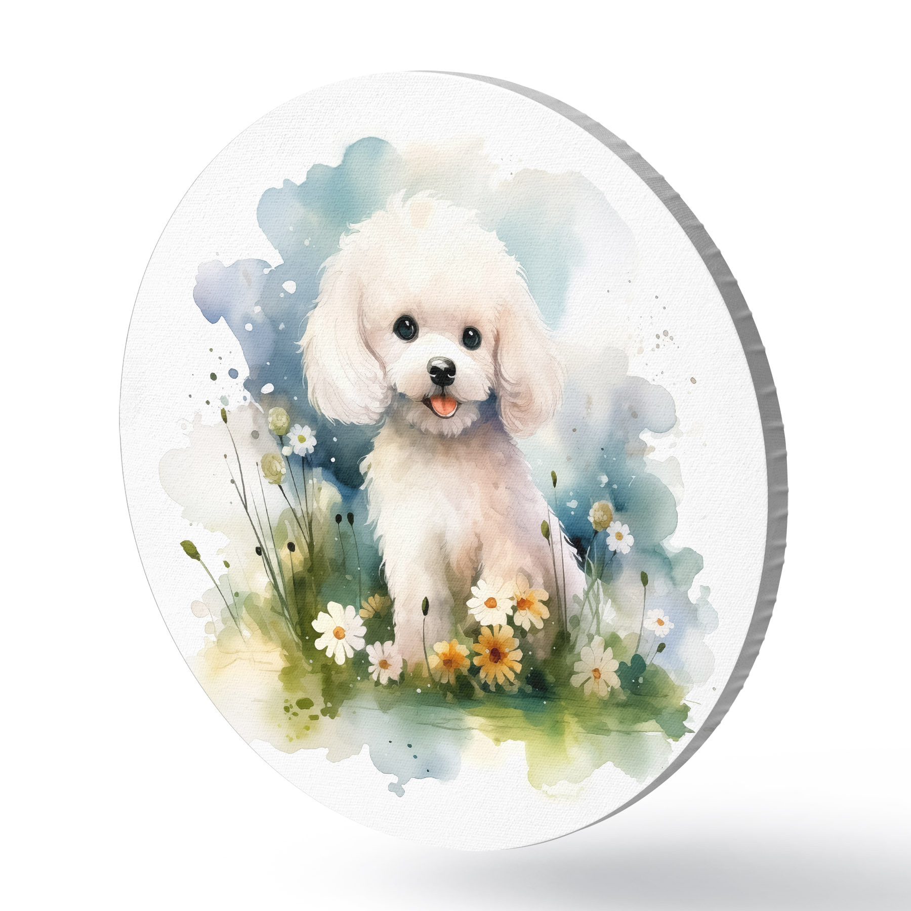 Runde Gemälde Kleiner weißer Pudel sitzt im Blumenaquarell r39928