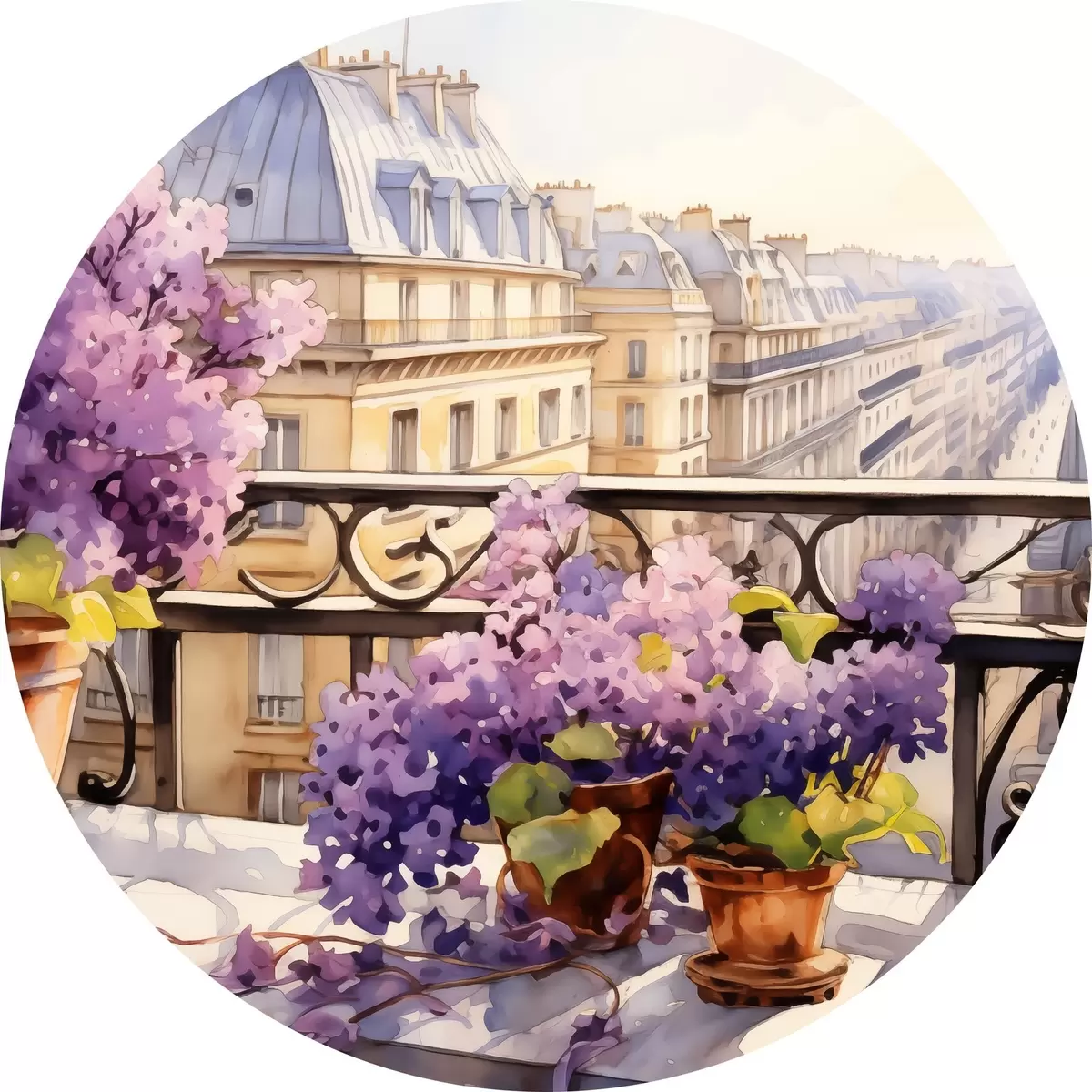 Runde Gemälde Veilchen in einem Topf auf einem Balkon in Paris Aquarell r39931