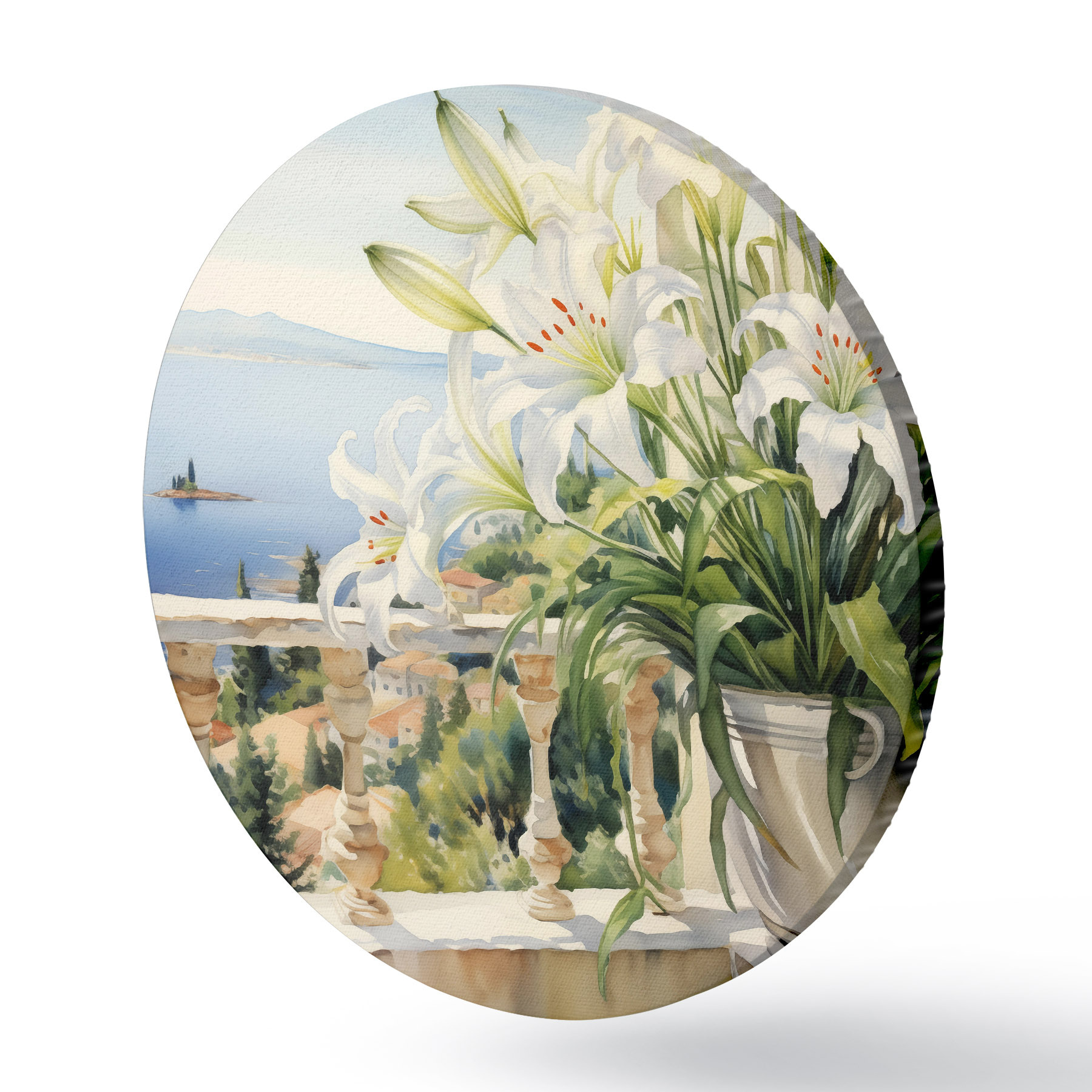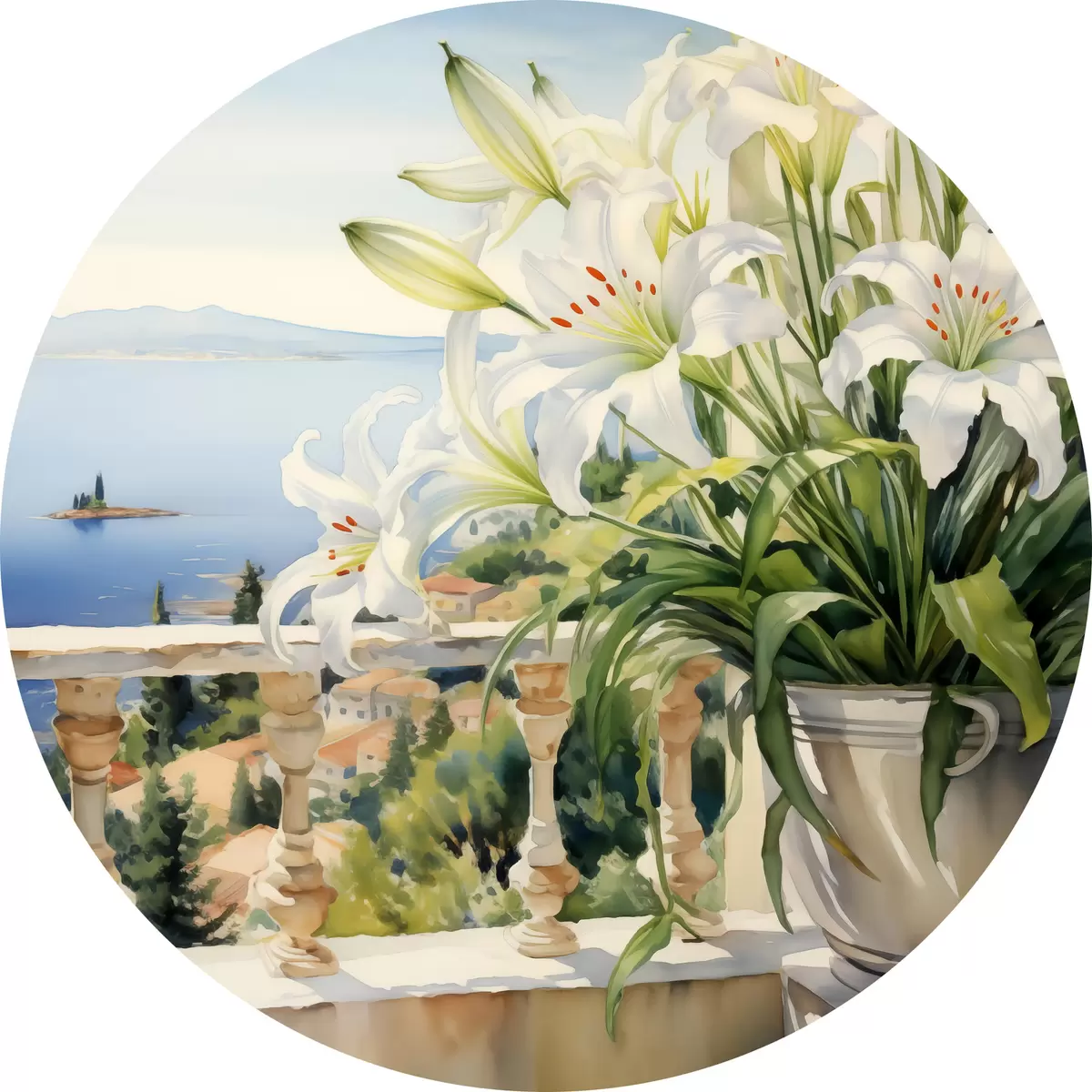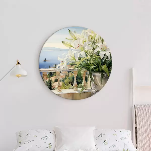 Runde Gemälde Weiße Lilien in einem Topf auf einem Balkon vor dem Hintergrund der Bucht Aquarell r39932