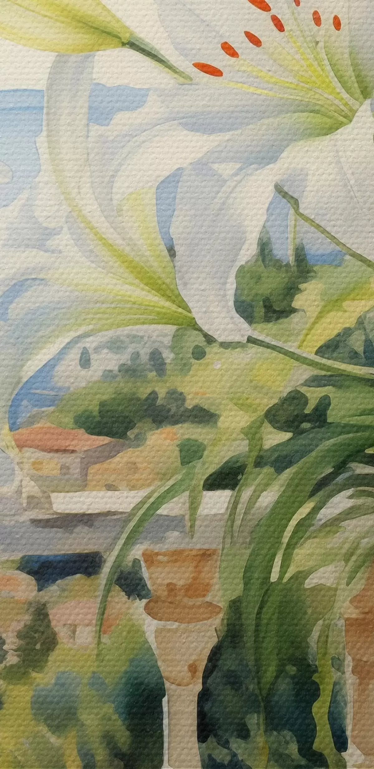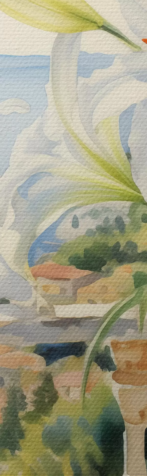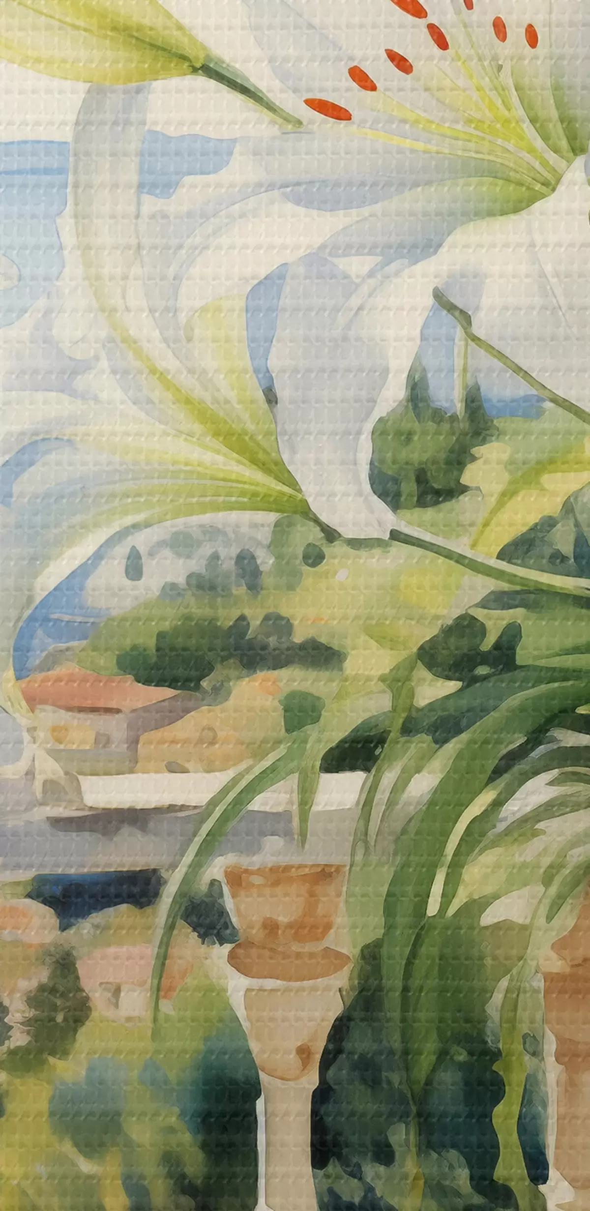 Bild Weiße Lilien in einem Topf auf einem Balkon vor dem Hintergrund der Bucht Aquarell Nr r39932