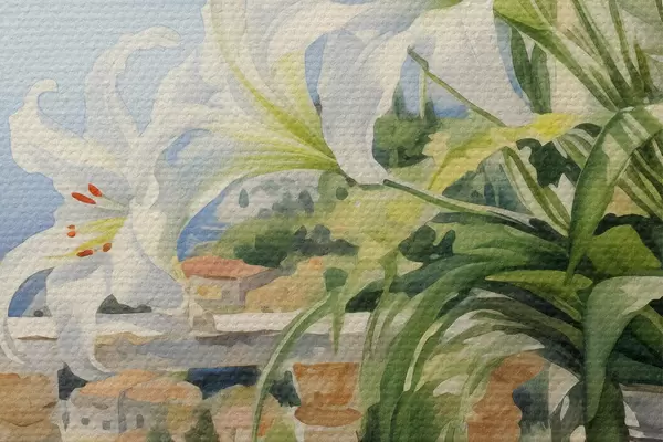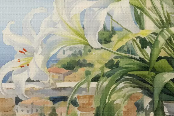 Bild Weiße Lilien in einem Topf auf einem Balkon vor dem Hintergrund der Bucht Aquarell Nr r39932
