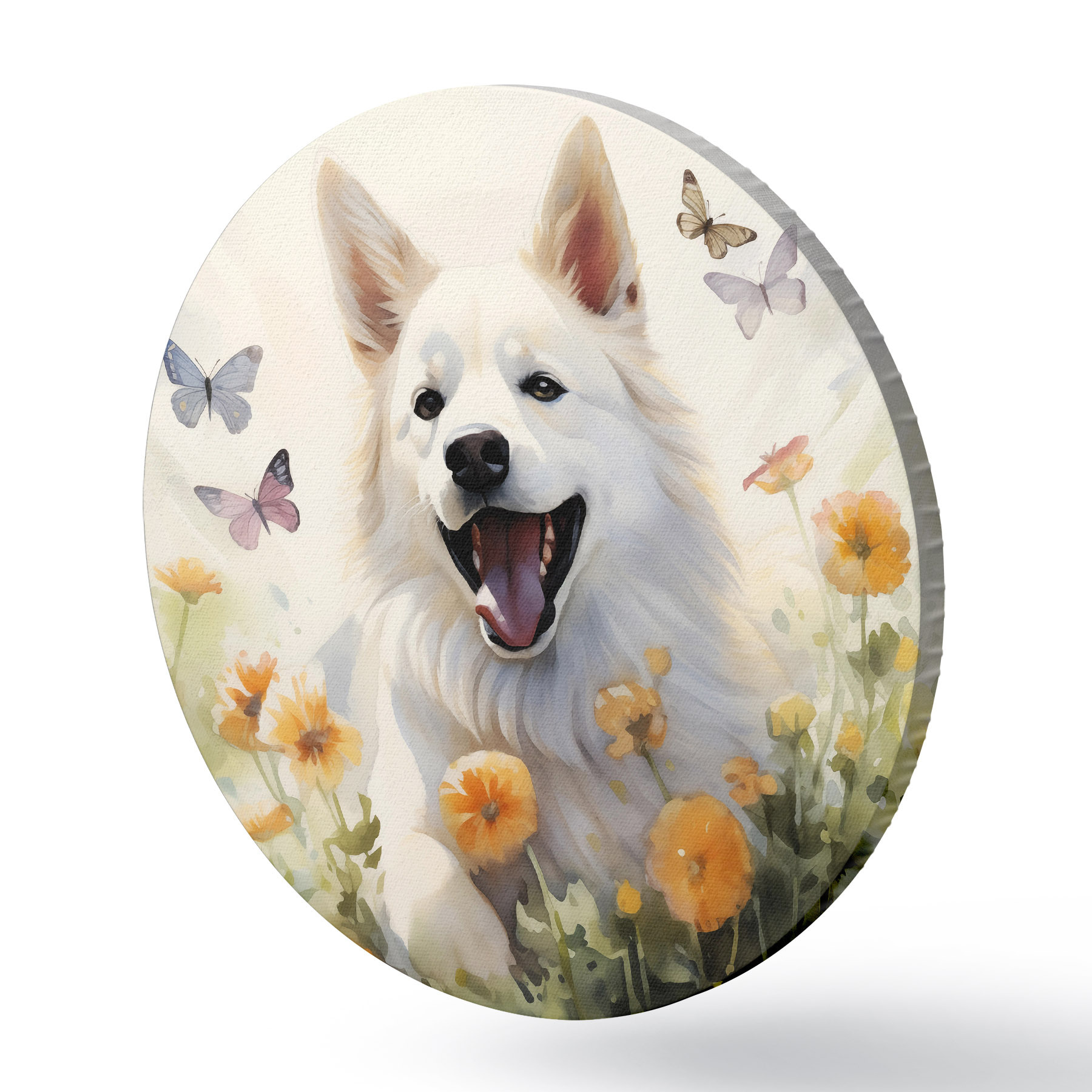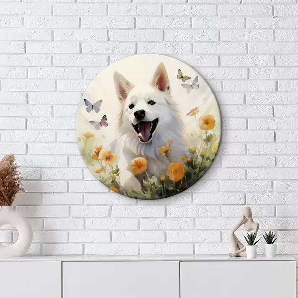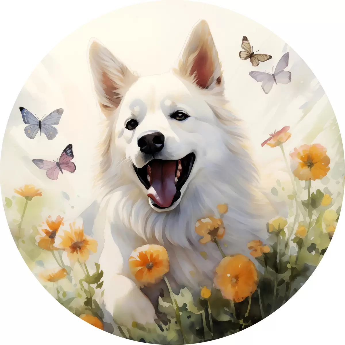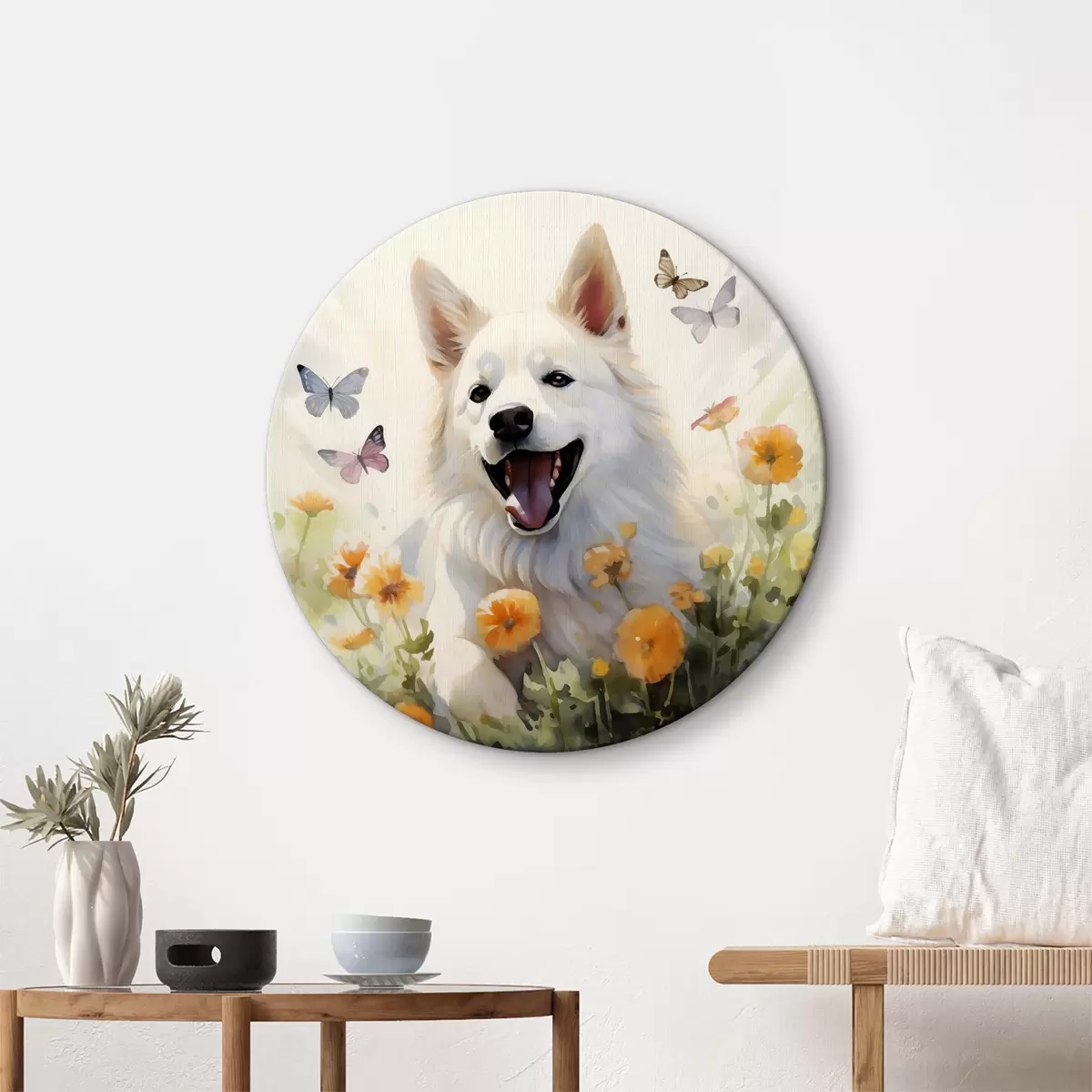Runde Gemälde Weißer Hund sitzt in Blumen, Schmetterlinge fliegen Aquarell r39936
