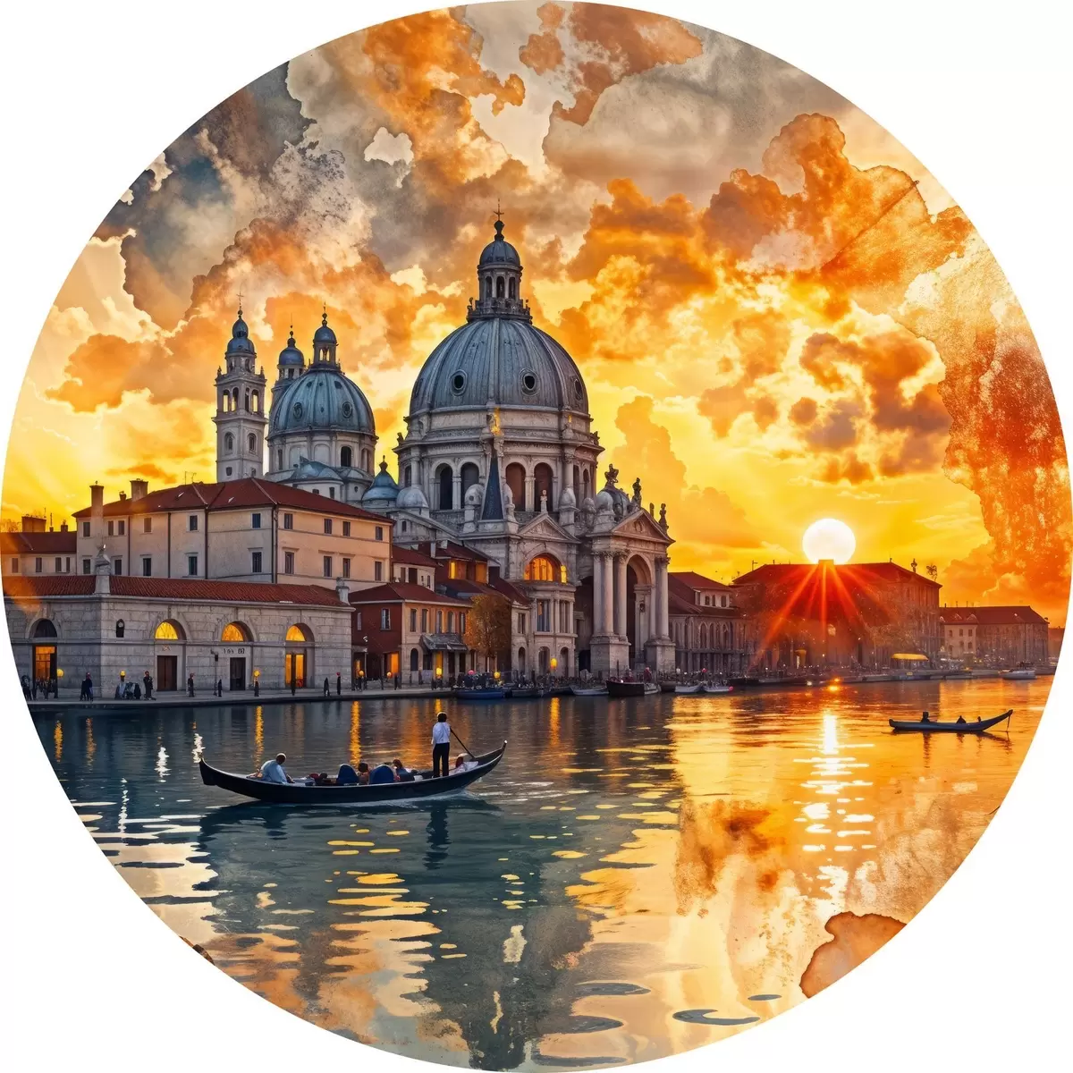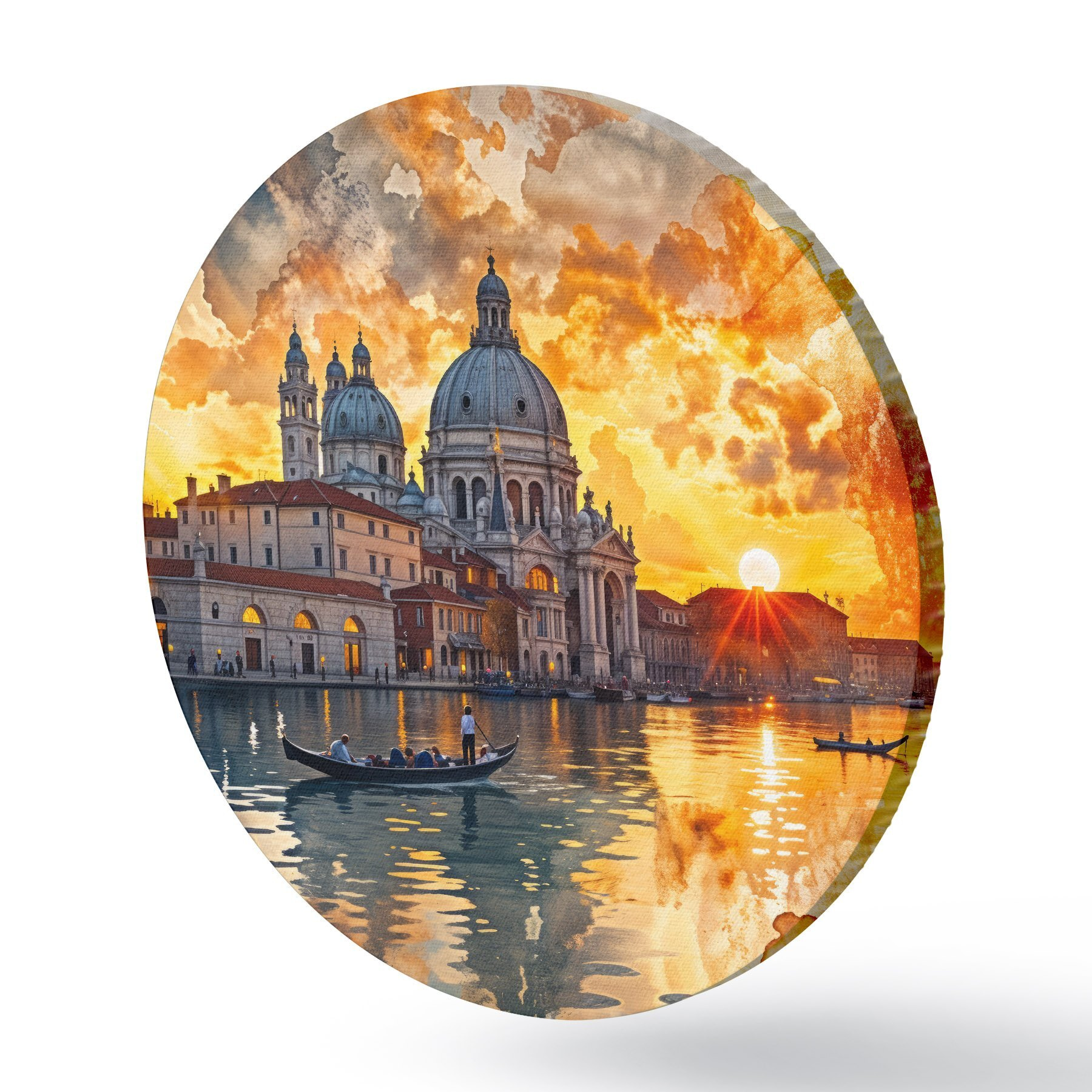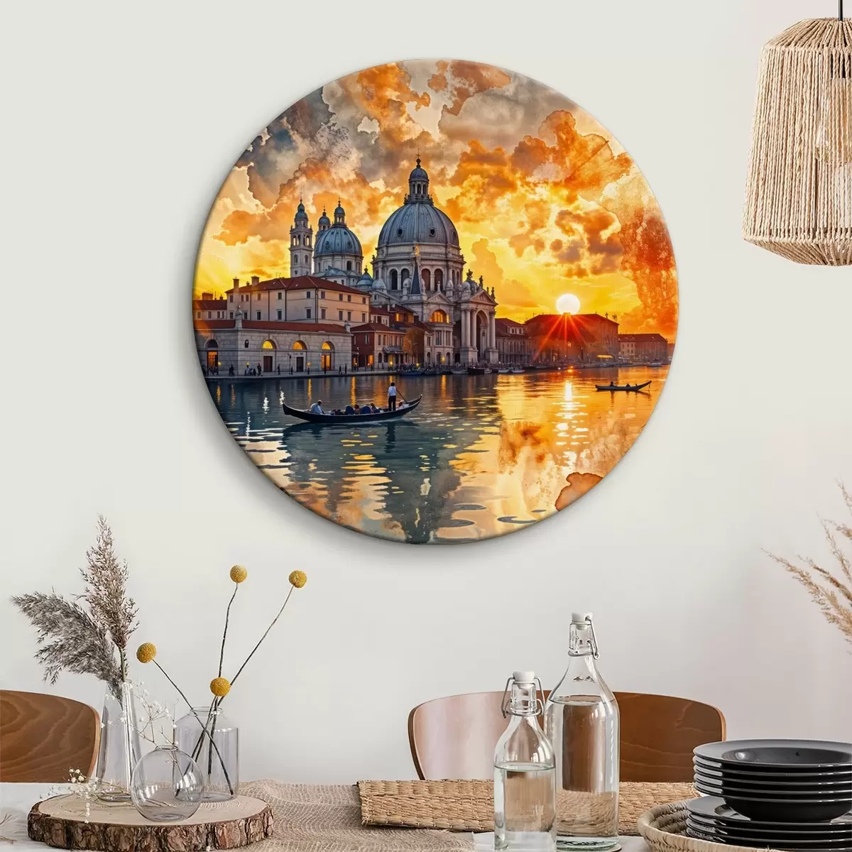 Runde Gemälde Ein farbenfroher und dramatischer Sonnenuntergang über dem Canale Grande in Venedig, Italien, Aquarellkunst r40027