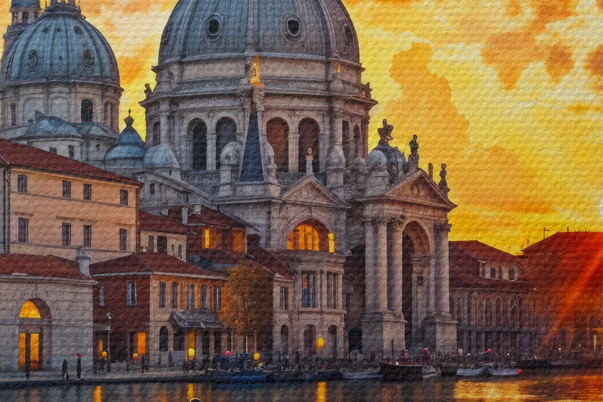 Bild Ein farbenfroher und dramatischer Sonnenuntergang über dem Canale Grande in Venedig, Italien, Aquarellkunst Nr r40027