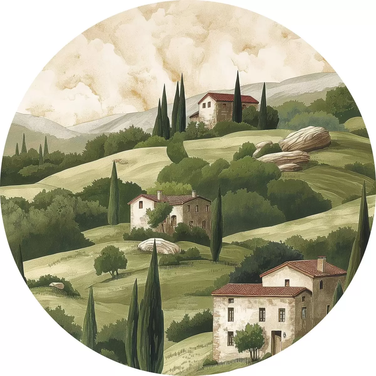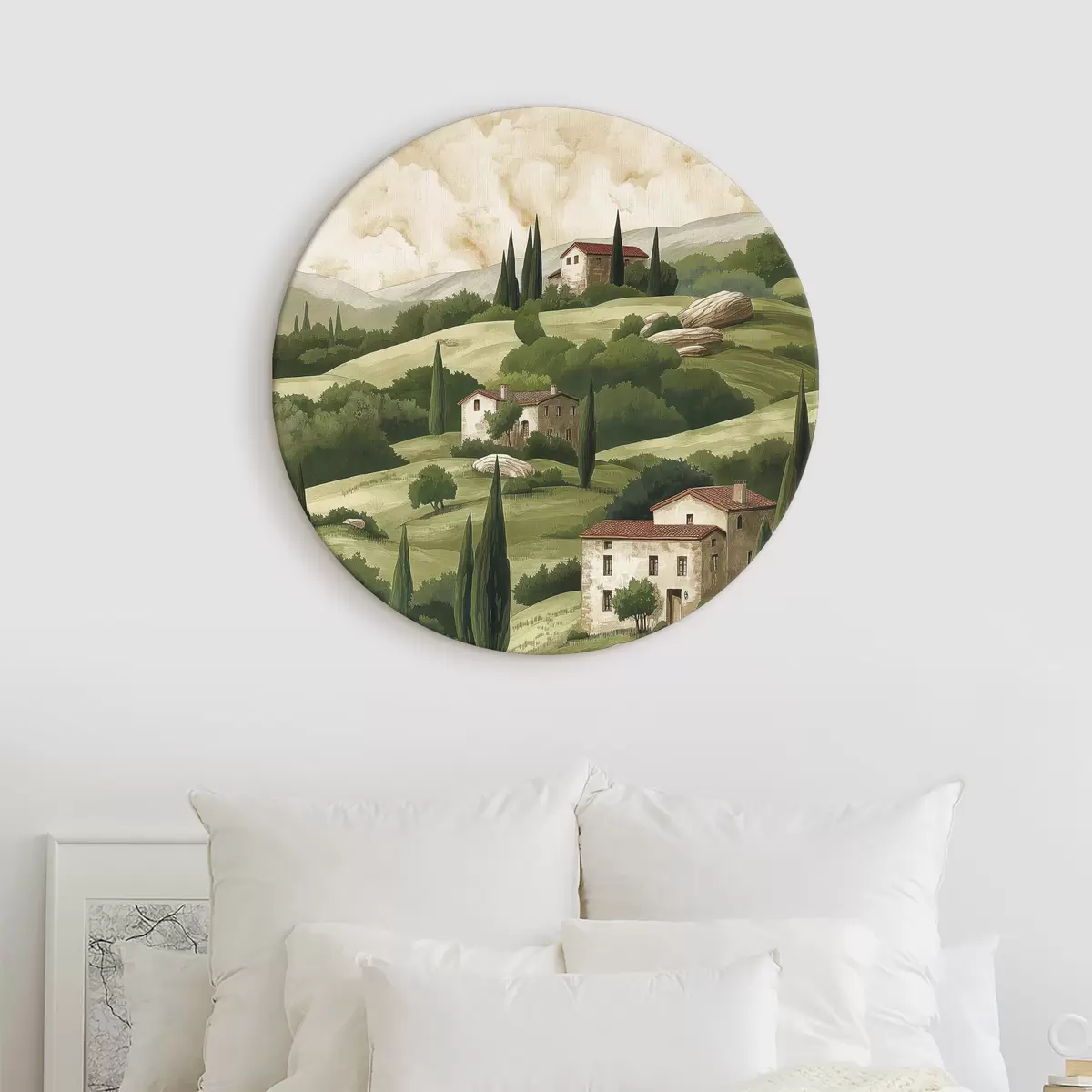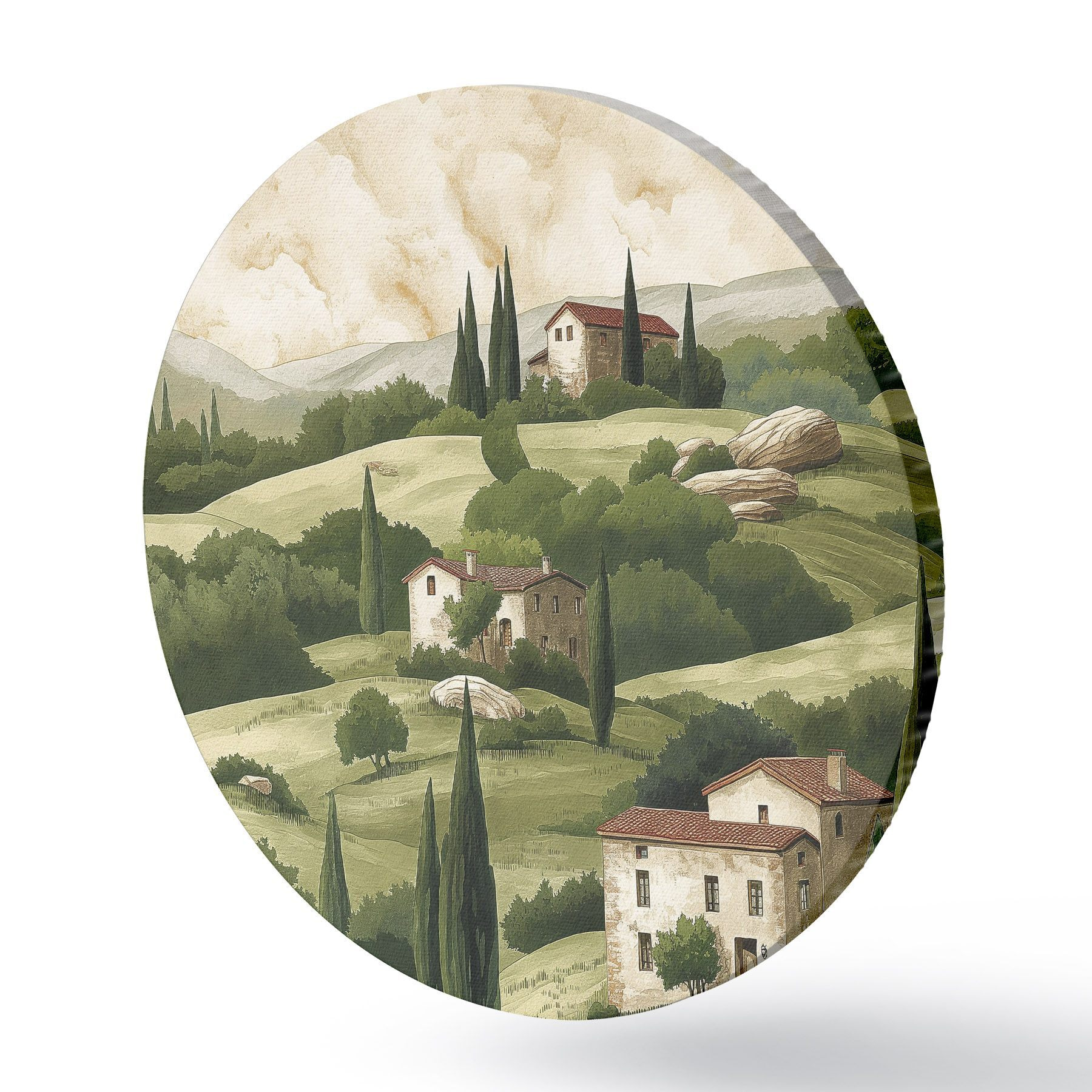 Runde Gemälde Landschaft mit Vintage-Häusern, pastellgrüne Farben, Acrylzeichnung, rustikal r40080