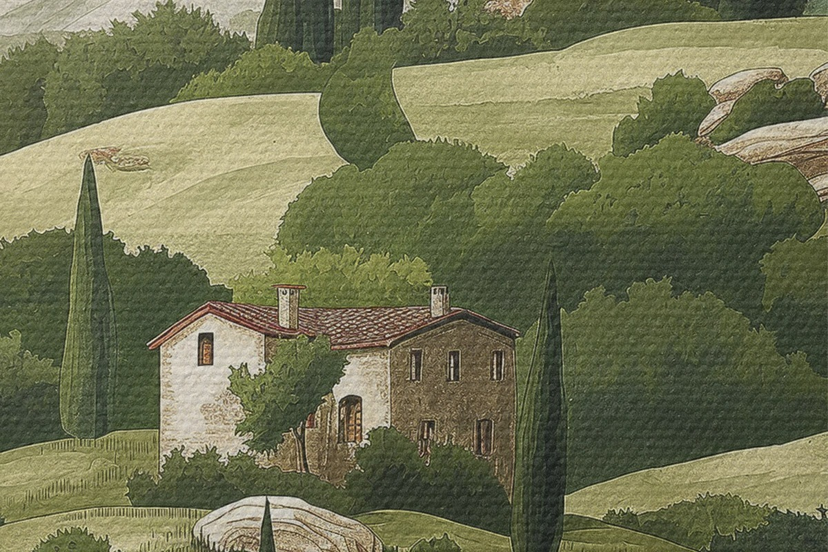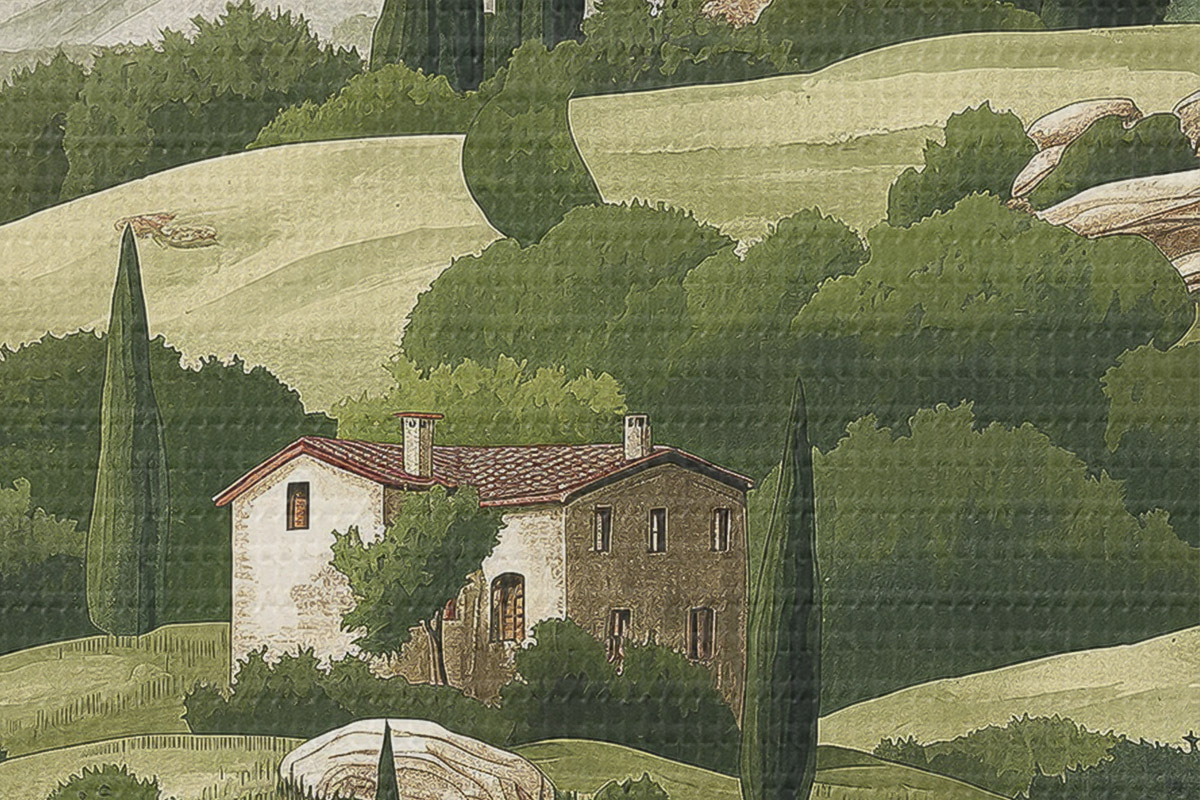 Bild Landschaft mit Vintage-Häusern, pastellgrüne Farben, Acrylzeichnung, rustikal Nr r40080