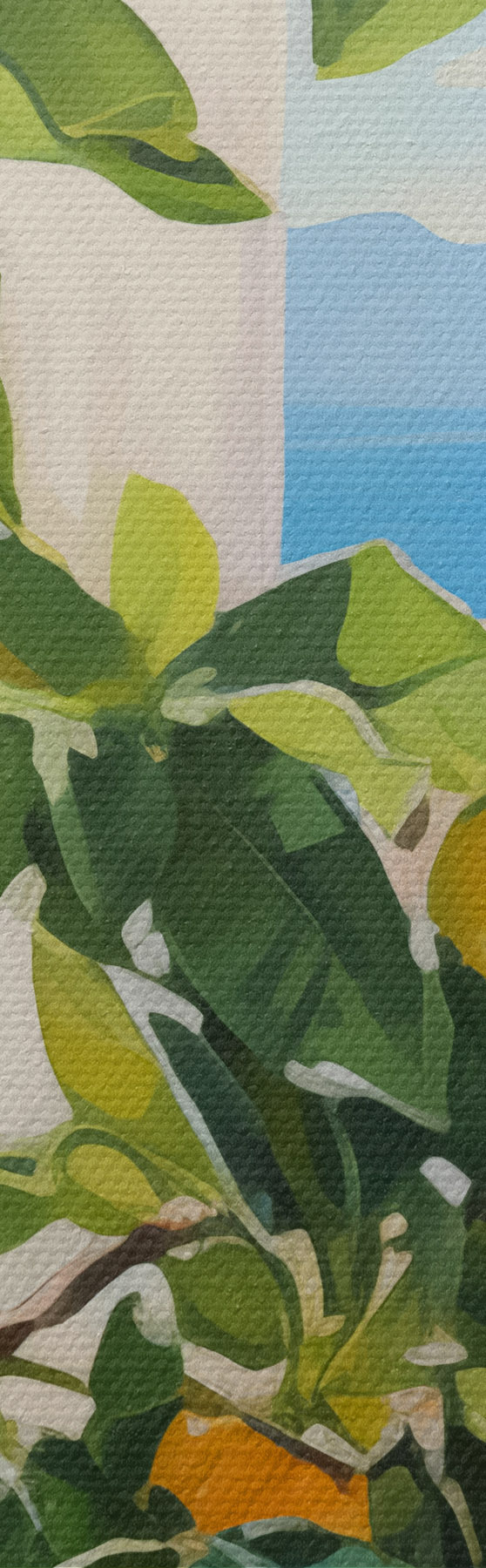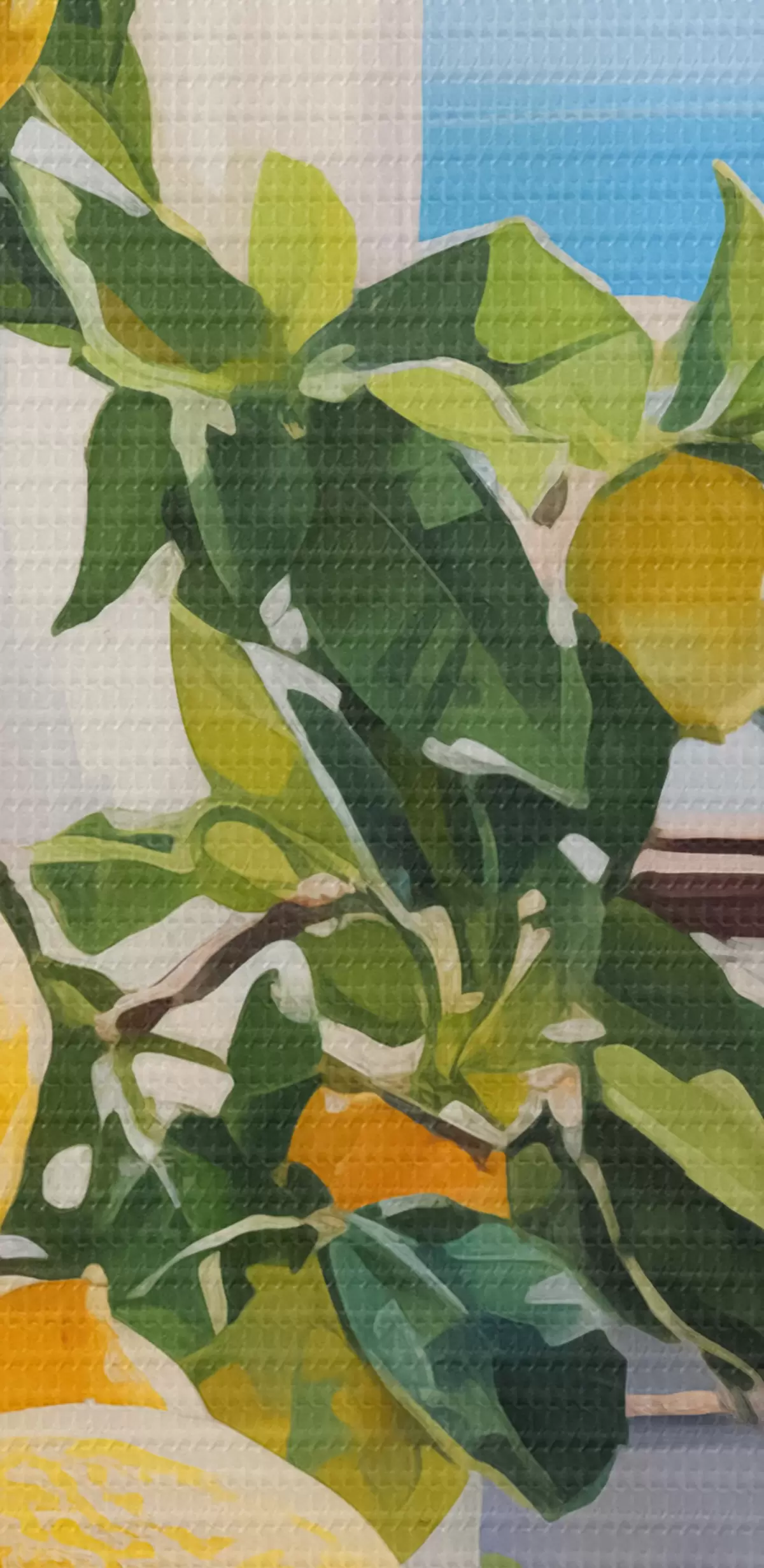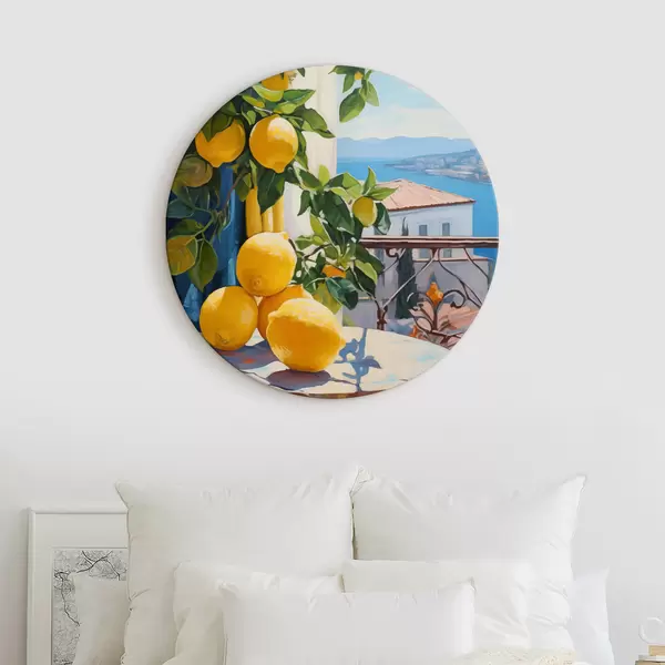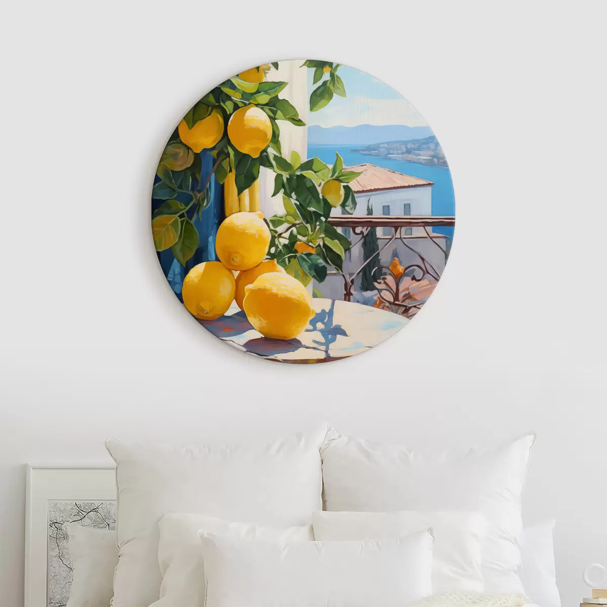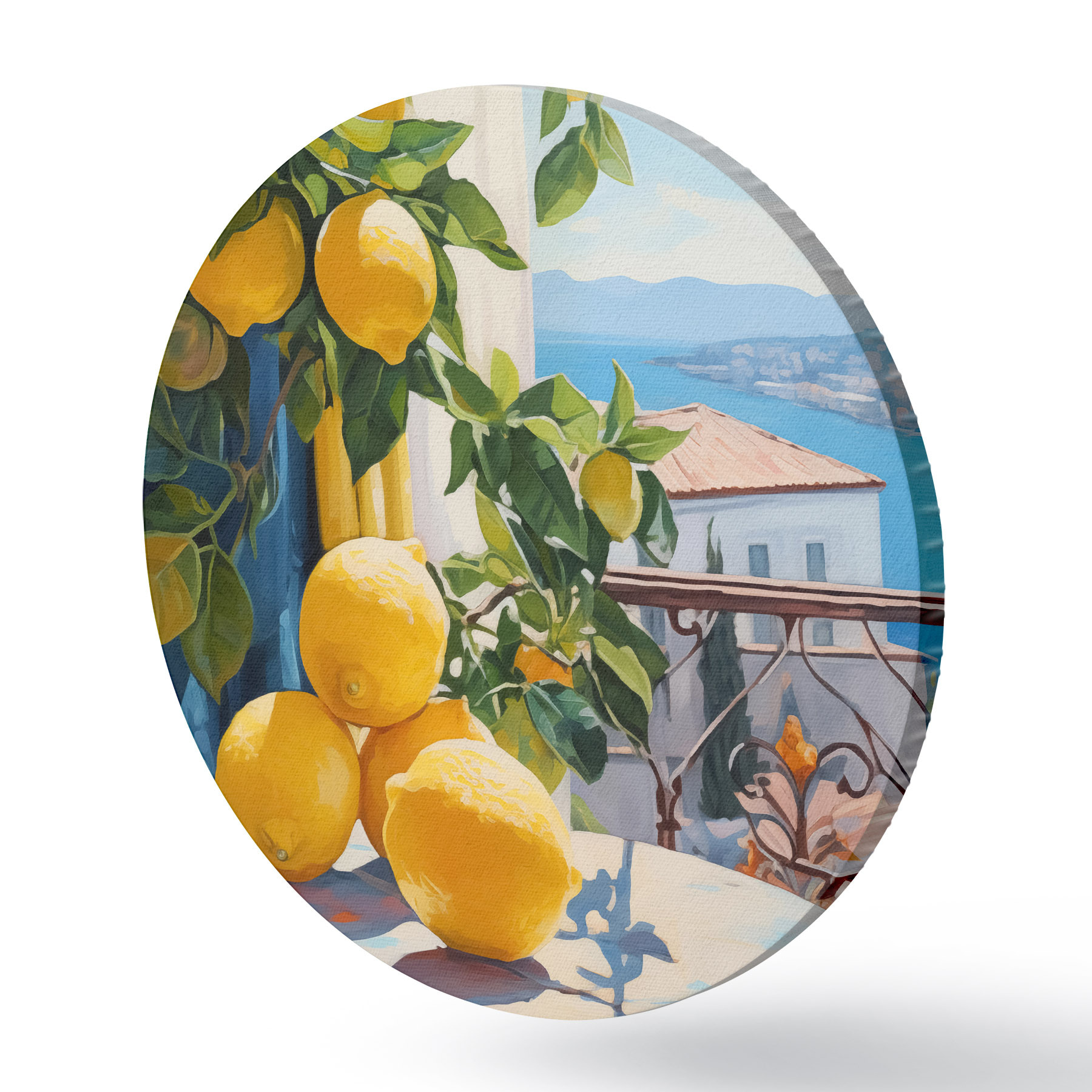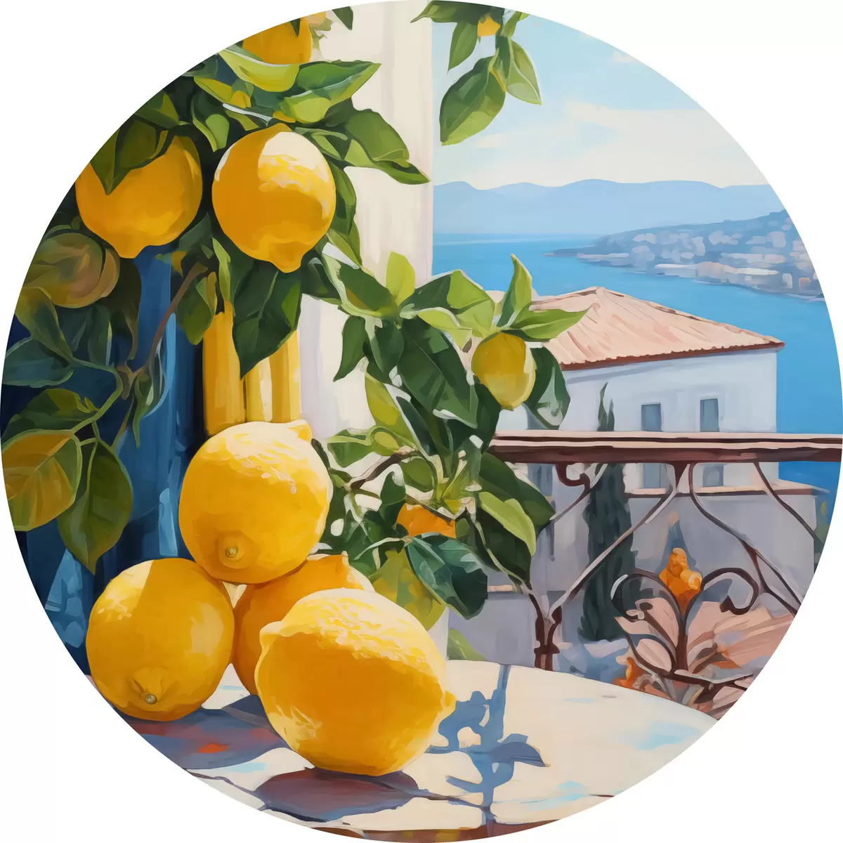 Runde Gemälde Zitronen am Baum und Tisch auf dem Hotelbalkon mit Meerblick, Ölgemälde-Imitation r40091