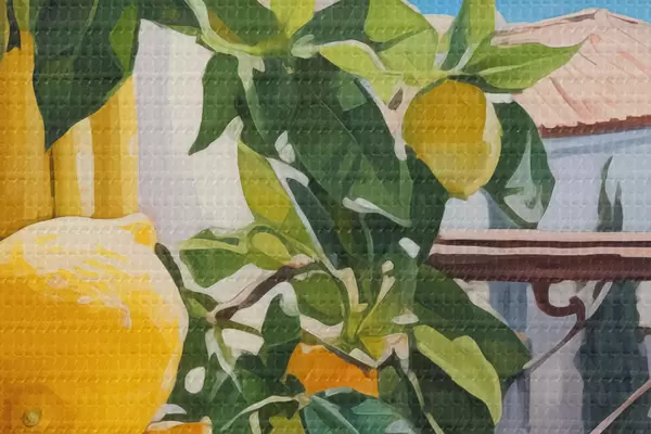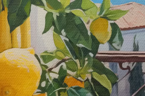 Runde Gemälde Zitronen am Baum und Tisch auf dem Hotelbalkon mit Meerblick, Ölgemälde-Imitation r40091