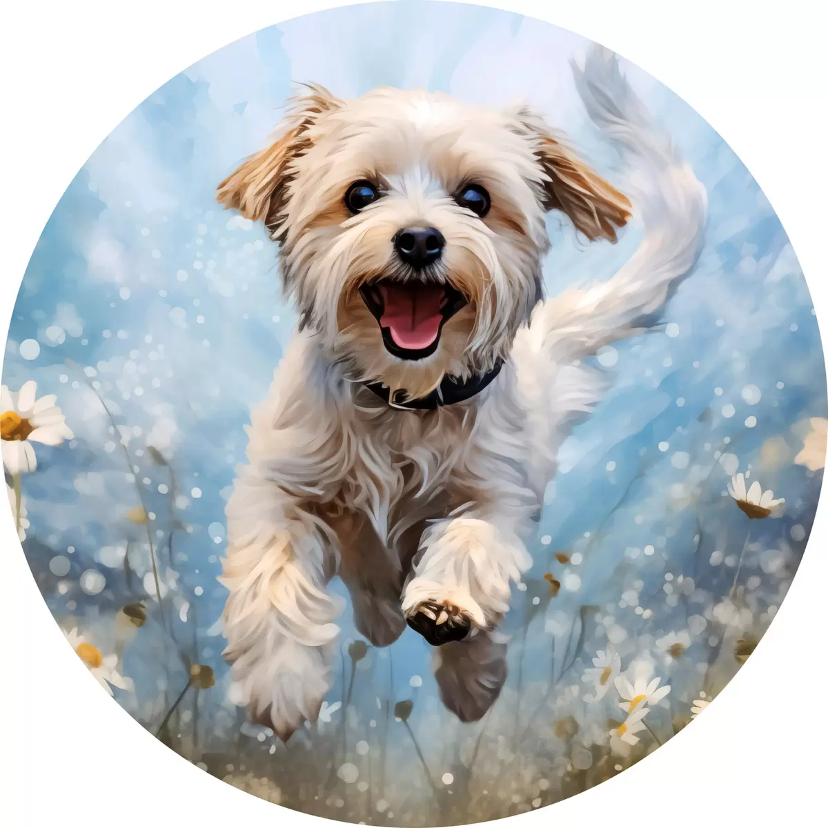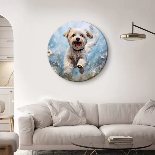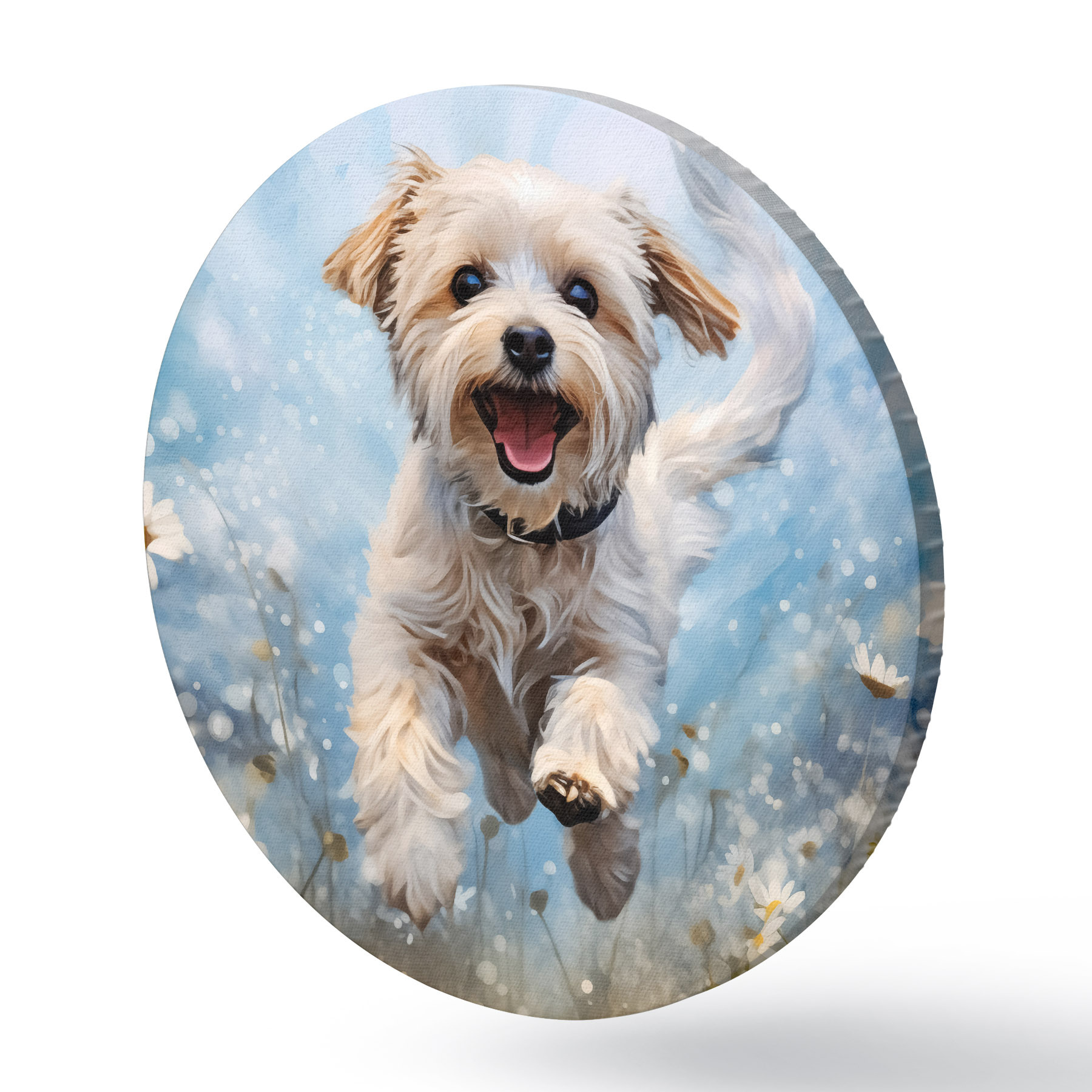 Runde Gemälde Kleiner weißer Hund springt zwischen Gänseblümchen auf blauem Hintergrund Aquarell r40092