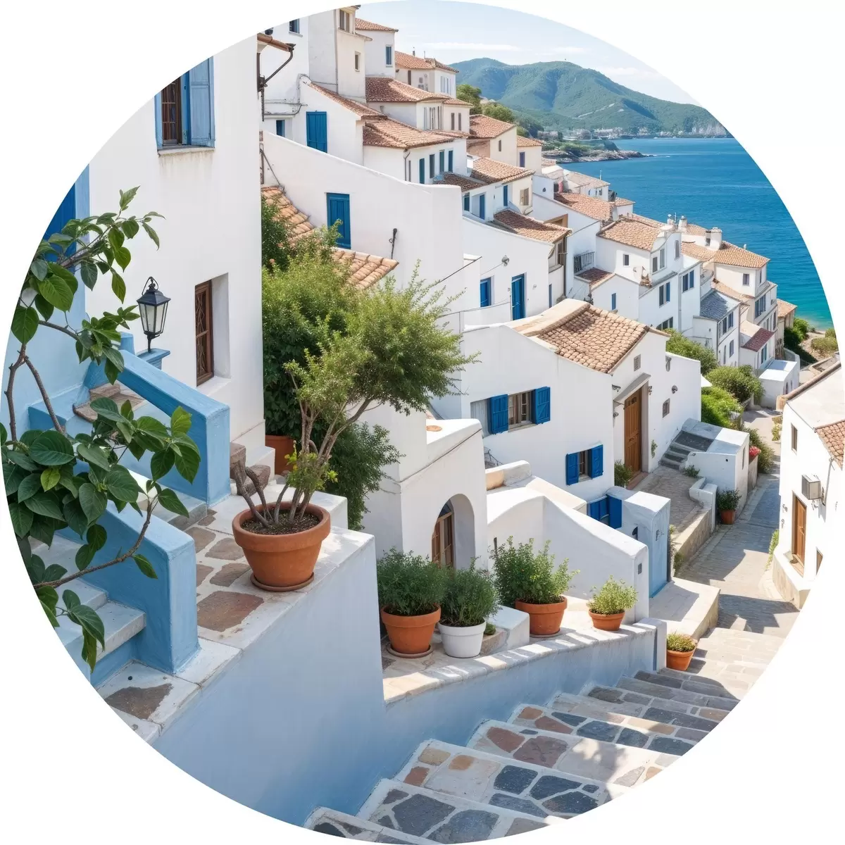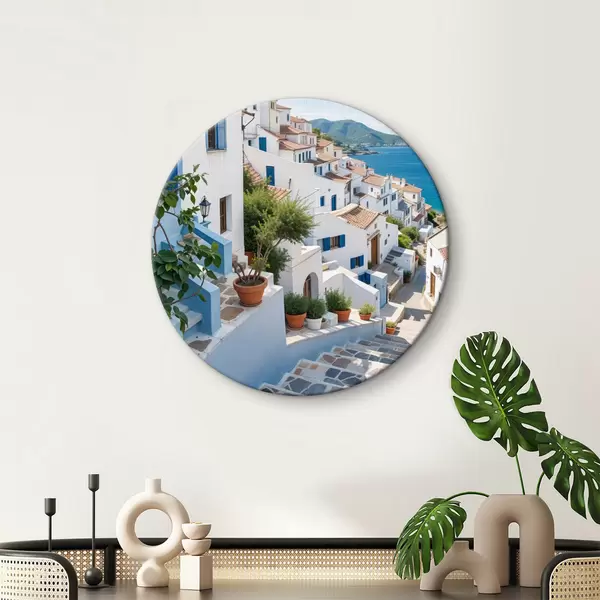 Runde Gemälde Eine malerische Küstenstadt mit weißen Gebäuden, blauen Fenstern und Topfpflanzen entlang der engen Gassen r40148