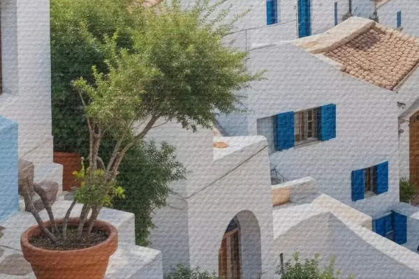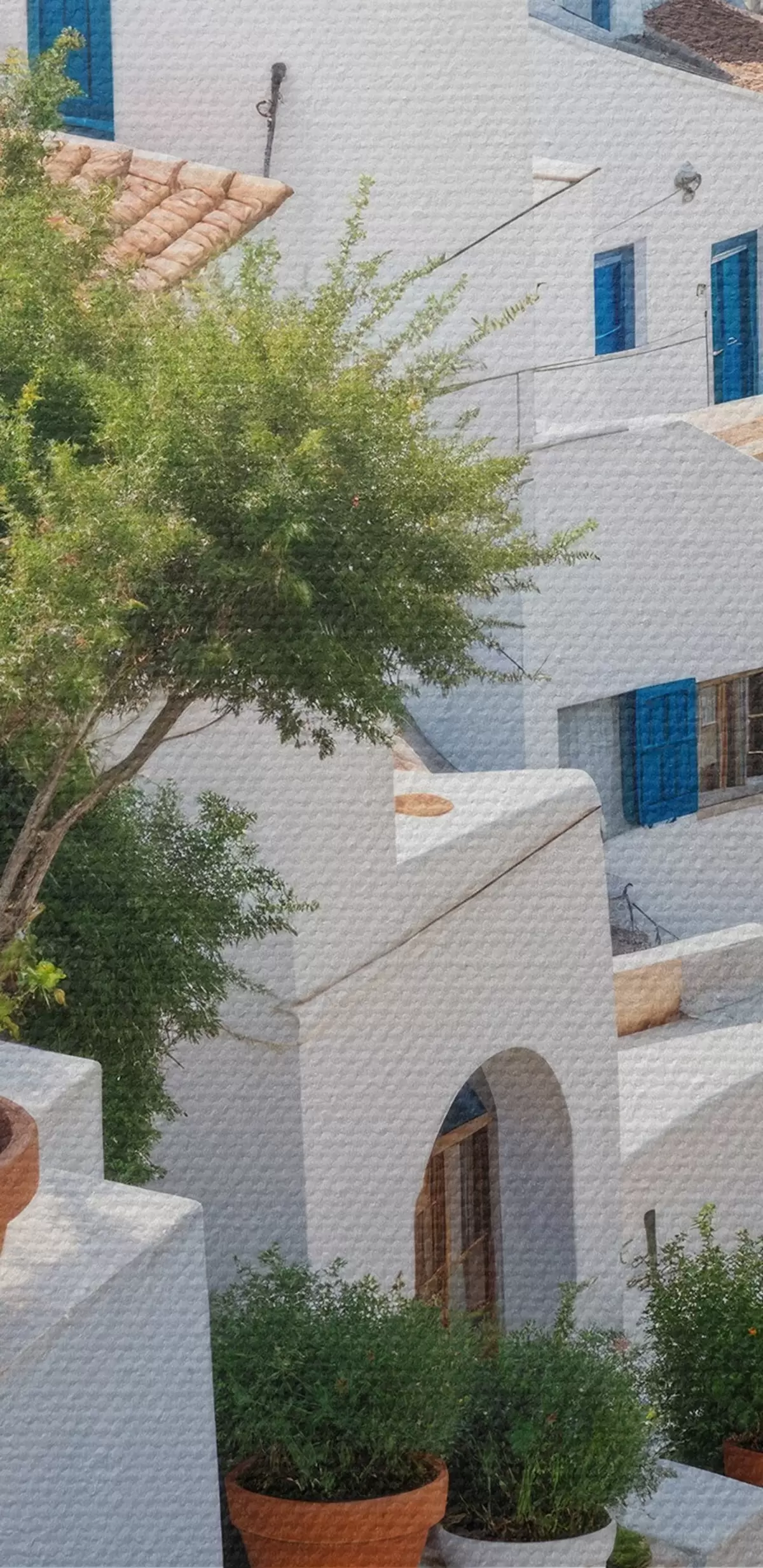 Bild Eine malerische Küstenstadt mit weißen Gebäuden, blauen Fenstern und Topfpflanzen entlang der engen Gassen Nr r40148
