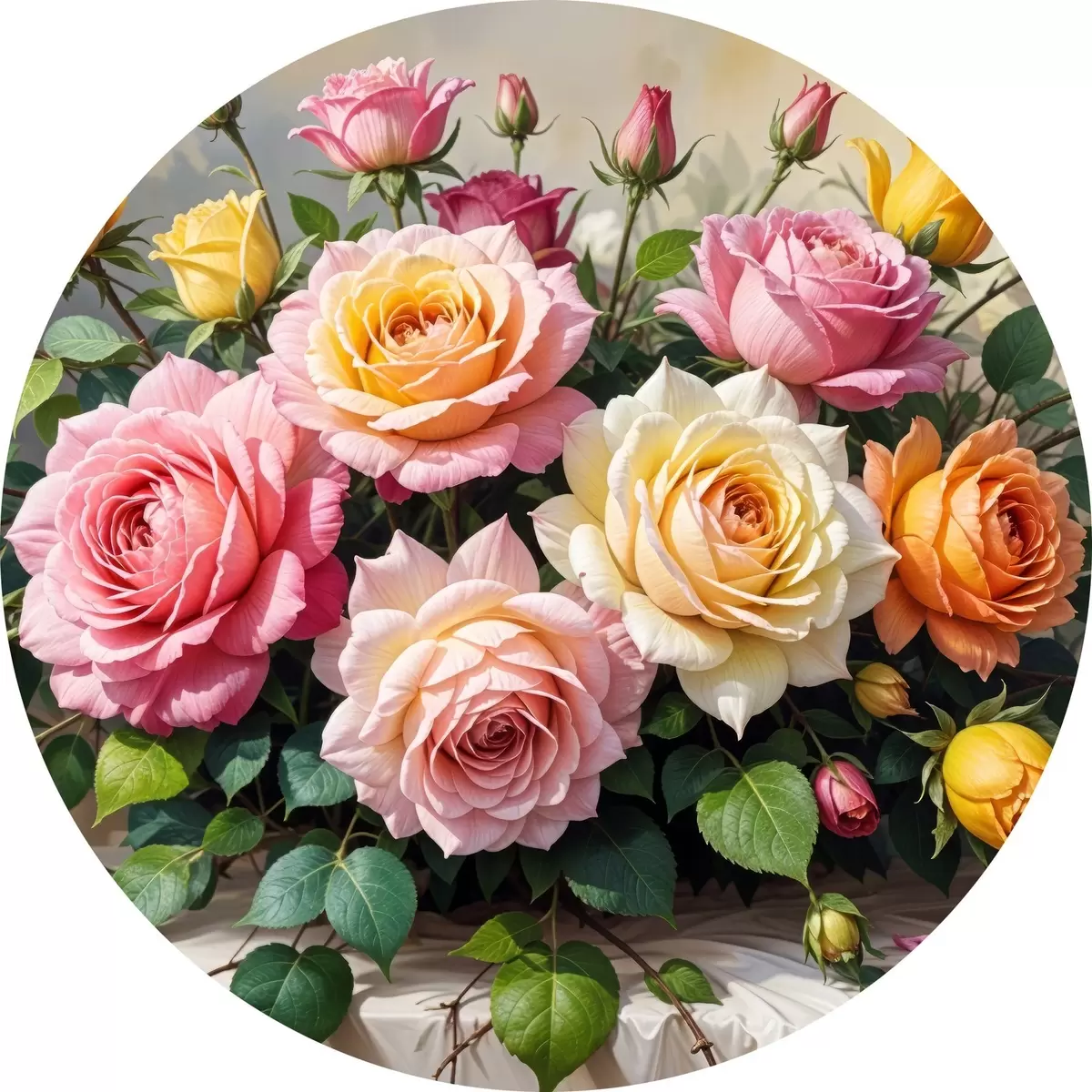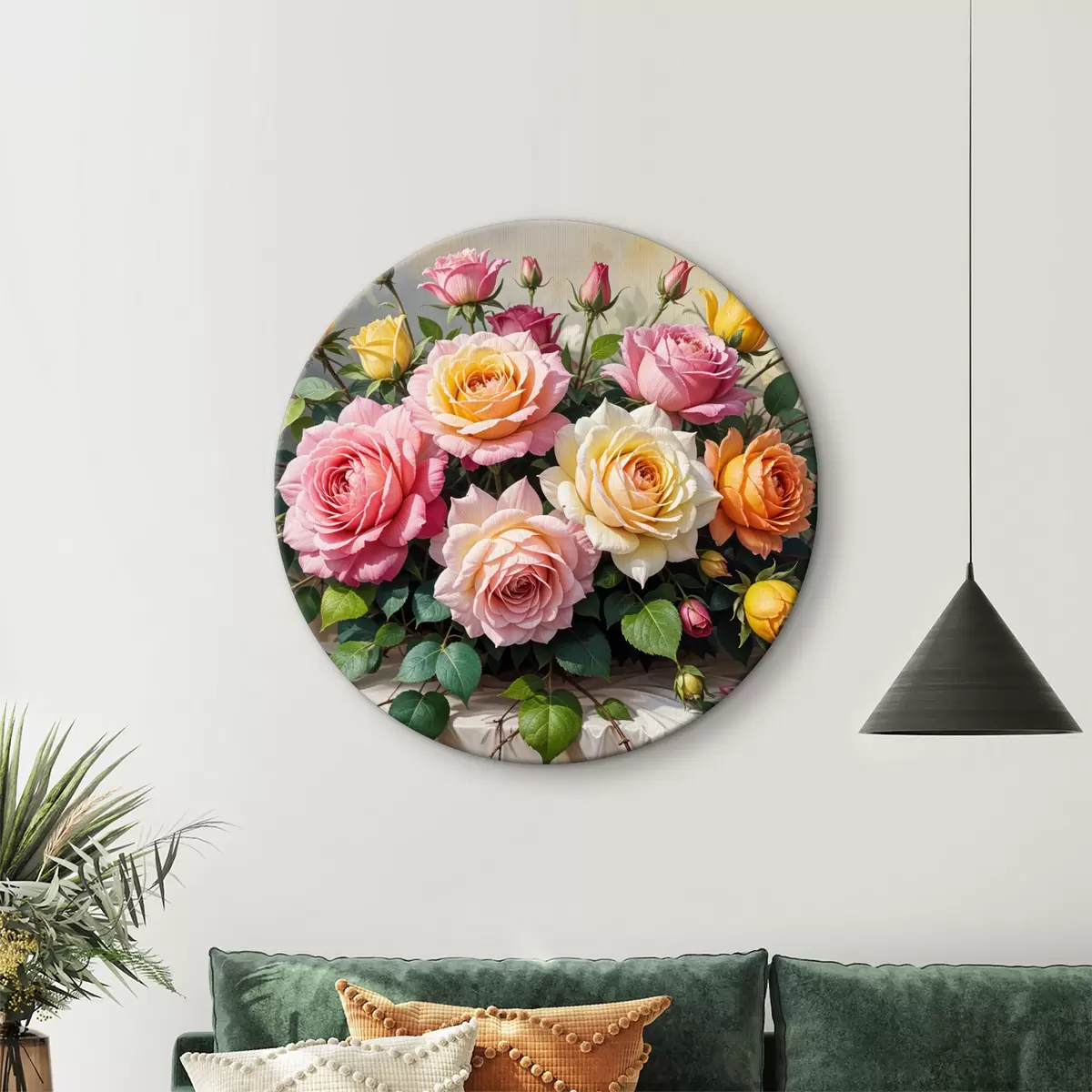 Runde Gemälde Ein Strauß bunter Rosen in verschiedenen Rosa-, Gelb- und Orangetönen, arrangiert mit grünen Blättern r40149