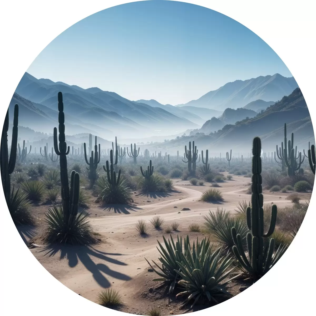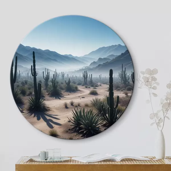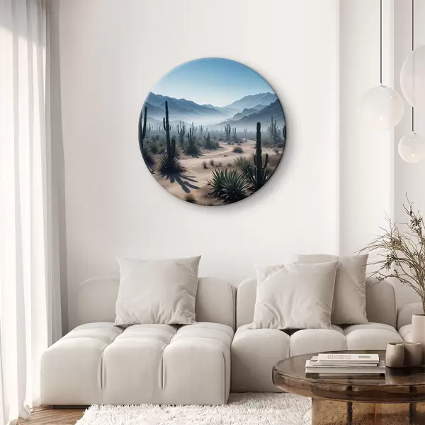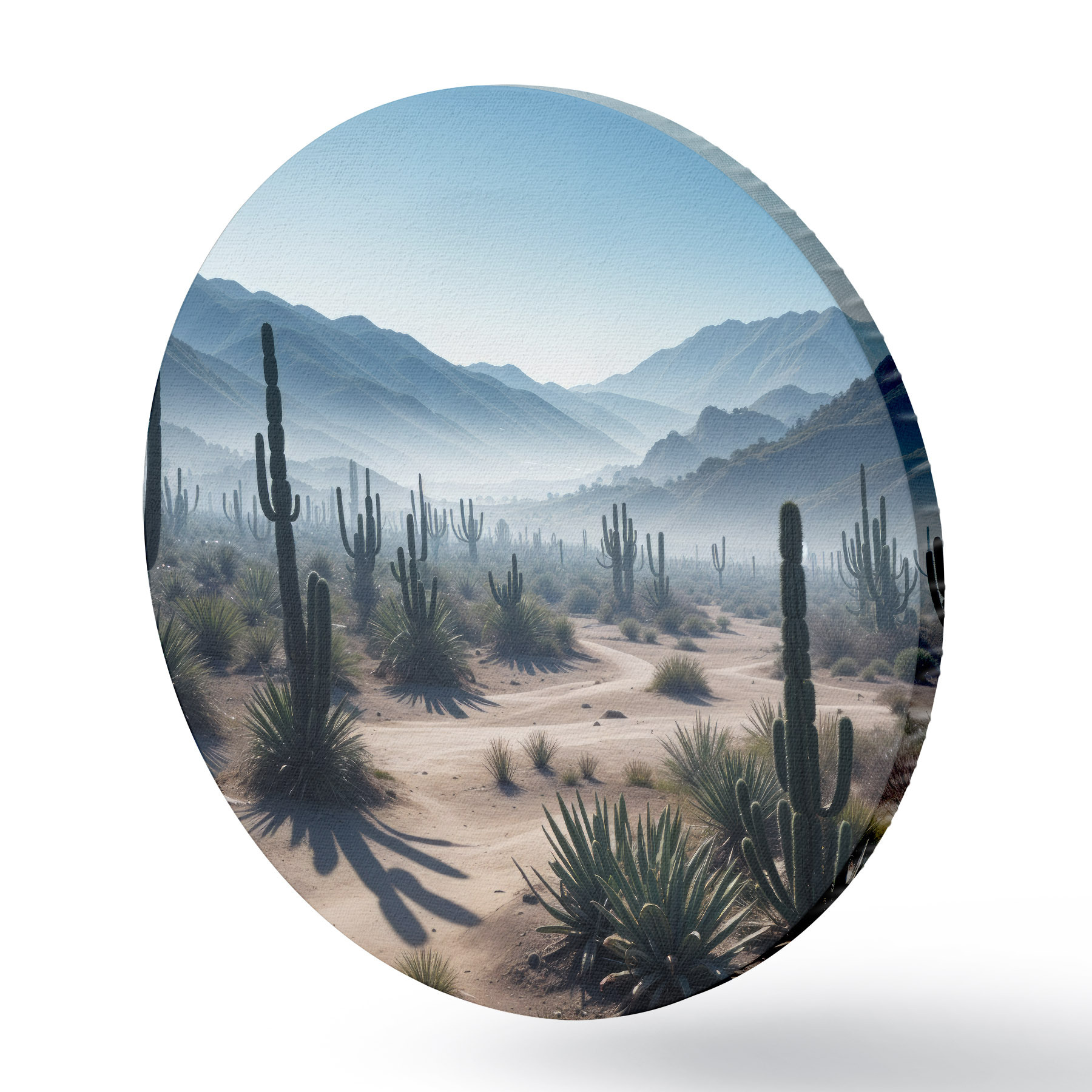 Runde Gemälde Eine Wüstenlandschaft mit hohen Kakteen und Yucca-Pflanzen im Vordergrund, umgeben von dunstigen Bergen r40153