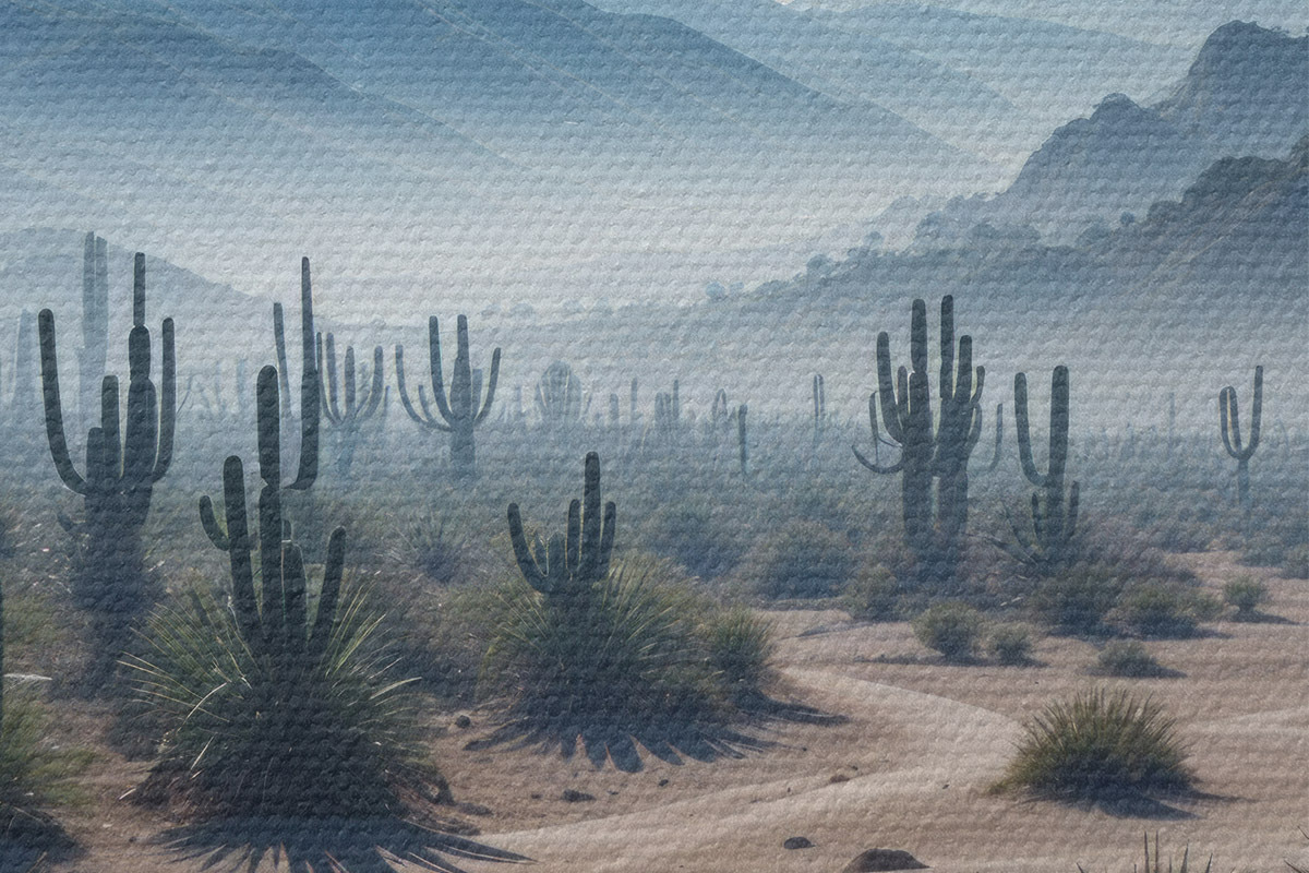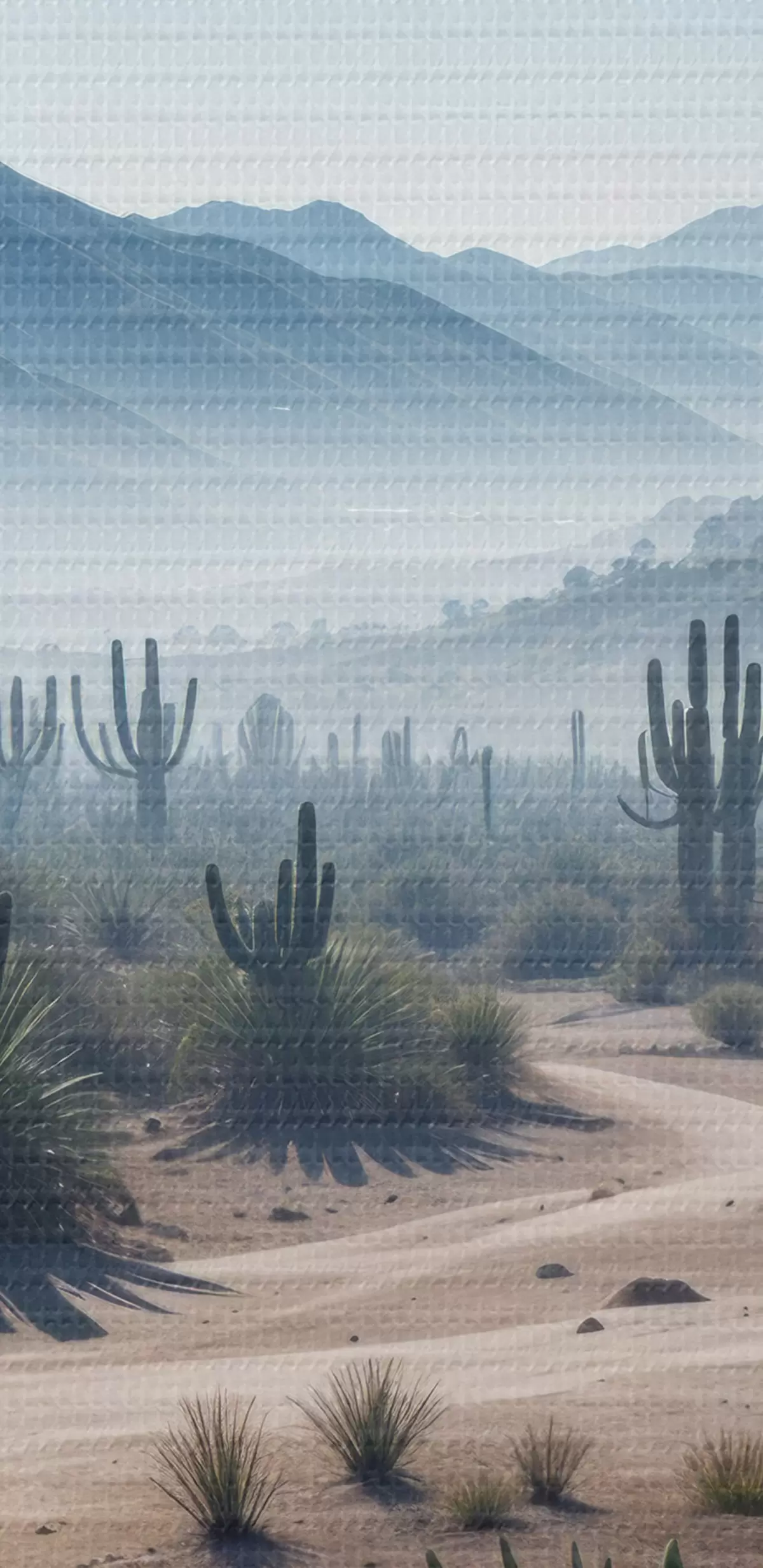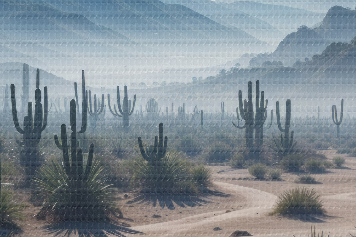 Bild Eine Wüstenlandschaft mit hohen Kakteen und Yucca-Pflanzen im Vordergrund, umgeben von dunstigen Bergen Nr r40153