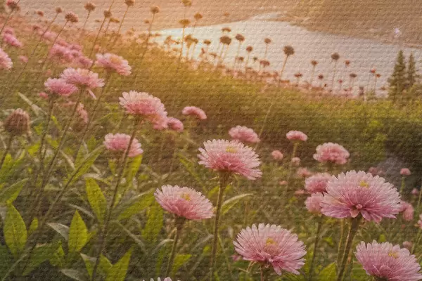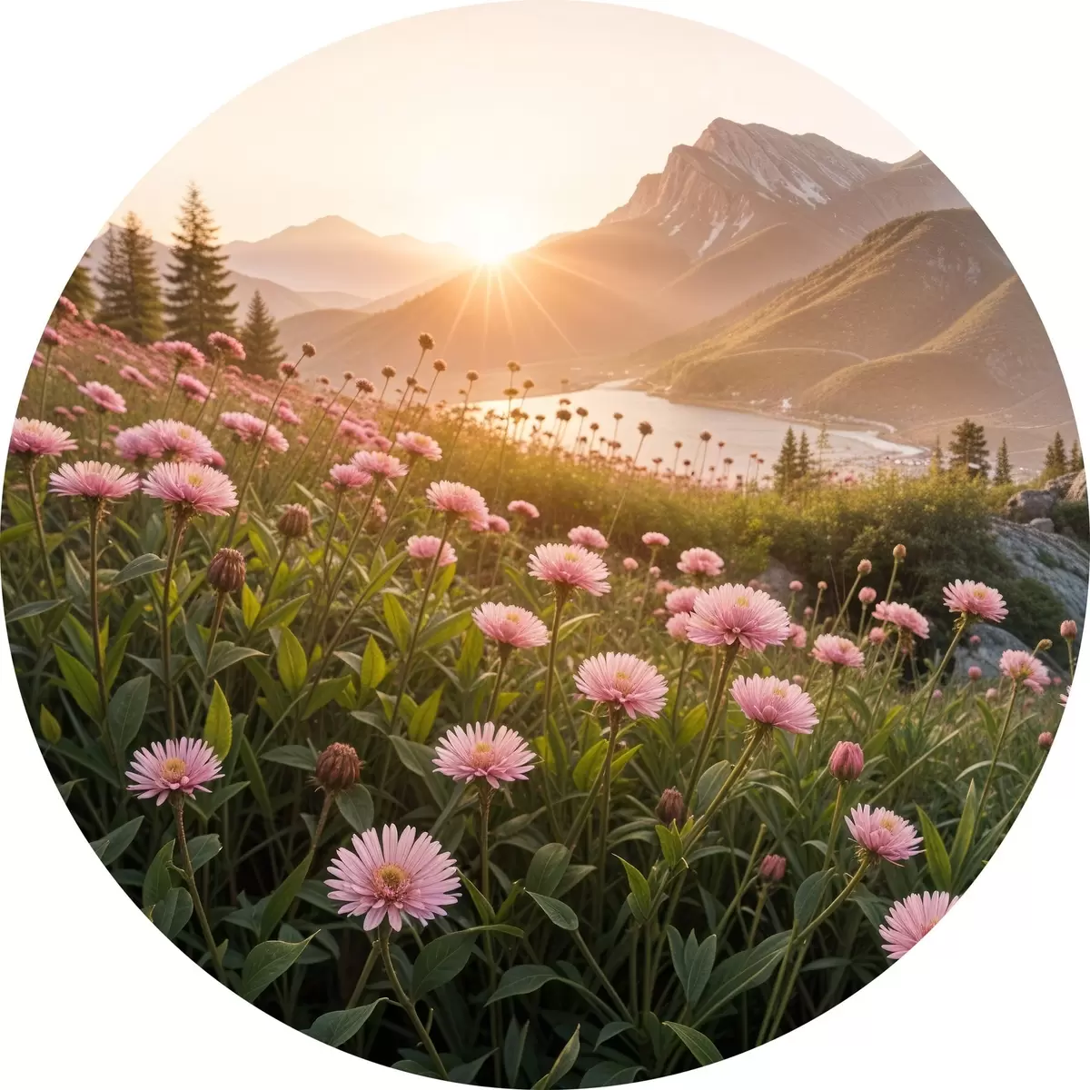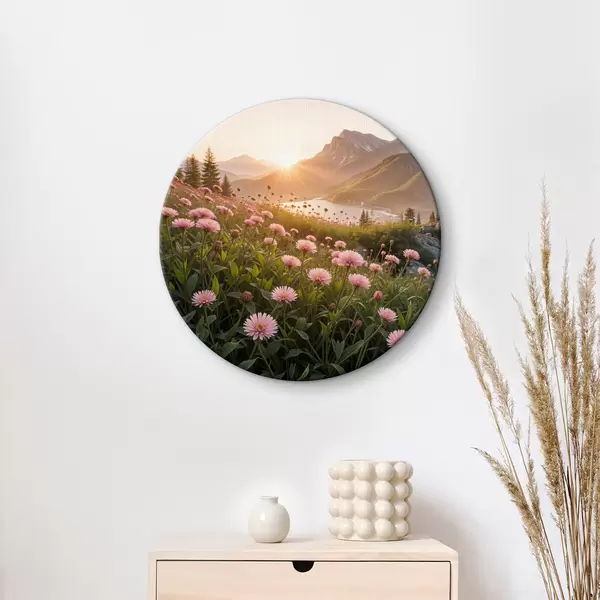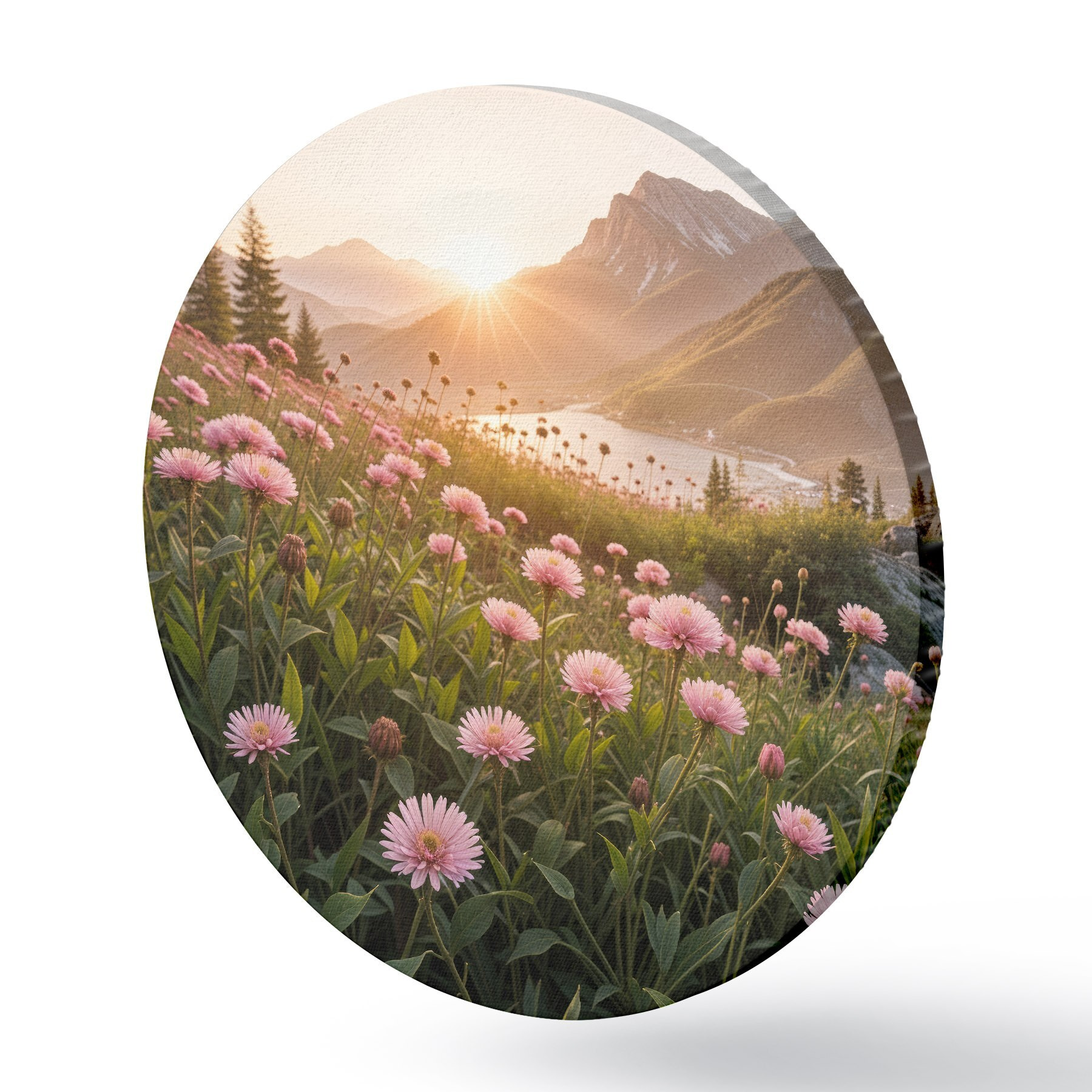 Runde Gemälde Ein Feld mit rosa Gänseblümchen-ähnlichen Blumen im Vordergrund, mit einer großen Bergkette im Hintergrund r40154