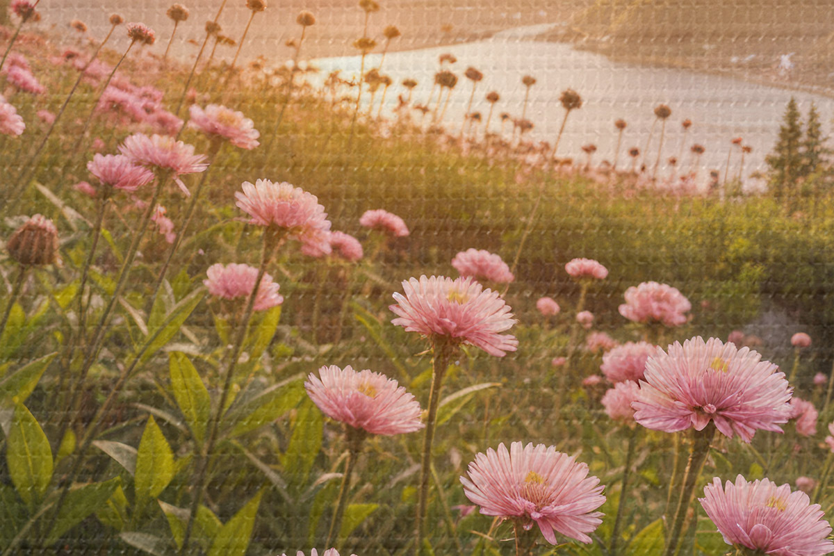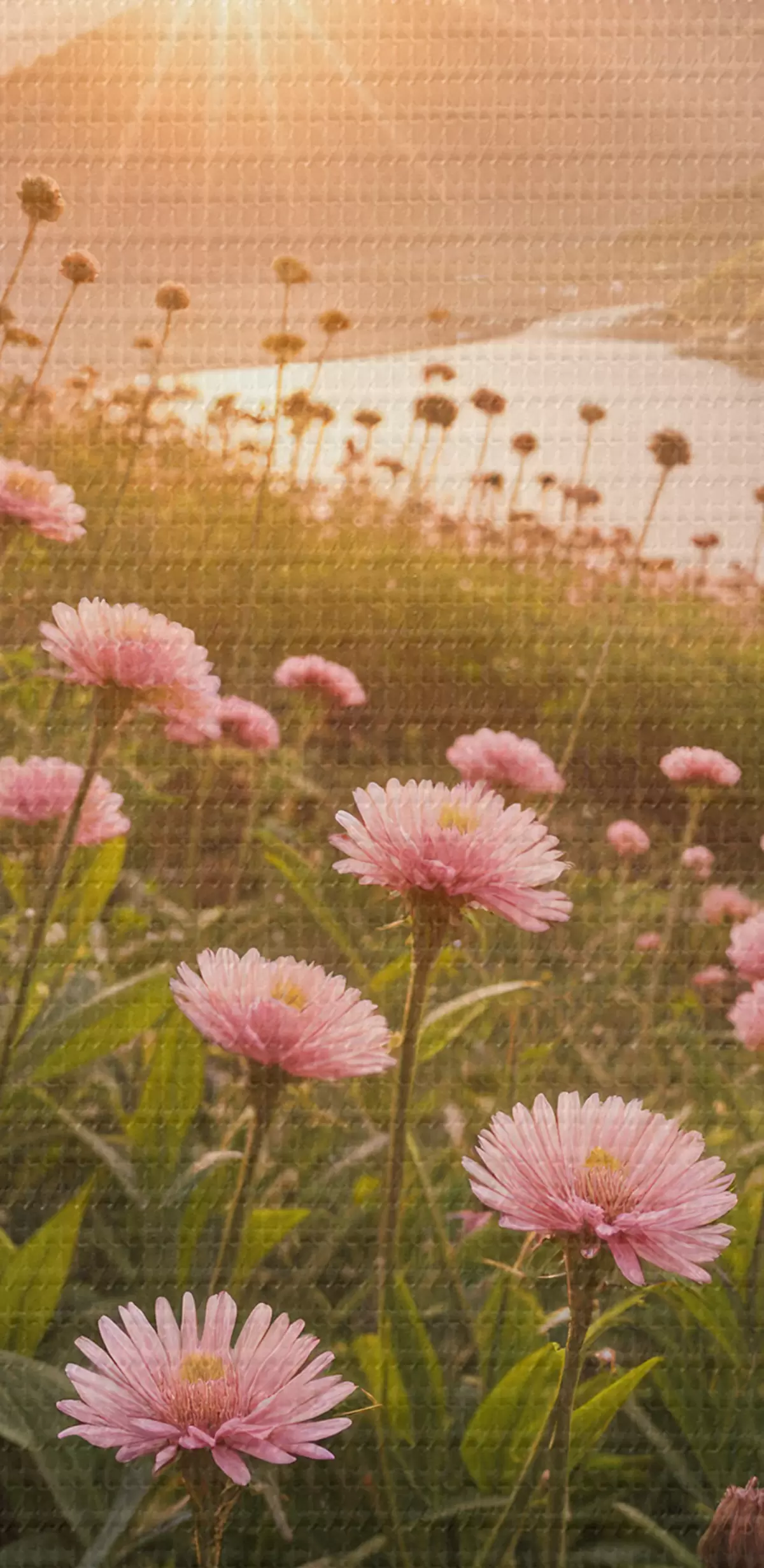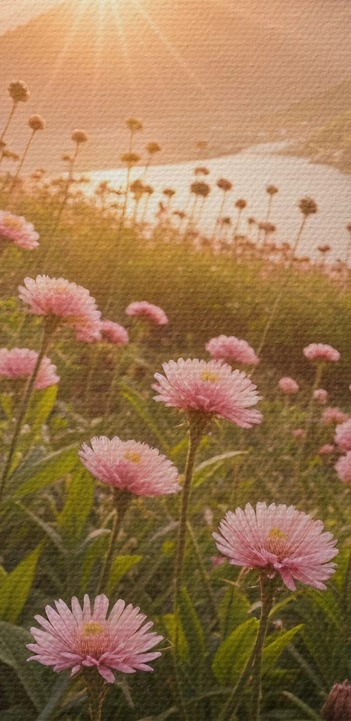 Bild Ein Feld mit rosa Gänseblümchen-ähnlichen Blumen im Vordergrund, mit einer großen Bergkette im Hintergrund Nr r40154